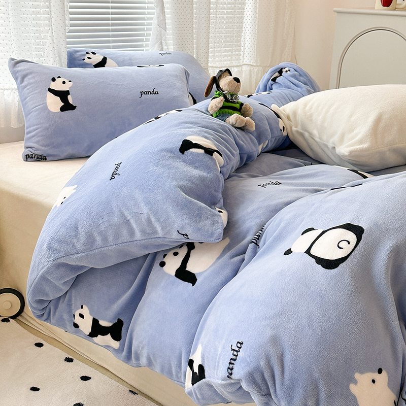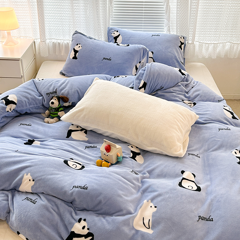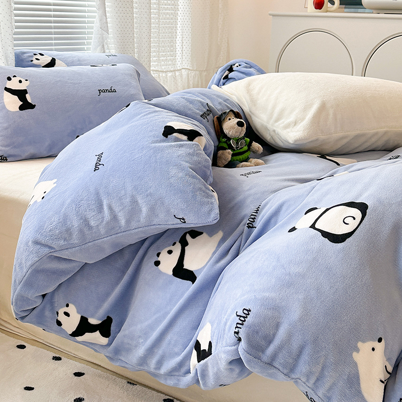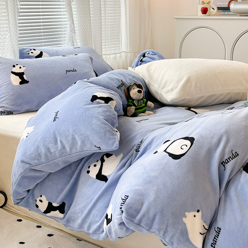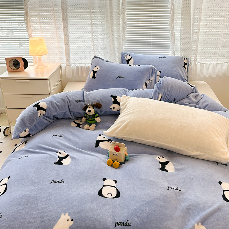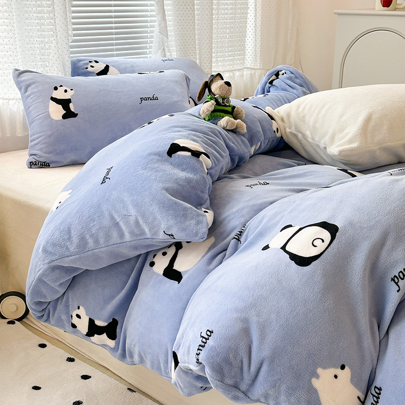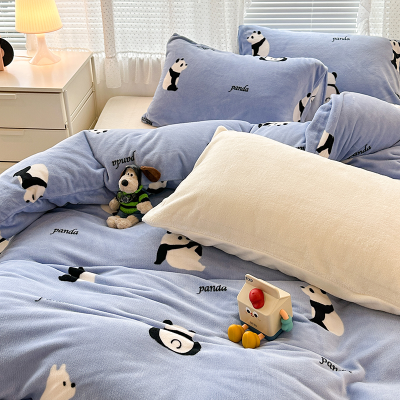商品名称:昔可家纺 2023新款高克重印花牛奶绒卡通系列四件套 蓝底熊猫