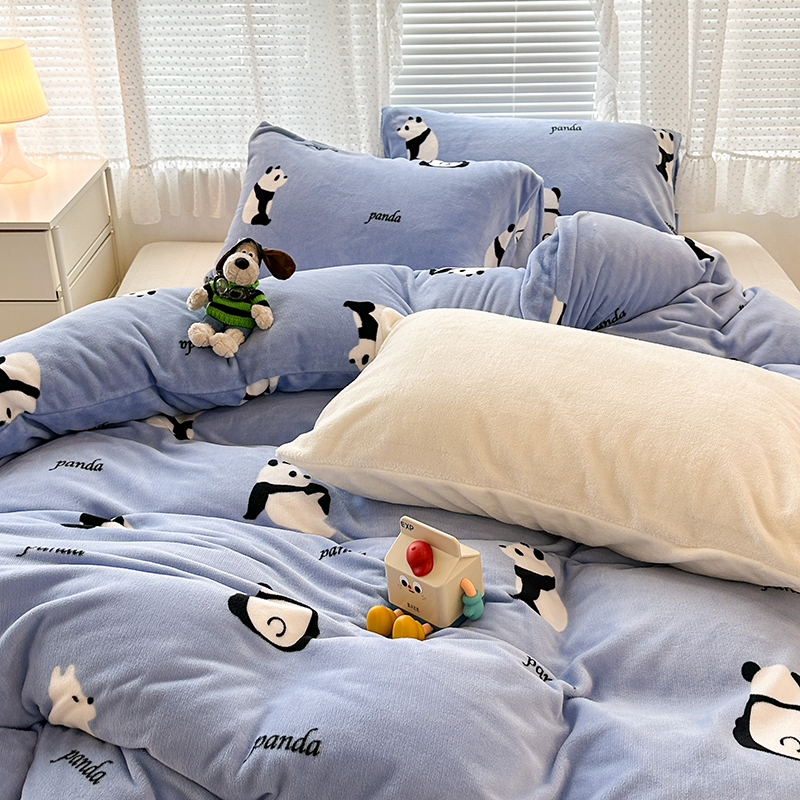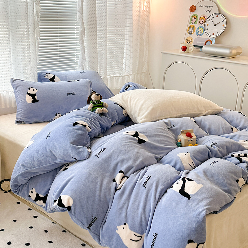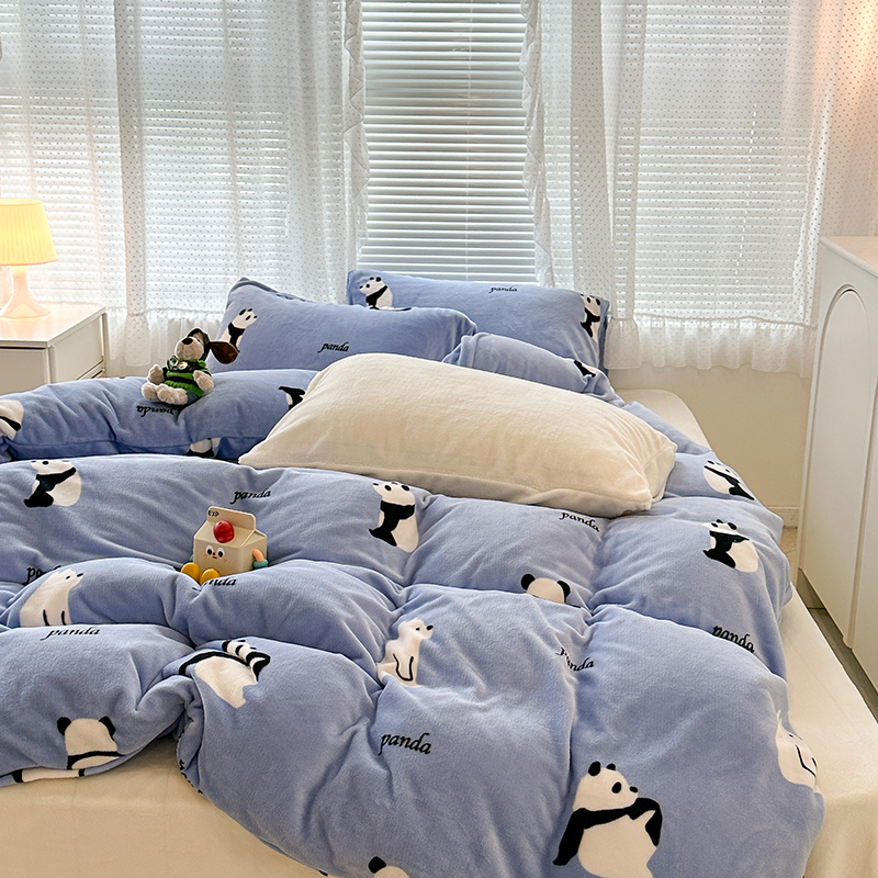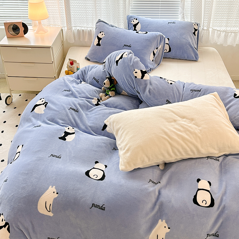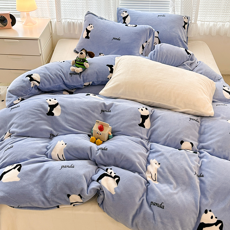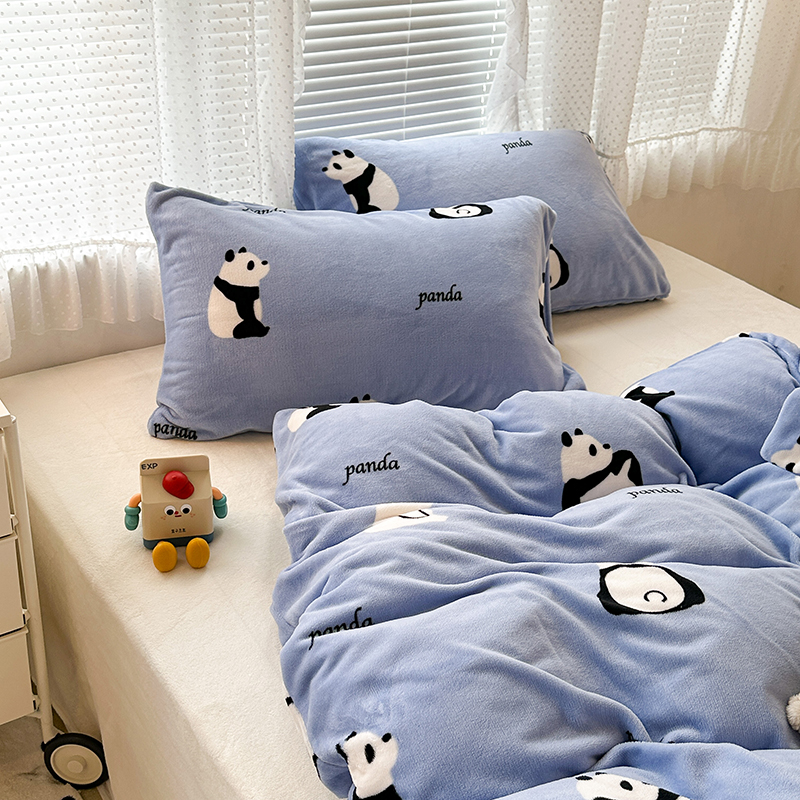 商品名称:昔可家纺 2023新款高克重印花牛奶绒卡通系列四件套 蓝底熊猫