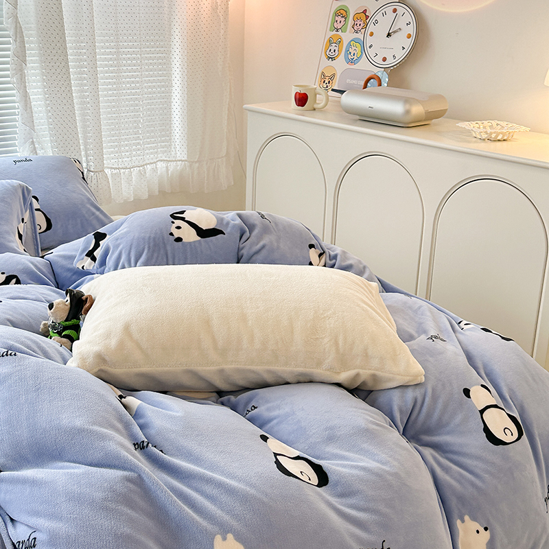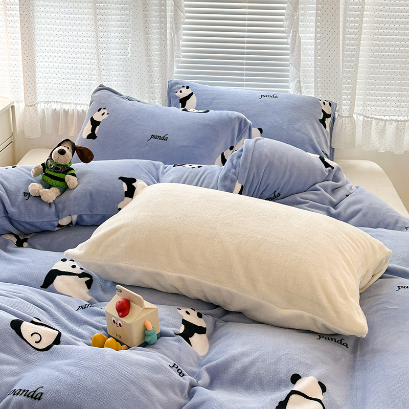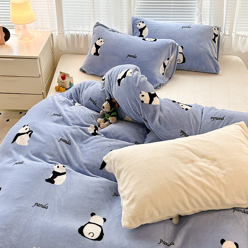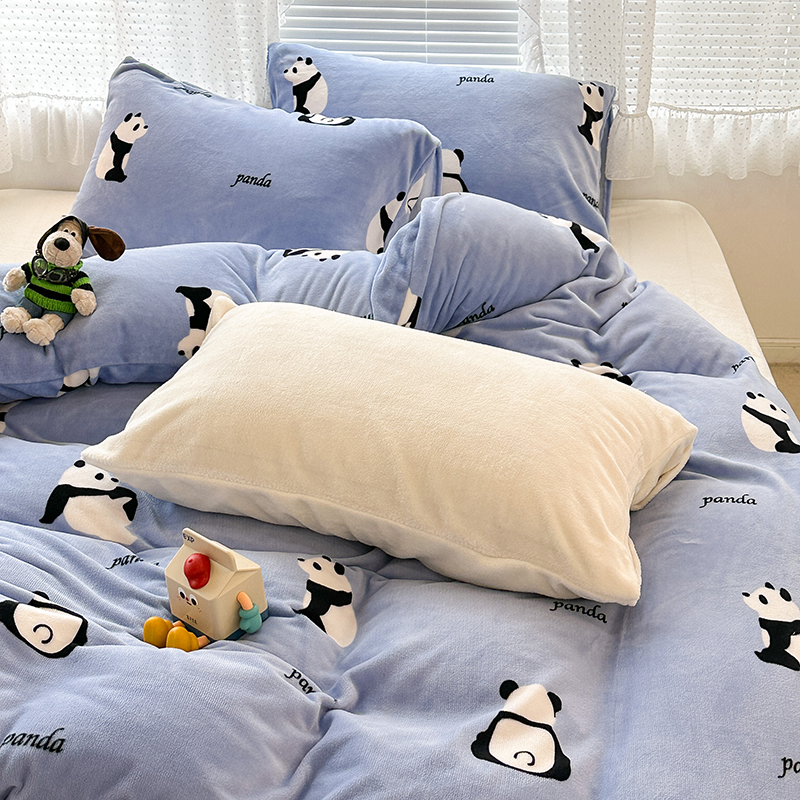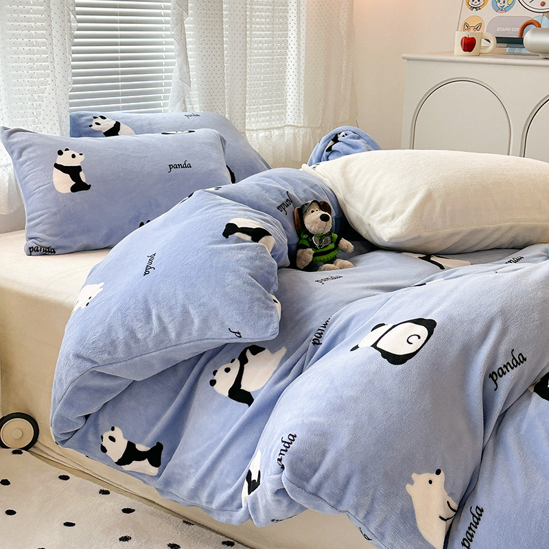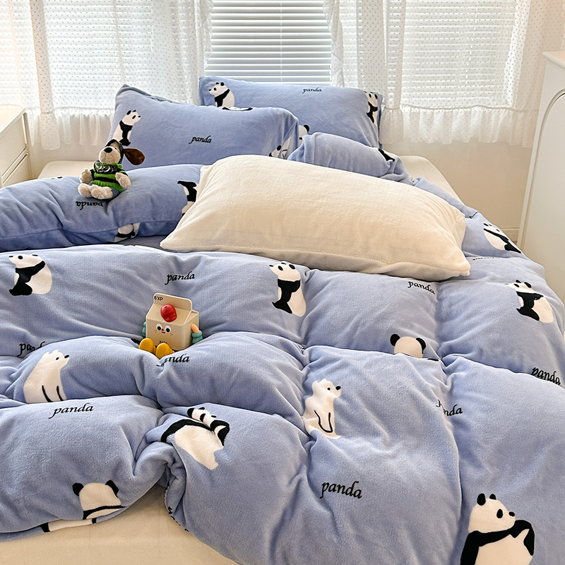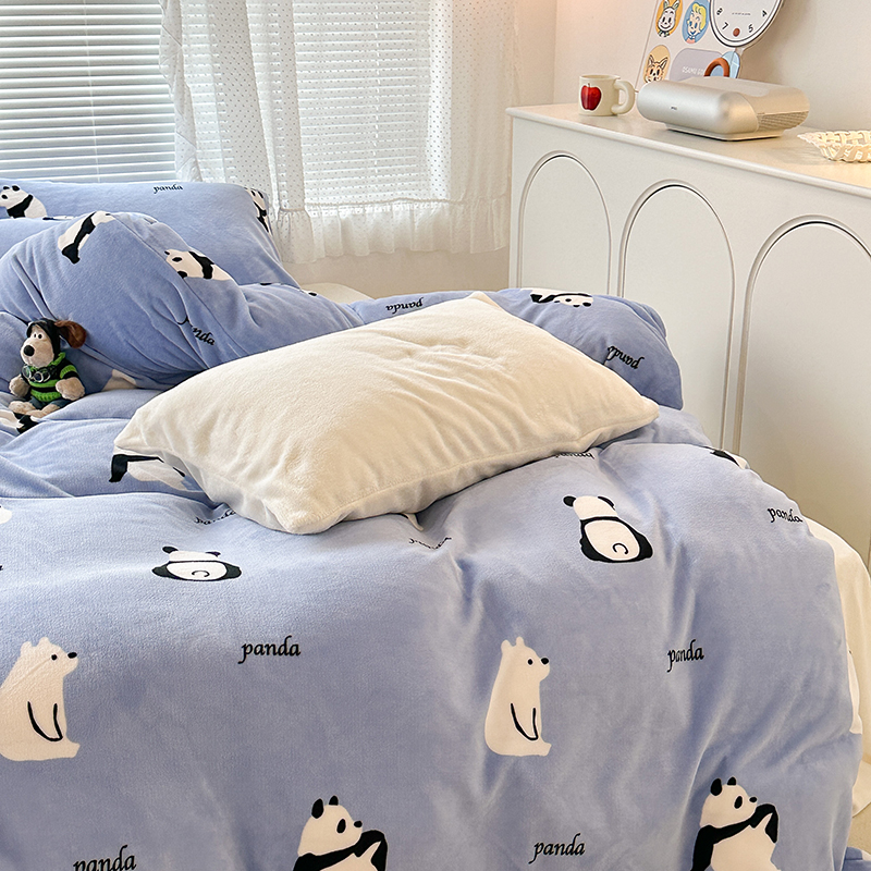 商品名称:昔可家纺 2023新款高克重印花牛奶绒卡通系列四件套 蓝底熊猫