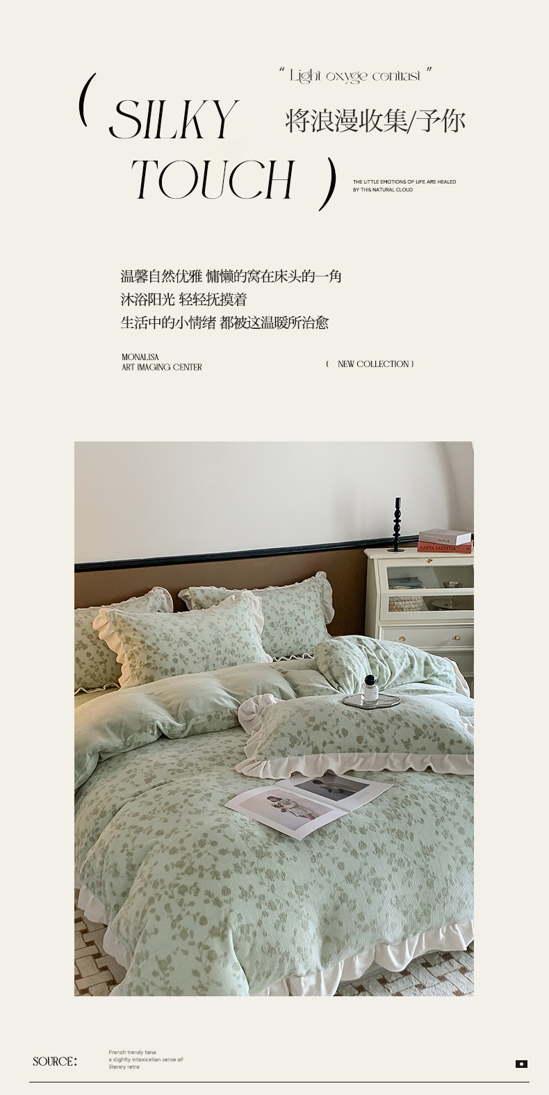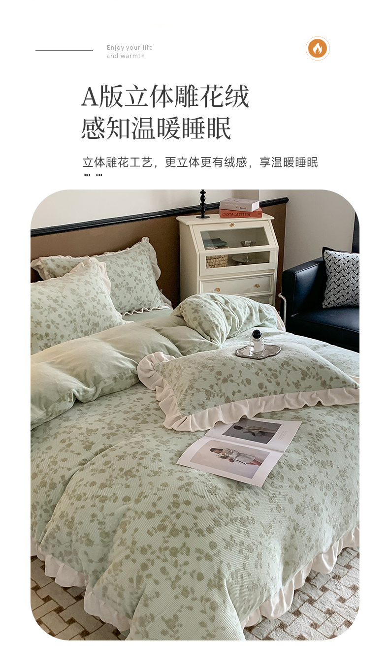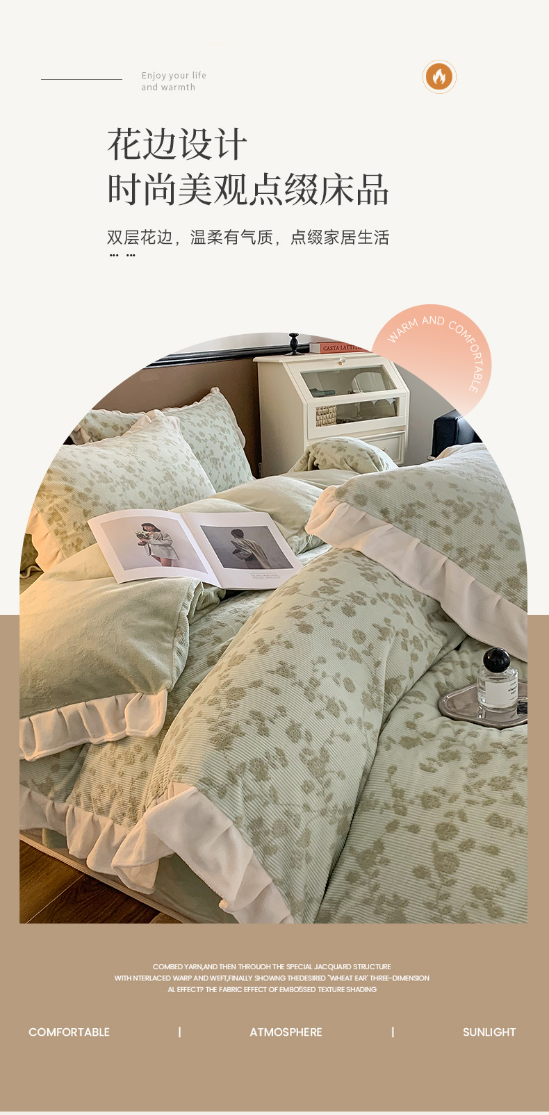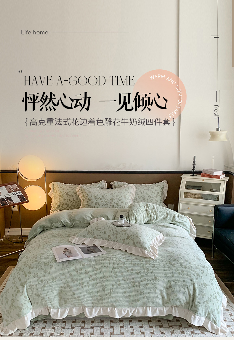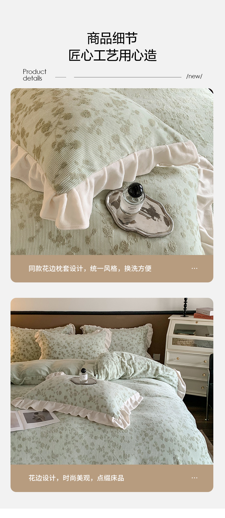 商品名称:潘朵拉 2023新款高克重法式花边着色雕花牛奶绒四件套 梨花绿