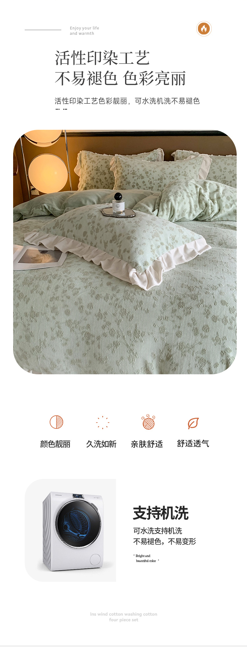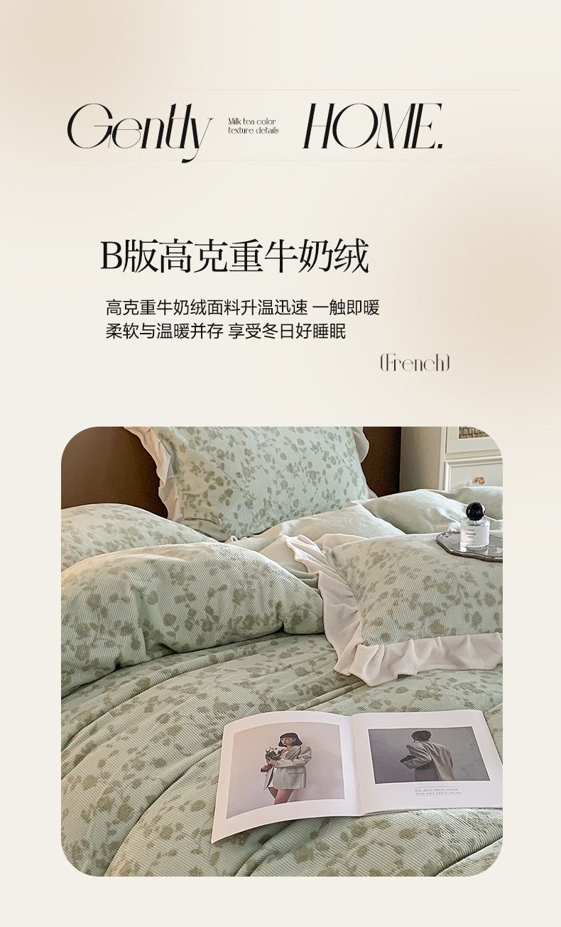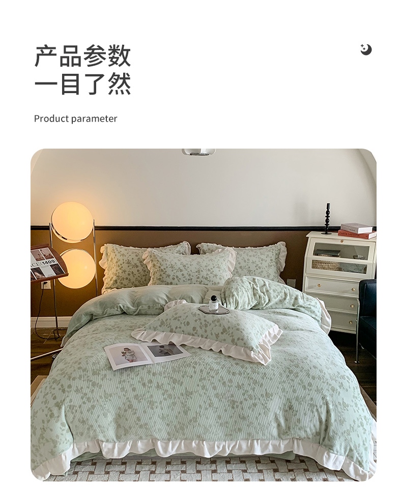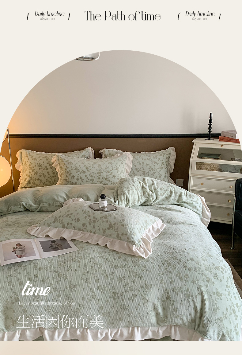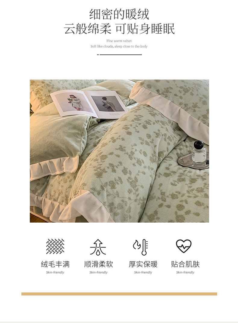 商品名称:潘朵拉 2023新款高克重法式花边着色雕花牛奶绒四件套 梨花绿