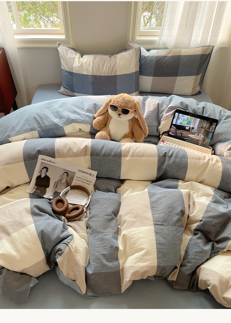 雅居纺家纺 2024新款色织水洗棉四件套 蓝大格