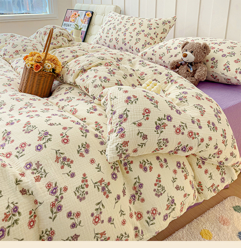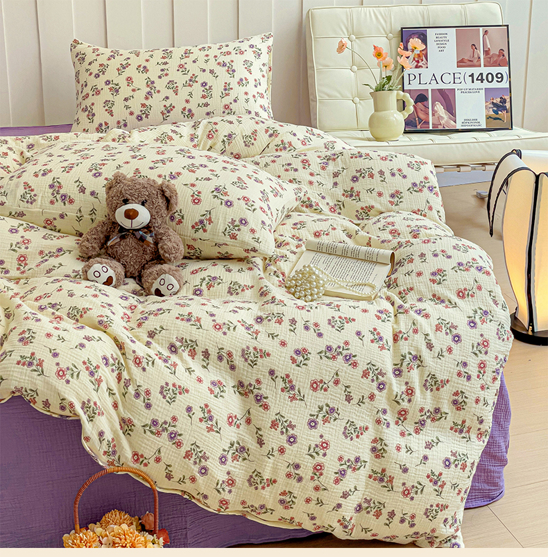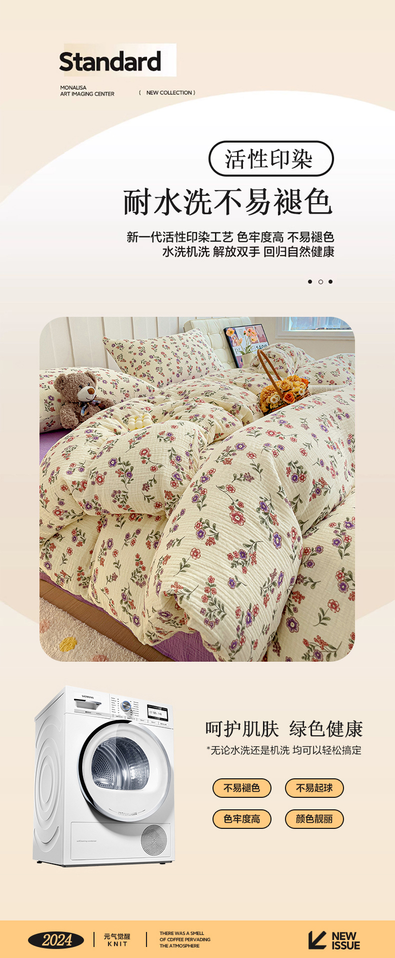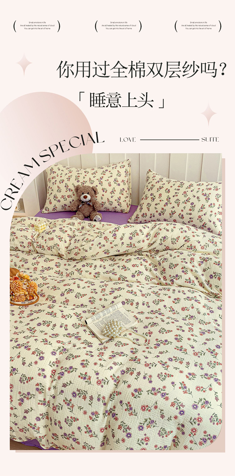 珺柔家纺 2024新款全棉皱皱双层纱印花四件套 花容