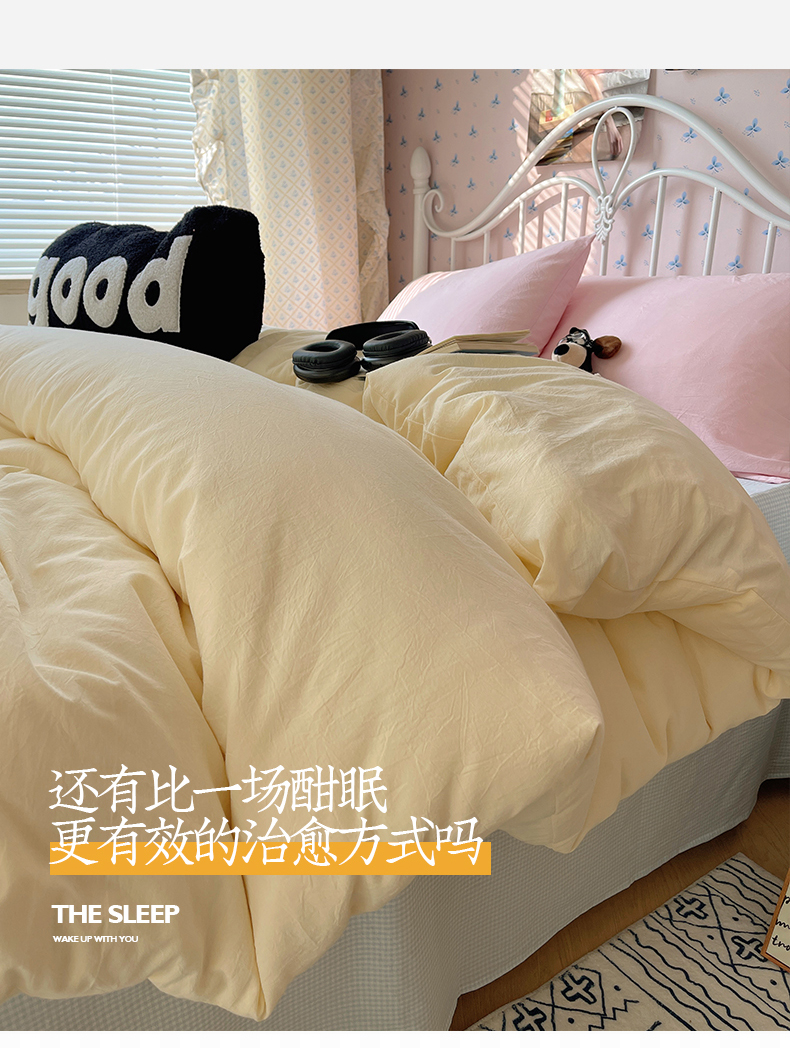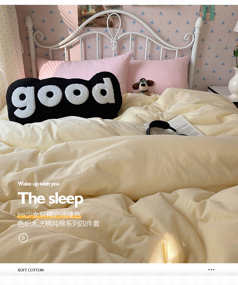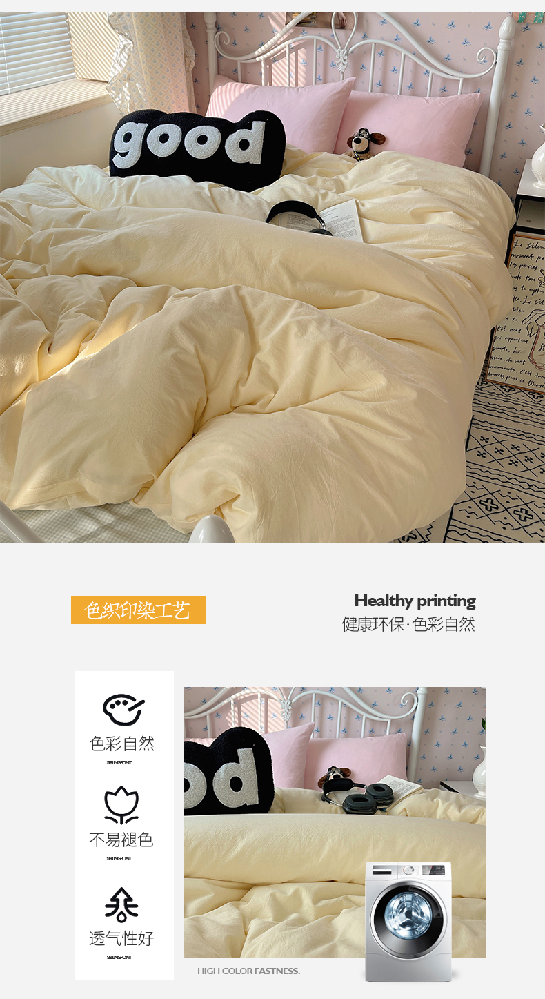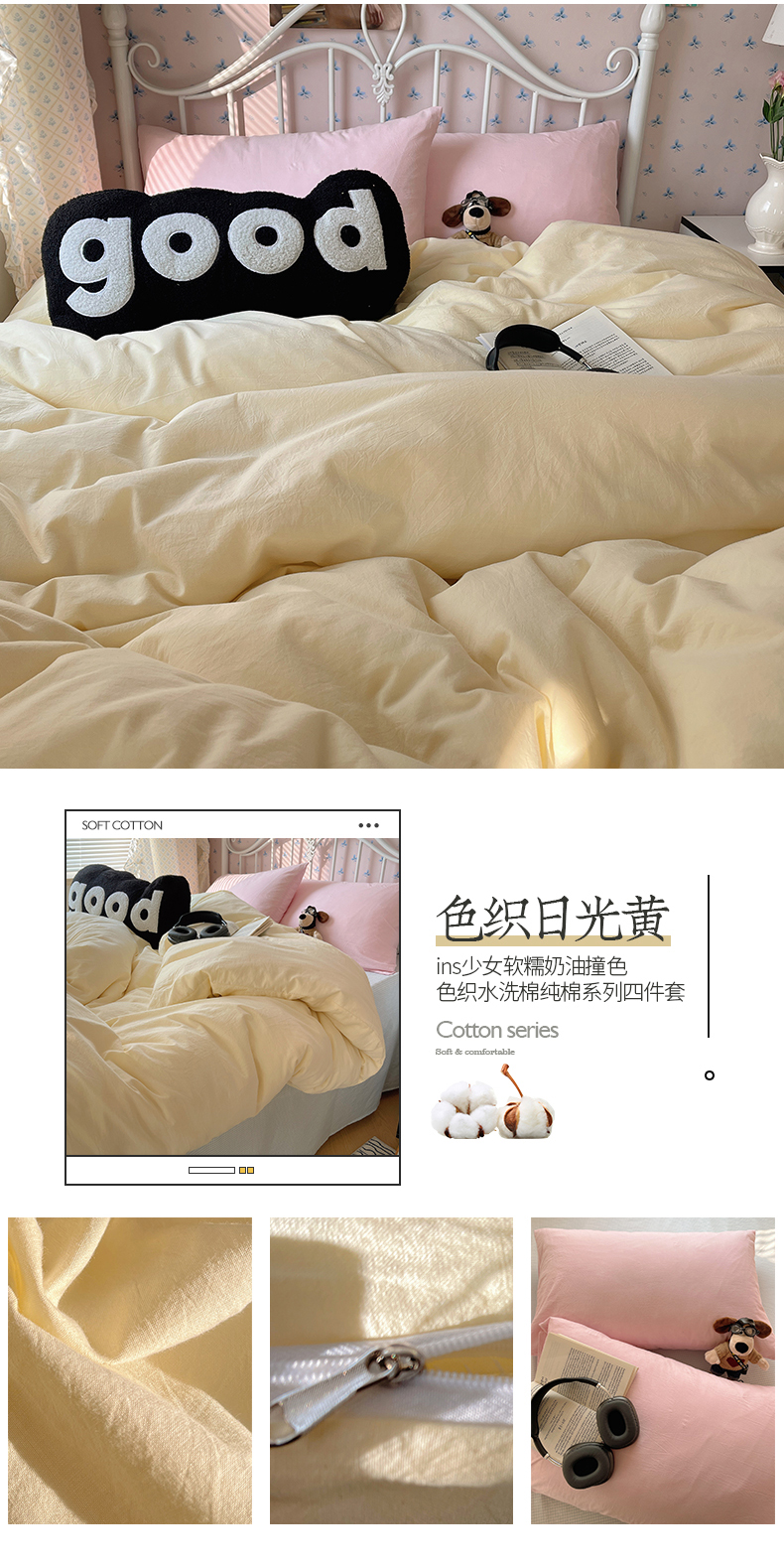 商品名称:桃子家居 2024新款ins少女软糯奶油撞色色织水洗棉纯棉系列四件套 水洗棉-色织日光黄