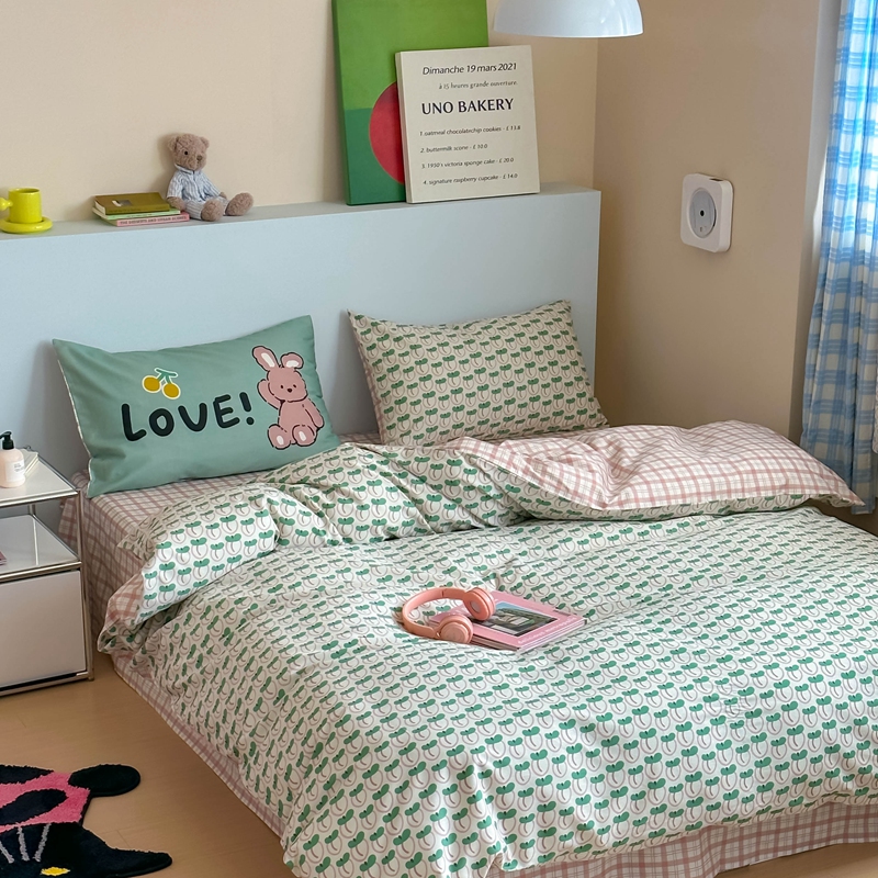 时年 2022新款全棉40支13372ins条纹款四件套 复古奶绿,复古奶绿