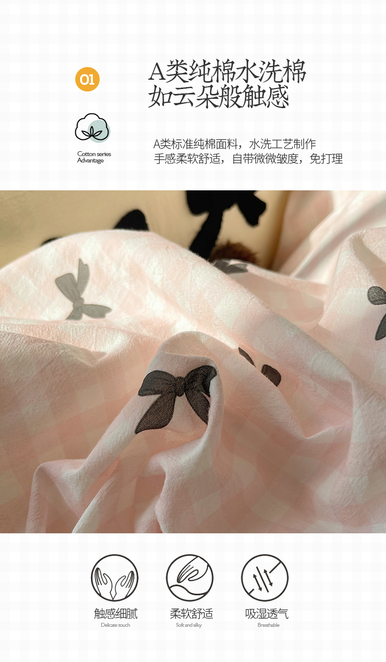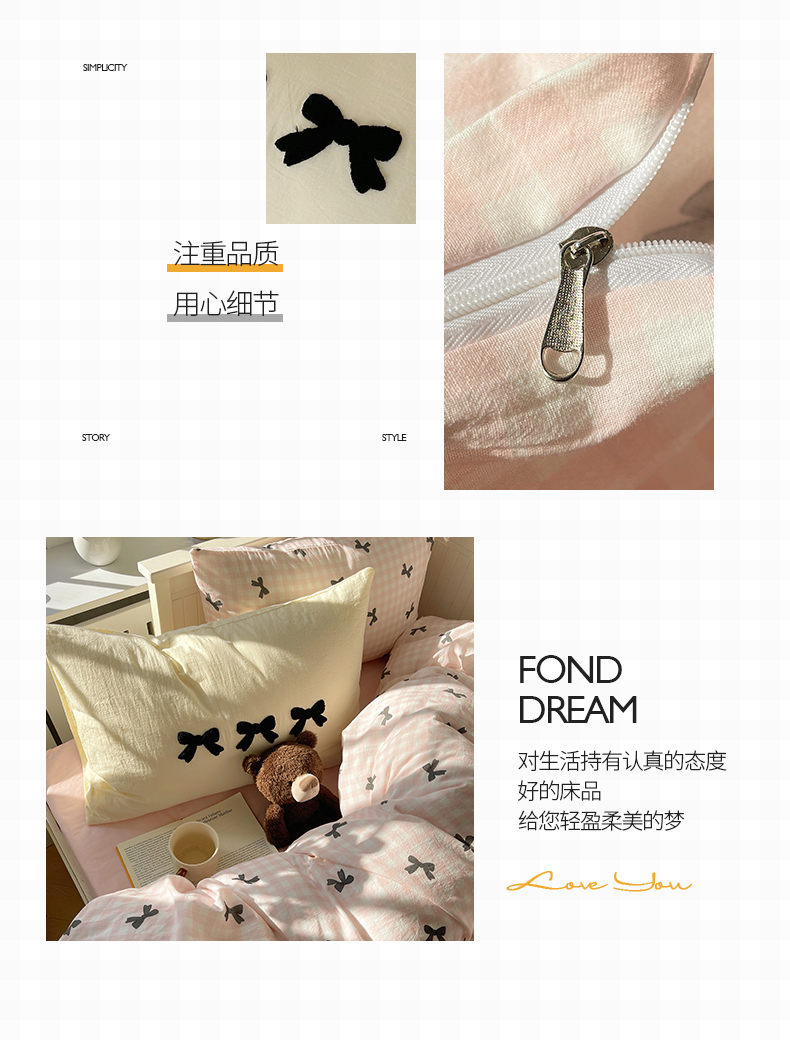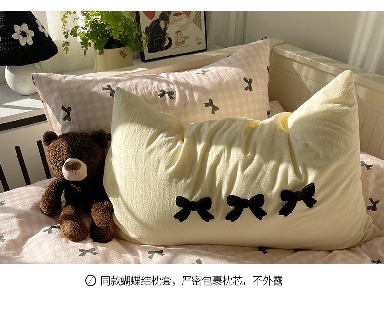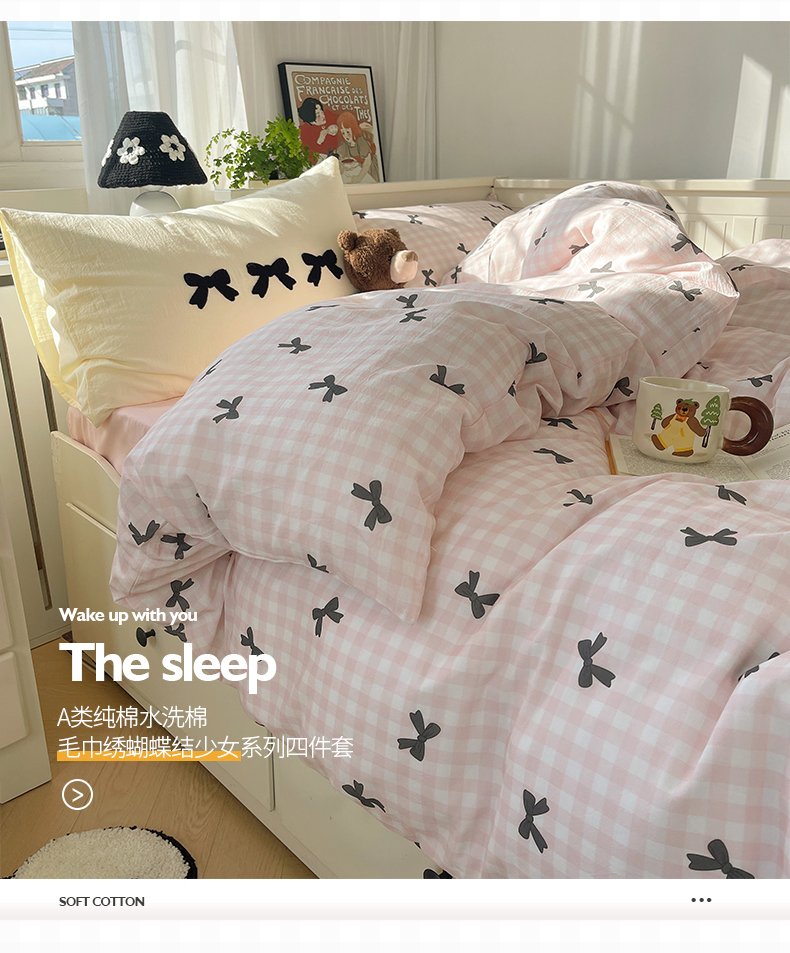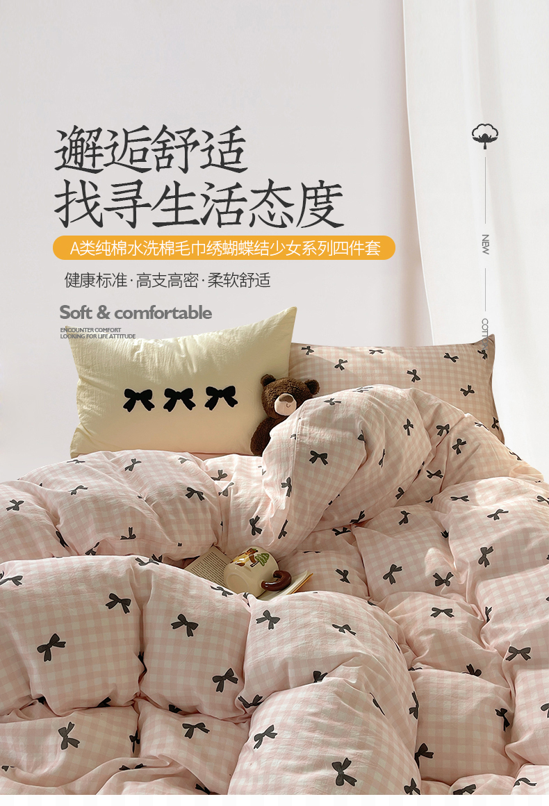 当前位置: 91家纺网 > 商品网购 > 床品套件 > 四件套 > 全棉普通四件套 > 桃子家居 2024新款A类纯棉水洗棉毛巾绣蝴蝶结少女系列四件套 水洗棉-蝴蝶结粉黑+粉黄