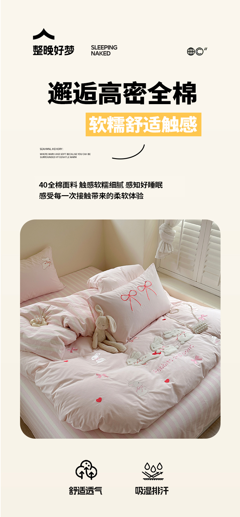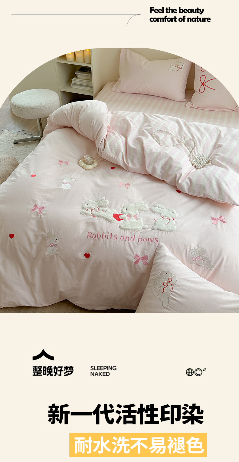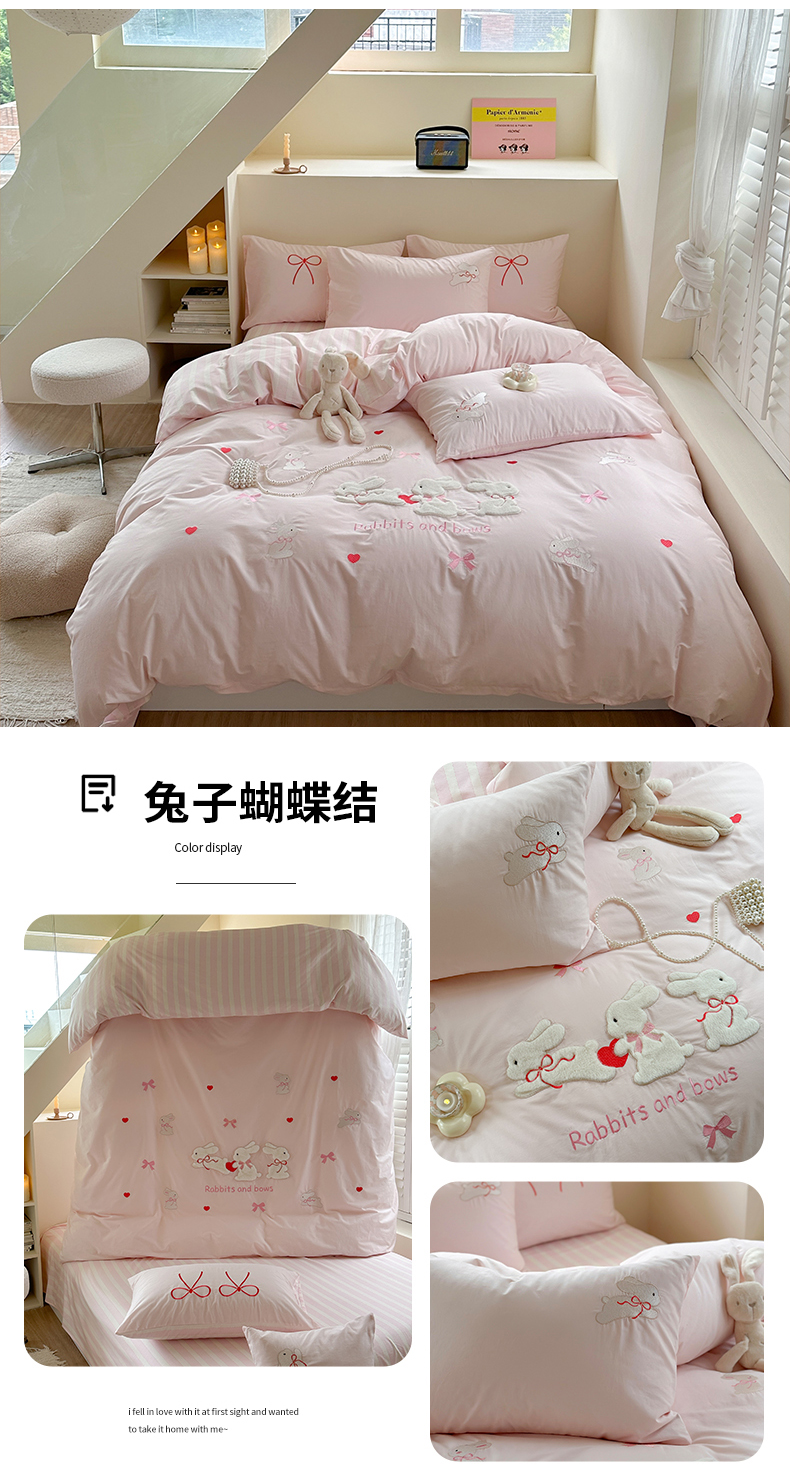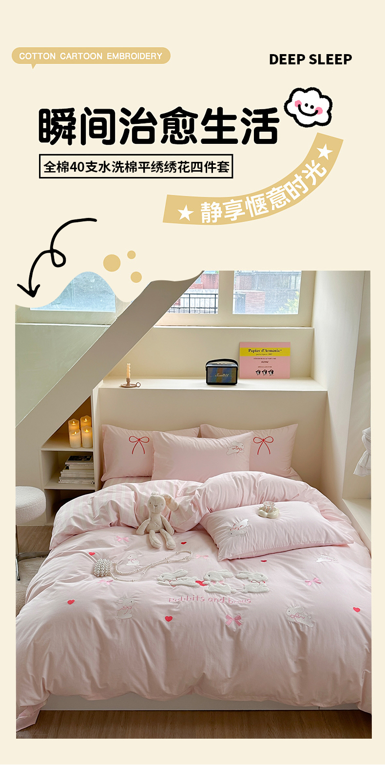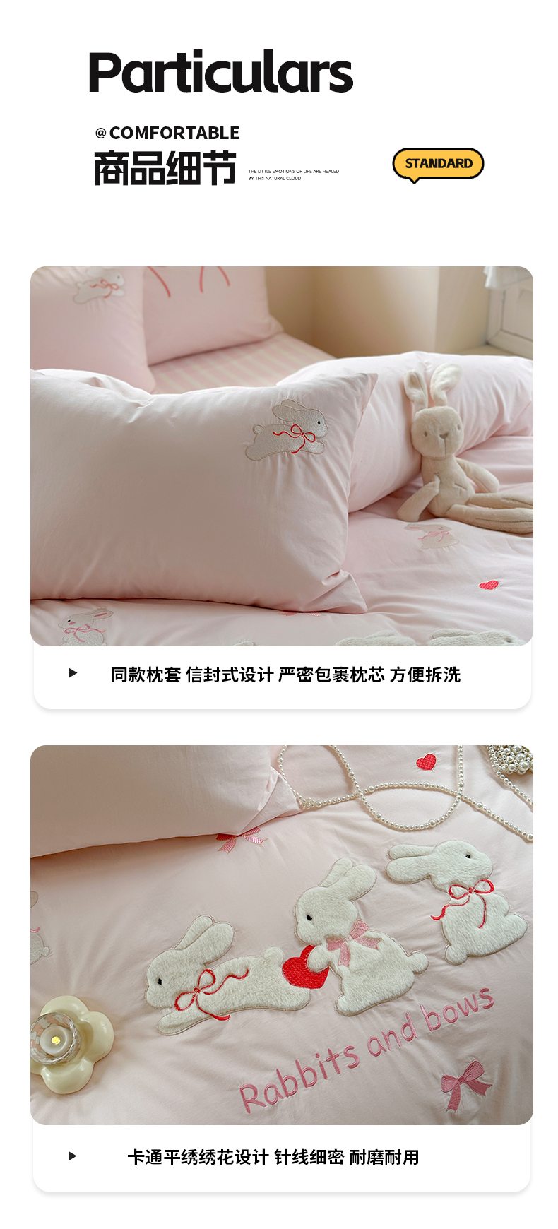 眠屿家纺 2024新款40支全棉水洗棉平绣绣花四件套 兔子蝴蝶结