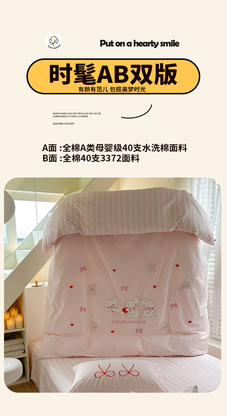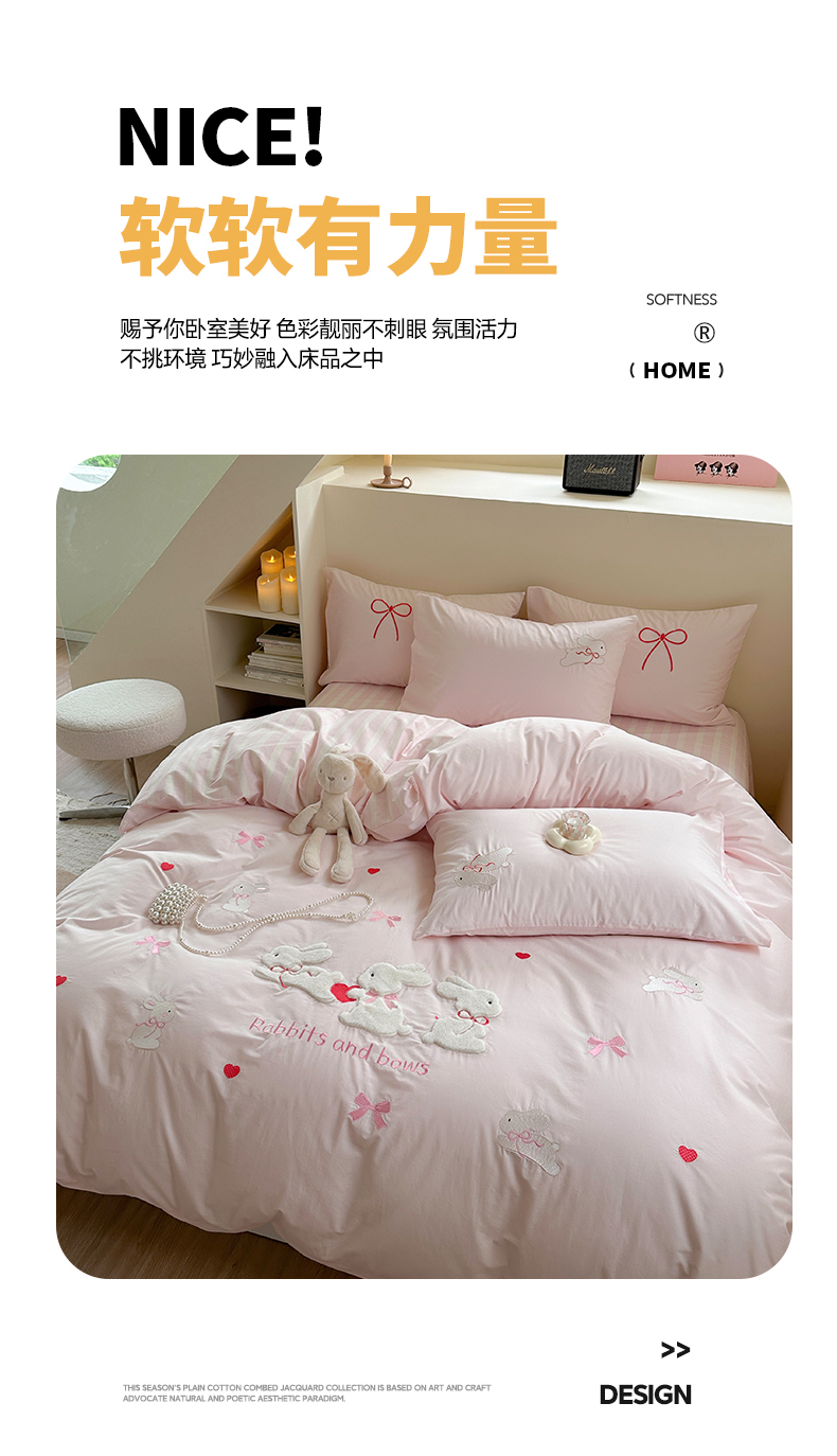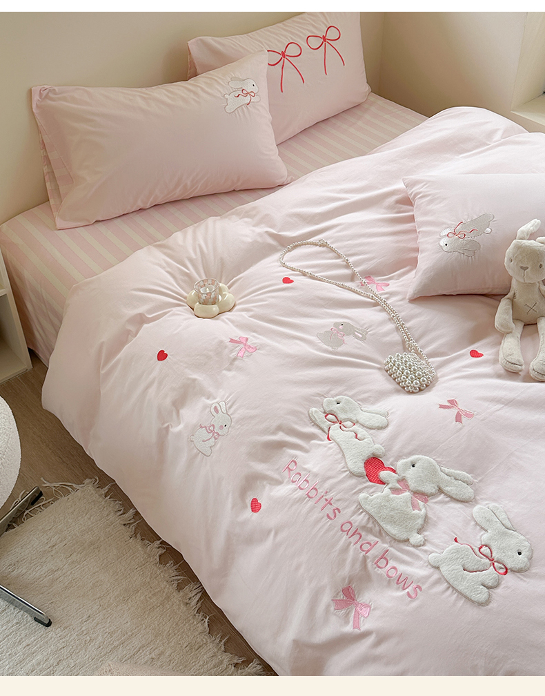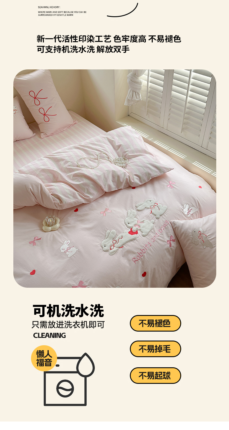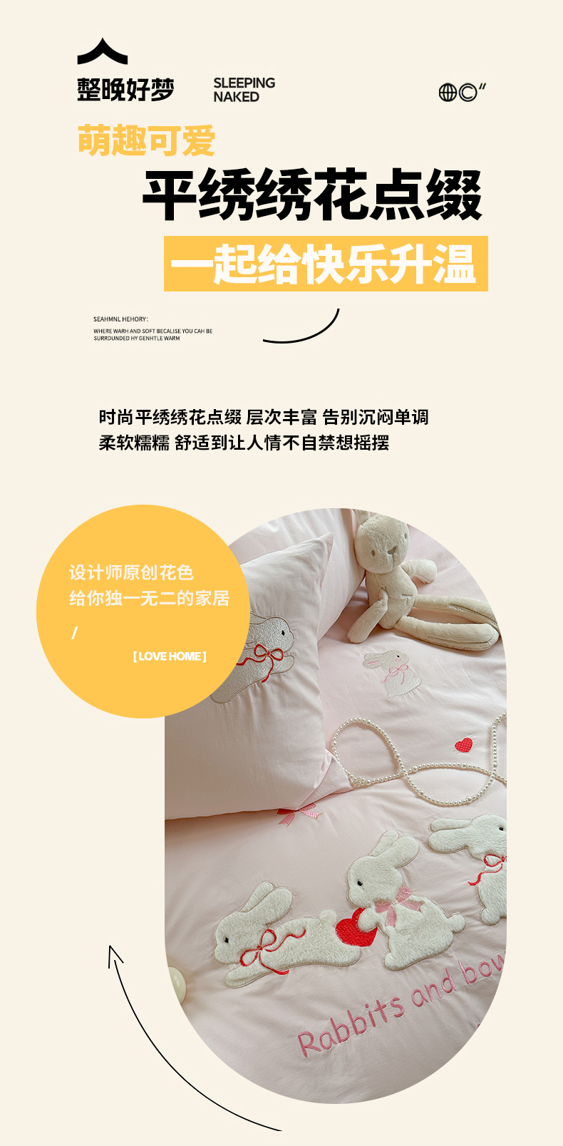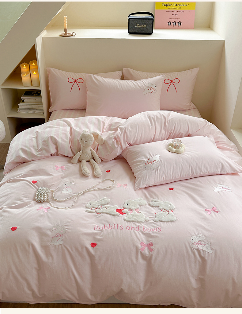眠屿家纺 2024新款40支全棉水洗棉平绣绣花四件套 兔子蝴蝶结