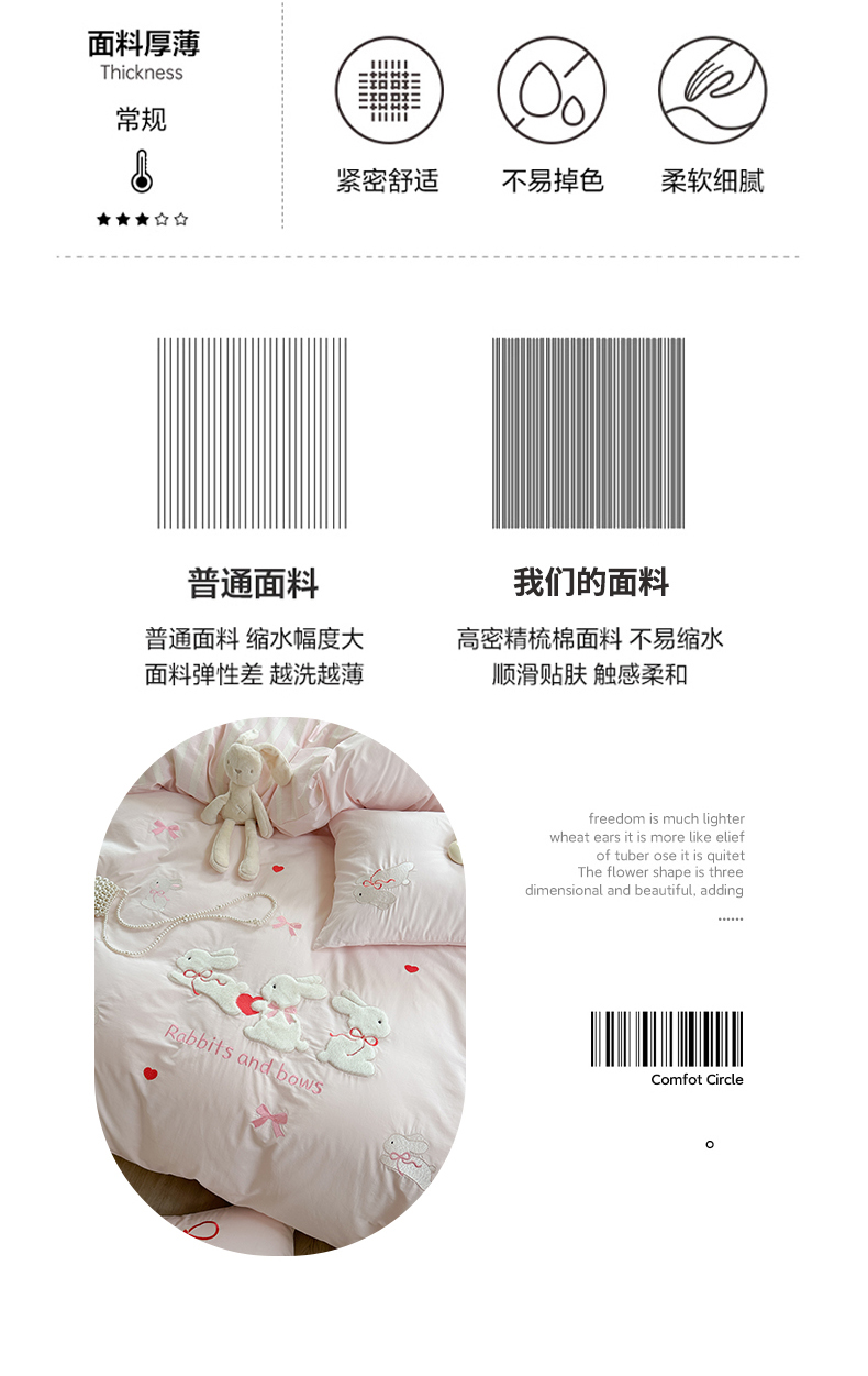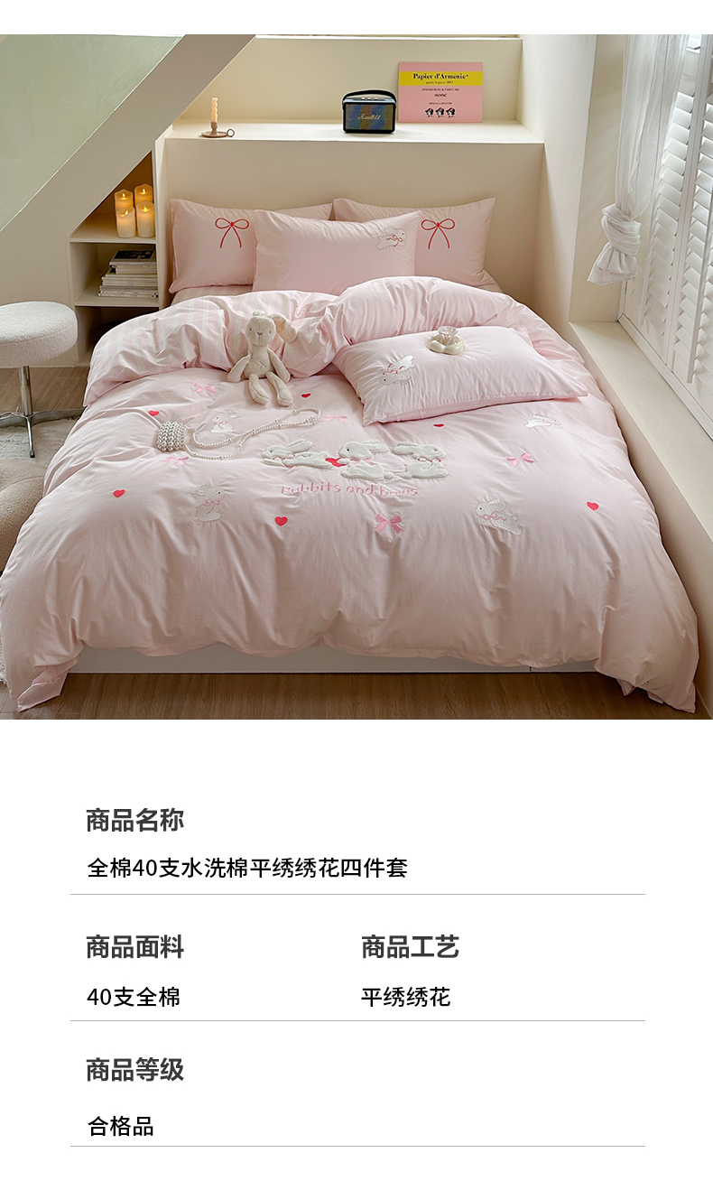 商品名称:眠屿家纺 2024新款40支全棉水洗棉平绣绣花四件套 兔子蝴蝶结