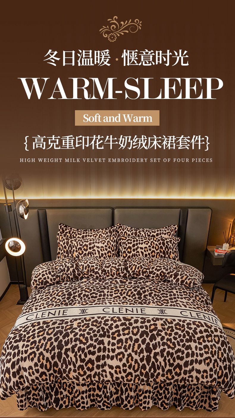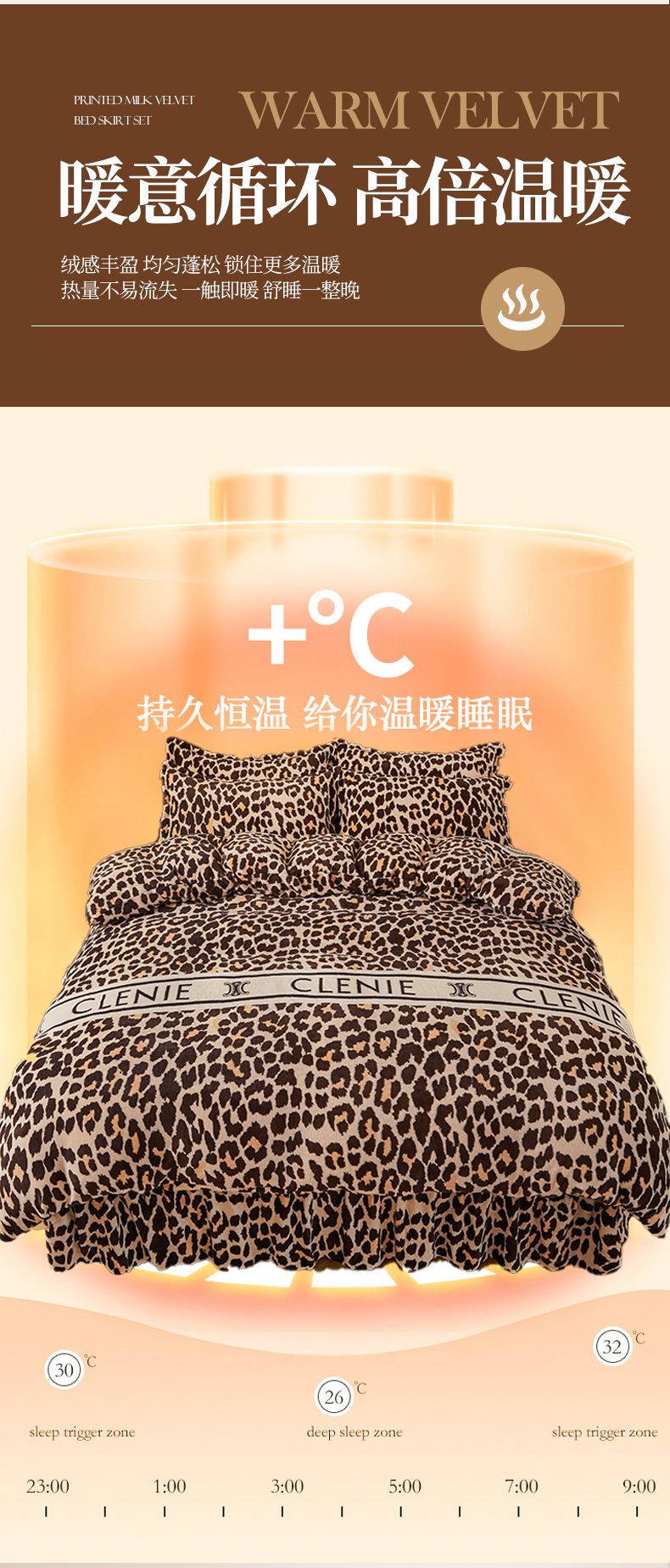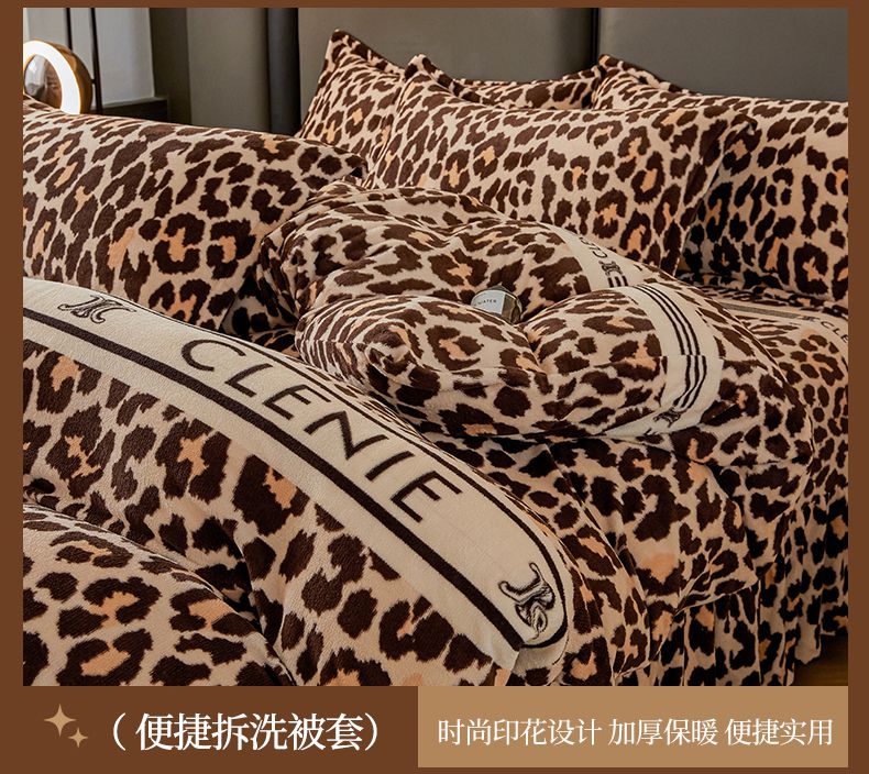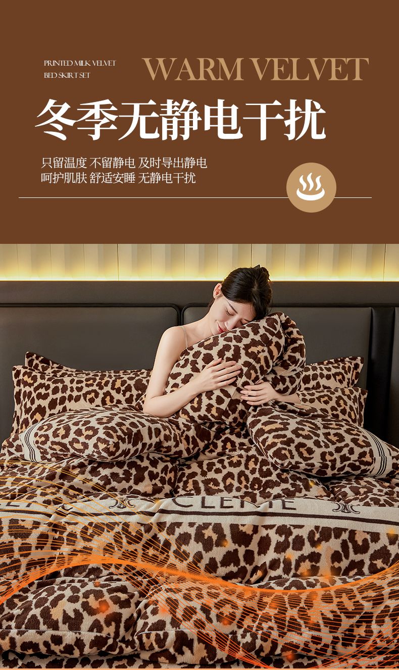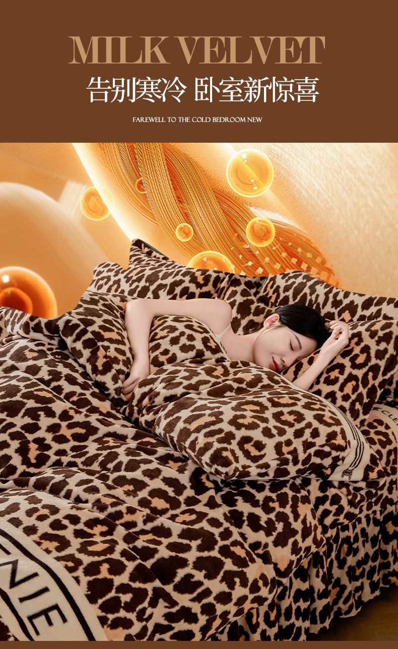 当前位置: 91家纺网 > 商品网购 > 床品套件 > 四件套 > 牛奶绒四件套 > 董韵家纺 2025新款高克重全消光牛奶绒法莱绒金貂绒印花单品被套床裙四件套(提供买家秀)豹纹元素