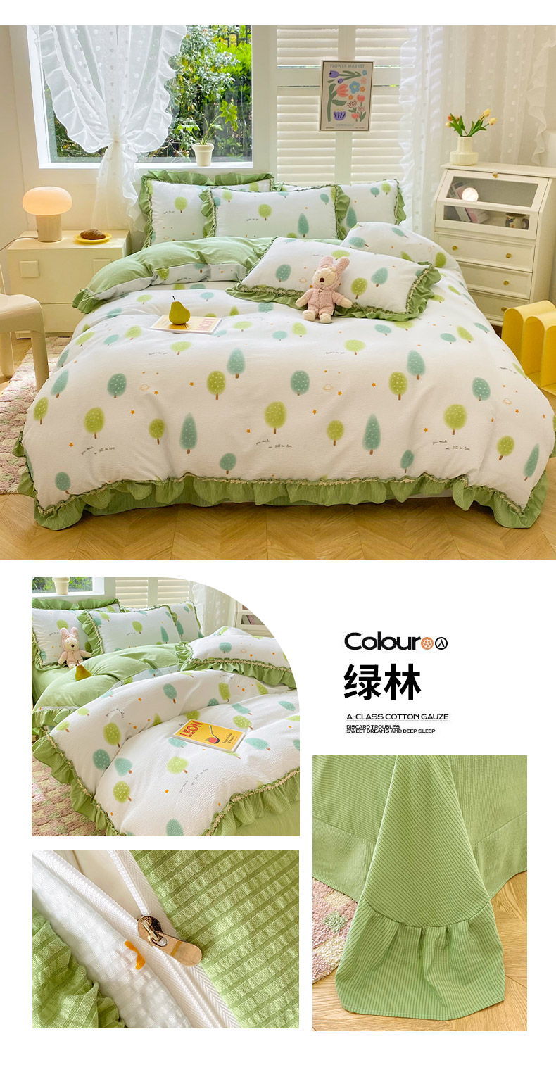 同田家纺 2024新款泡泡棉印花蕾丝工艺四件套 绿林