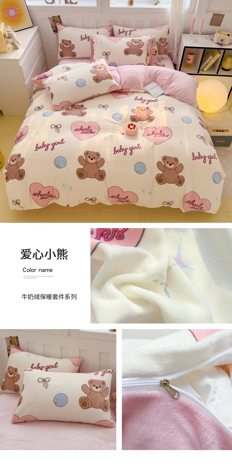 当前位置: 91家纺网 > 商品网购 > 床品套件 > 四件套 > 牛奶绒四件套 > 枋梢家纺 2024新款加厚牛奶绒印花四件套 爱心小熊