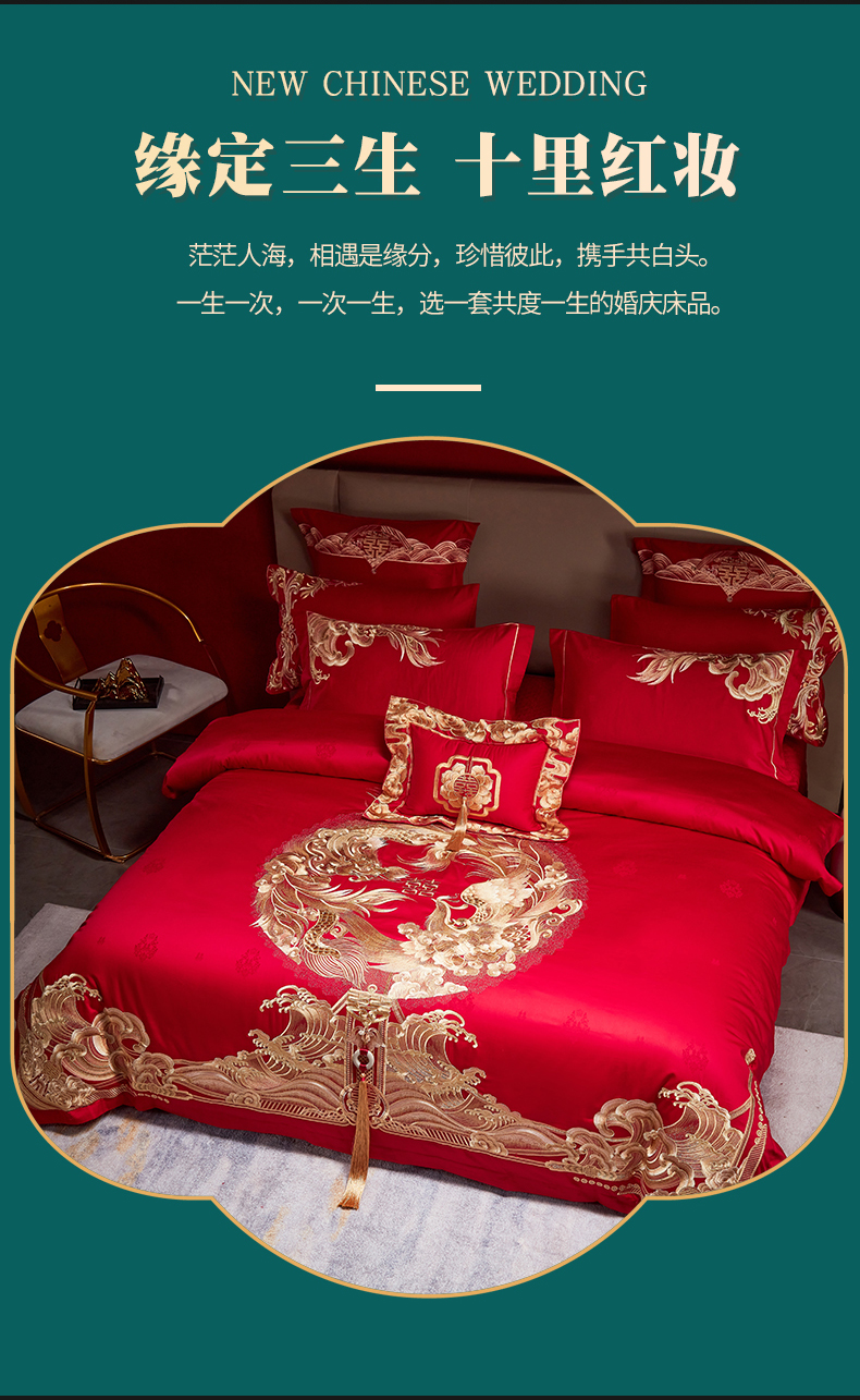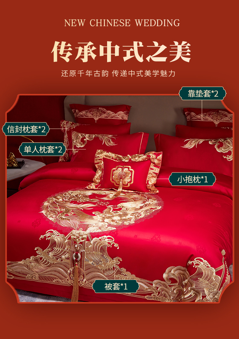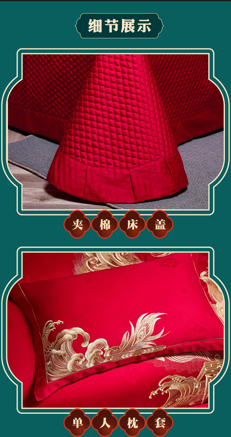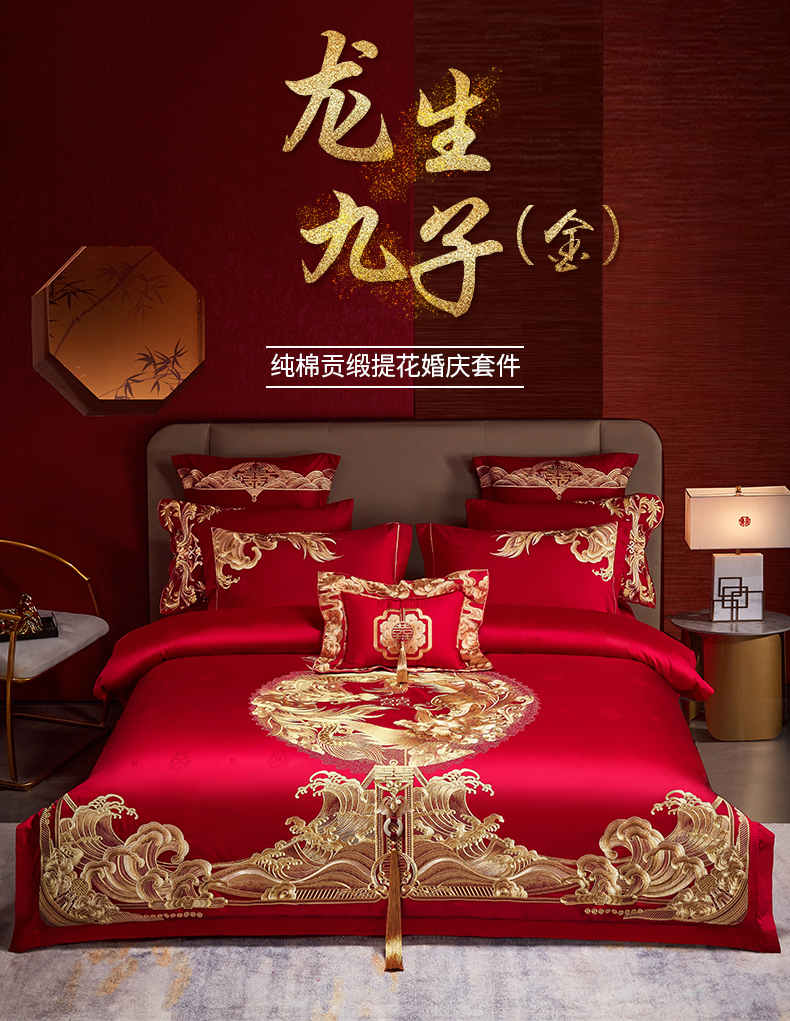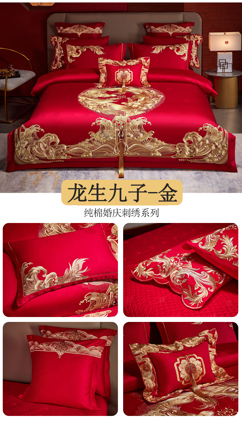 当前位置: 91家纺网 > 商品网购 > 床品套件 > 四件套 > 婚庆四件套 > 宏羽纺家纺 2024新款高支高密纯棉提花婚庆套件系列(控价680)龙生九子-金