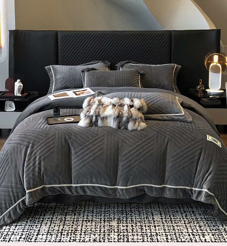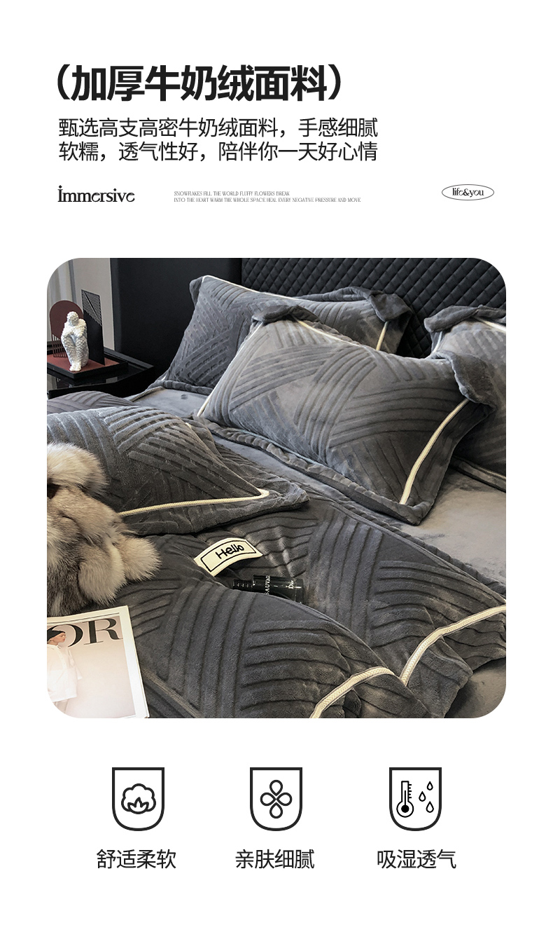 商品名称:首尔家纺 2024新款牛奶绒雕花四件套-律动系列 律动-深灰