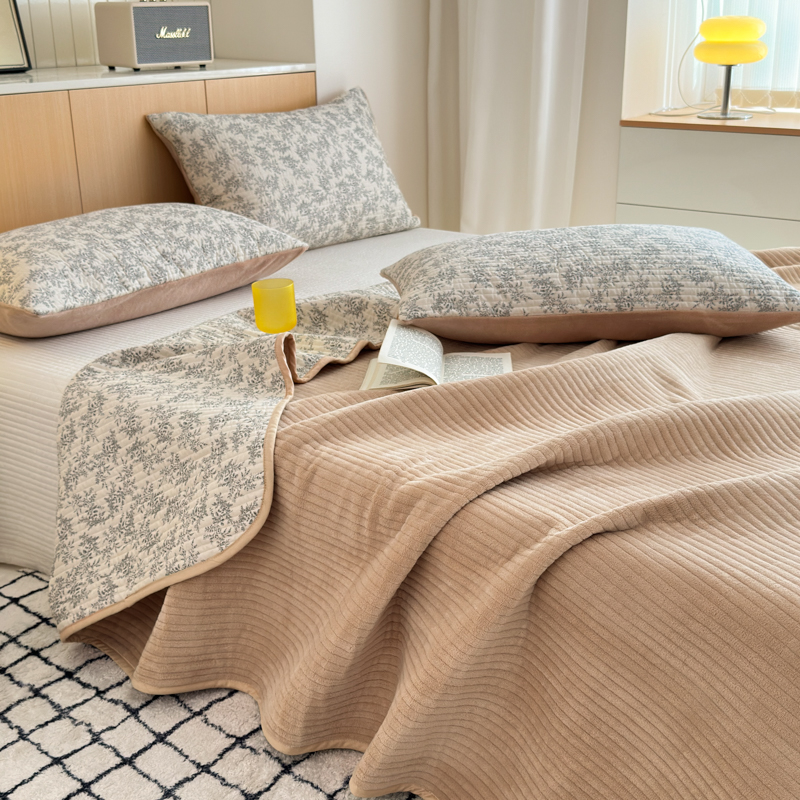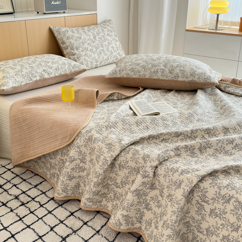 2024新款A类全棉双层纱牛奶绒双面夹棉床盖三件套 陌上花开-深灰