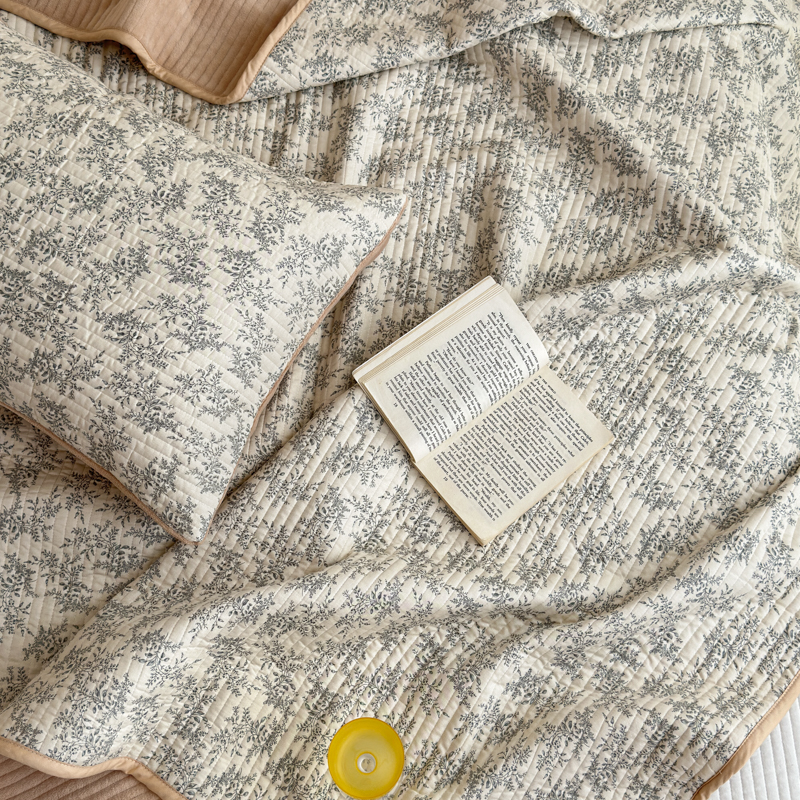 商品名称:2024新款A类全棉双层纱牛奶绒双面夹棉床盖三件套 陌上花开-深灰