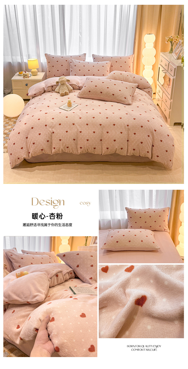 商品名称:二八年华 2024新款暖心系列高克重牛奶绒四件套 暖心-杏粉