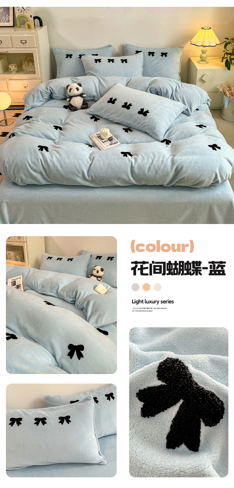 商品名称:首尔家纺 2024新款牛奶绒卡通毛巾绣蝴蝶结系列四件套 花间蝴蝶-蓝