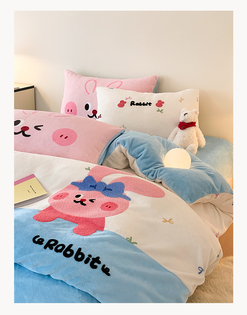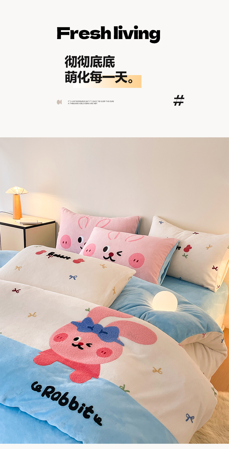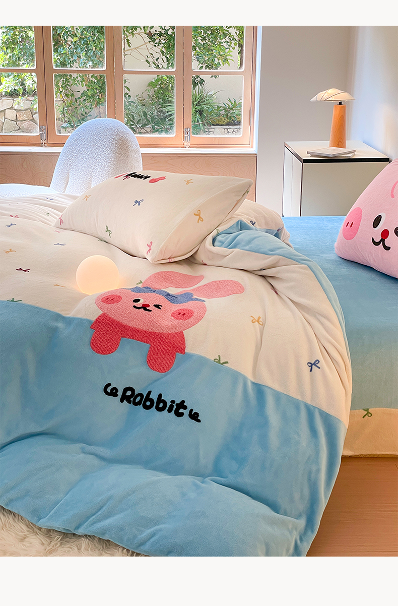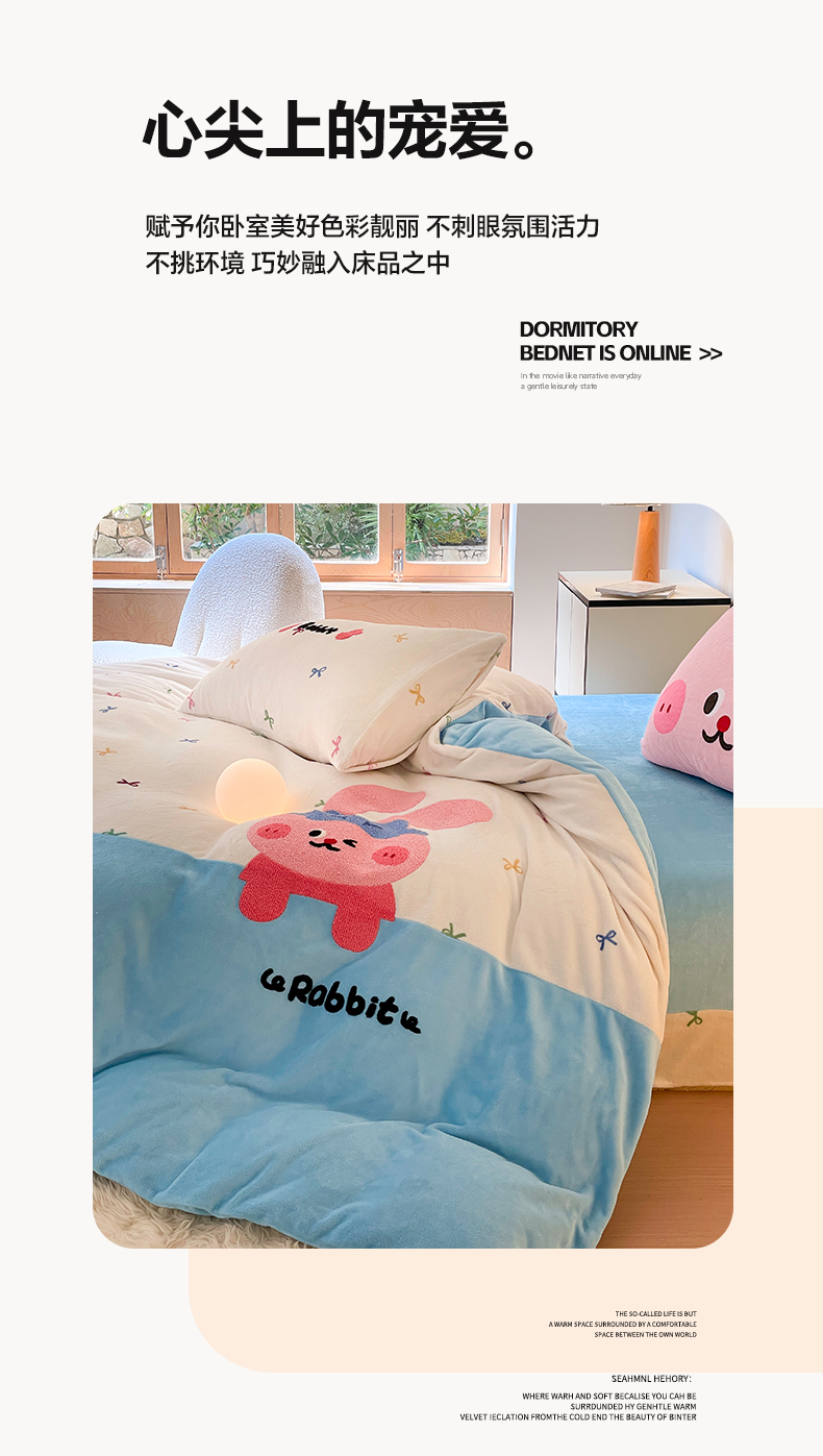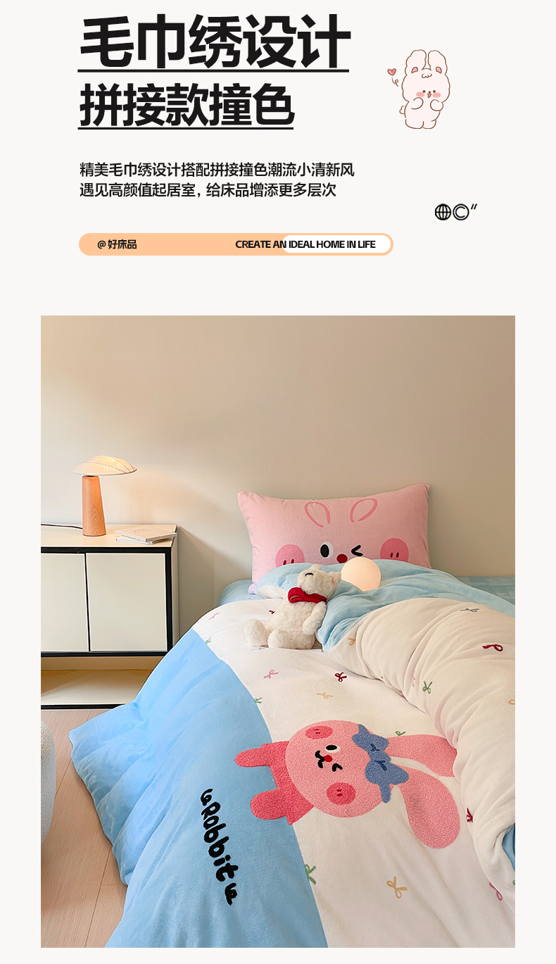 如一 2024新款牛奶绒拼接工艺款贴布绣+毛巾绣四件套 毛巾绣-害羞兔