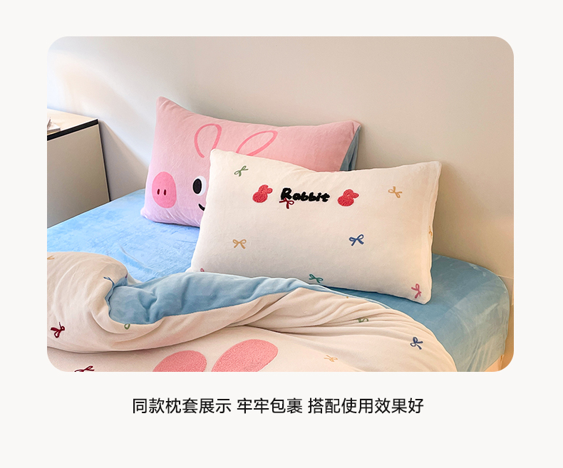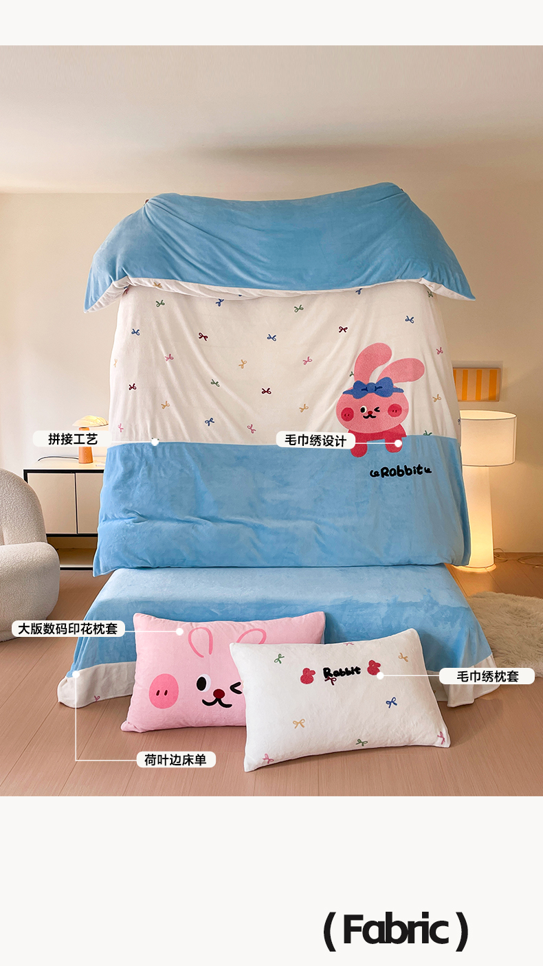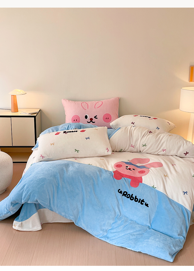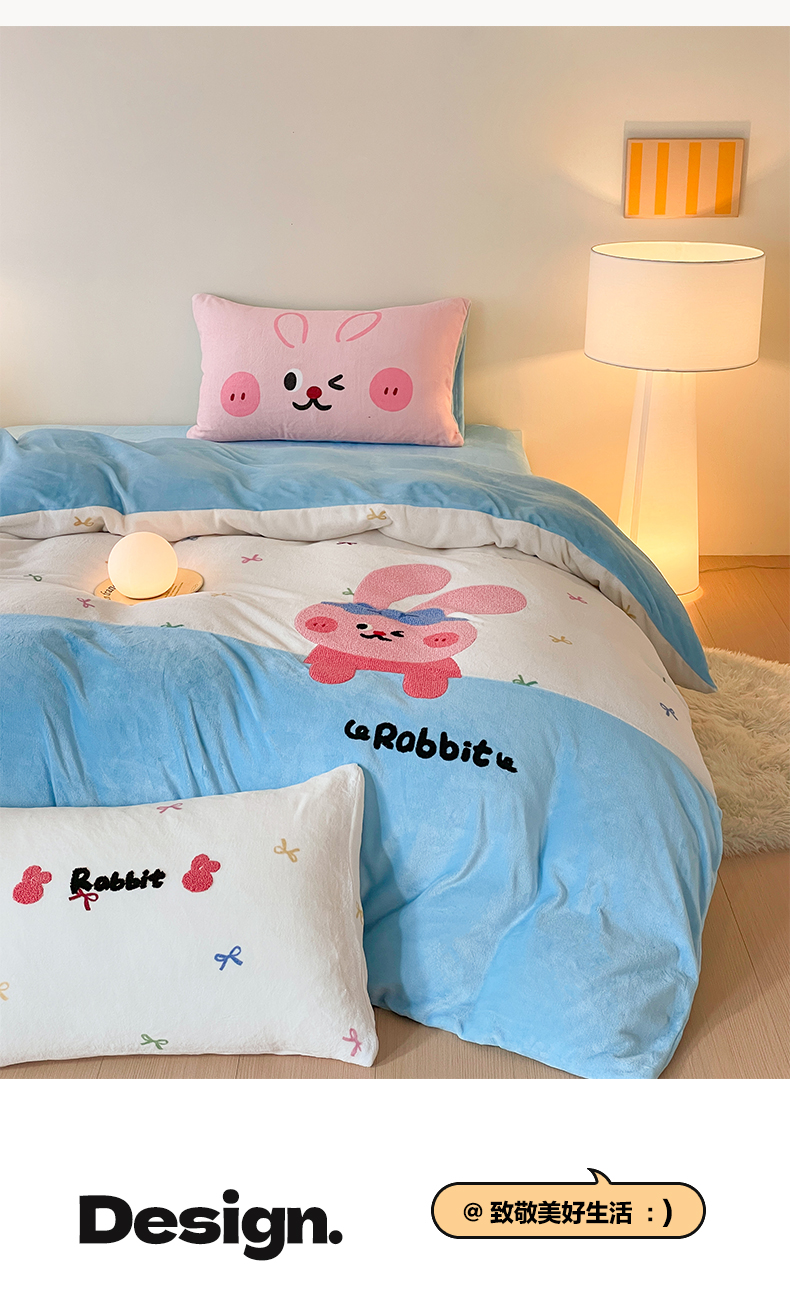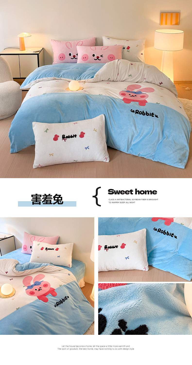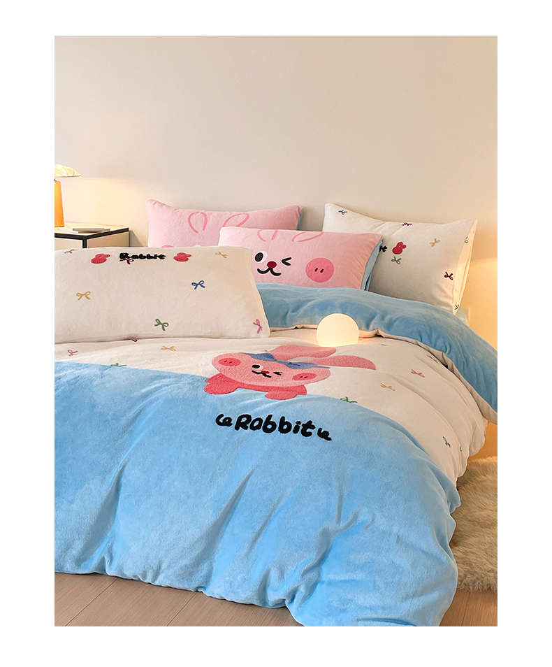 如一 2024新款牛奶绒拼接工艺款贴布绣+毛巾绣四件套 毛巾绣-害羞兔