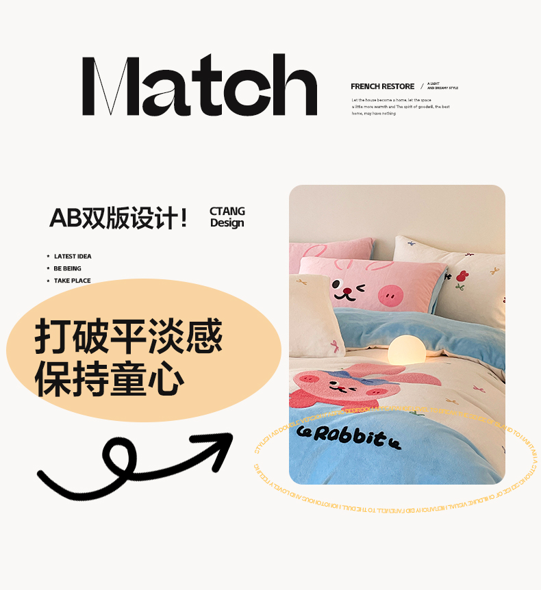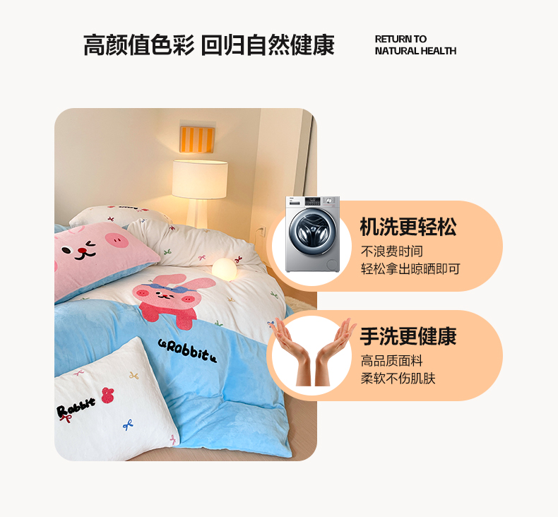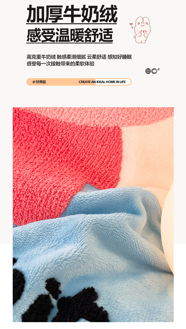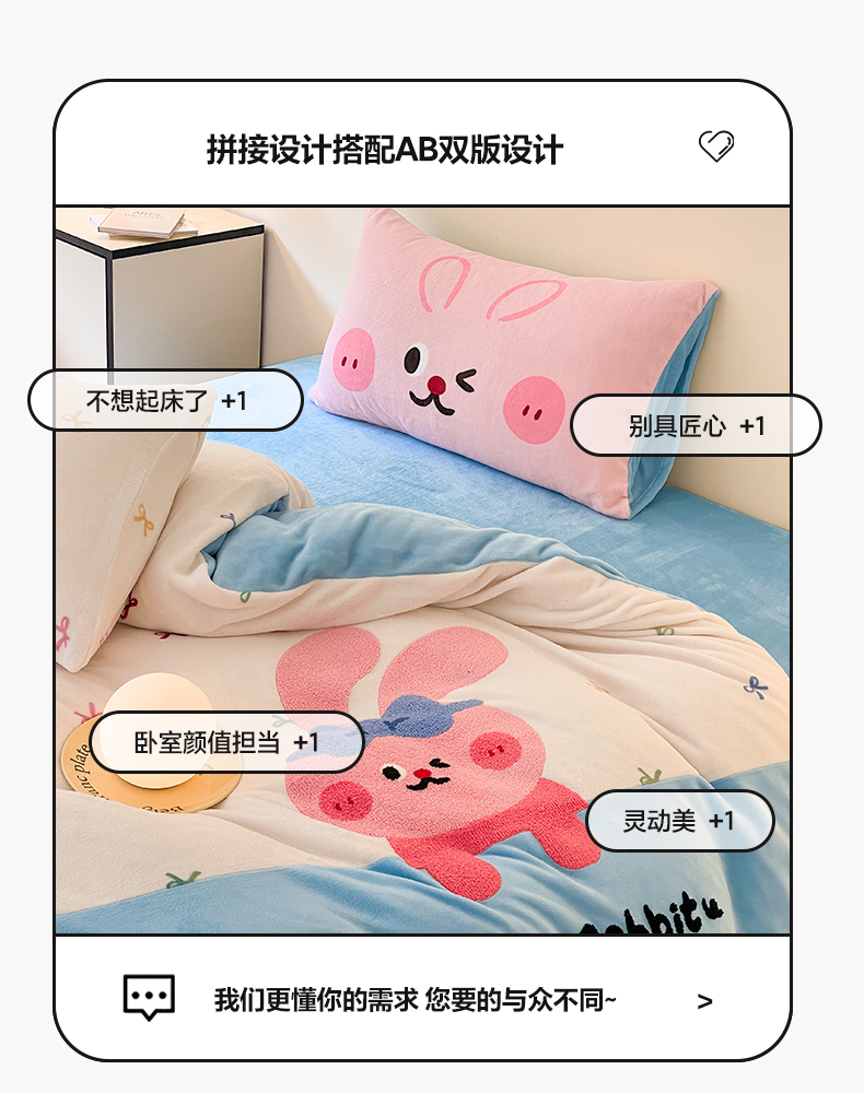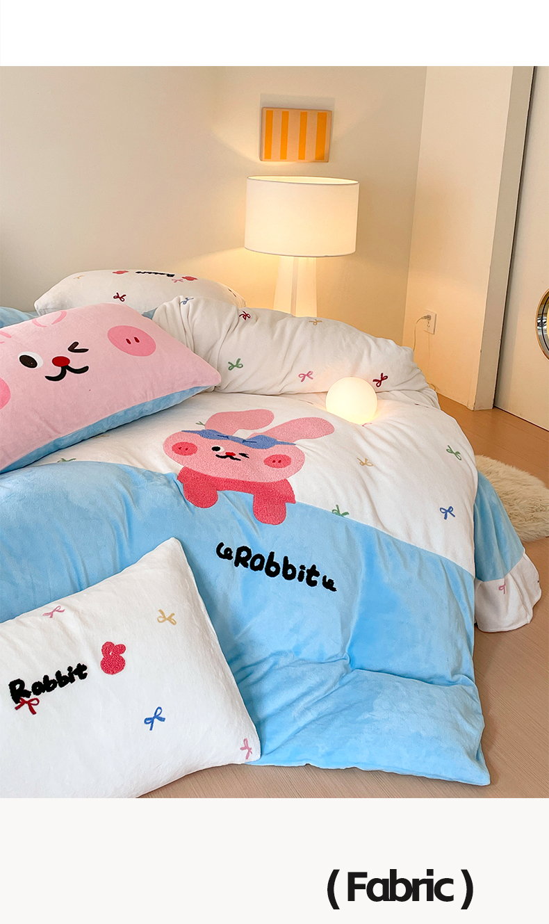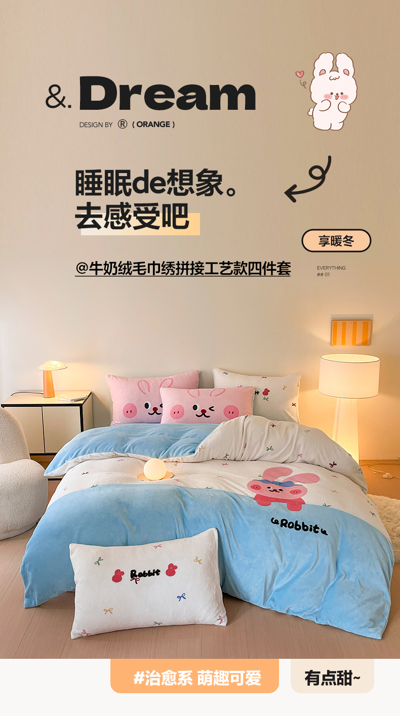 如一 2024新款牛奶绒拼接工艺款贴布绣+毛巾绣四件套 毛巾绣-害羞兔