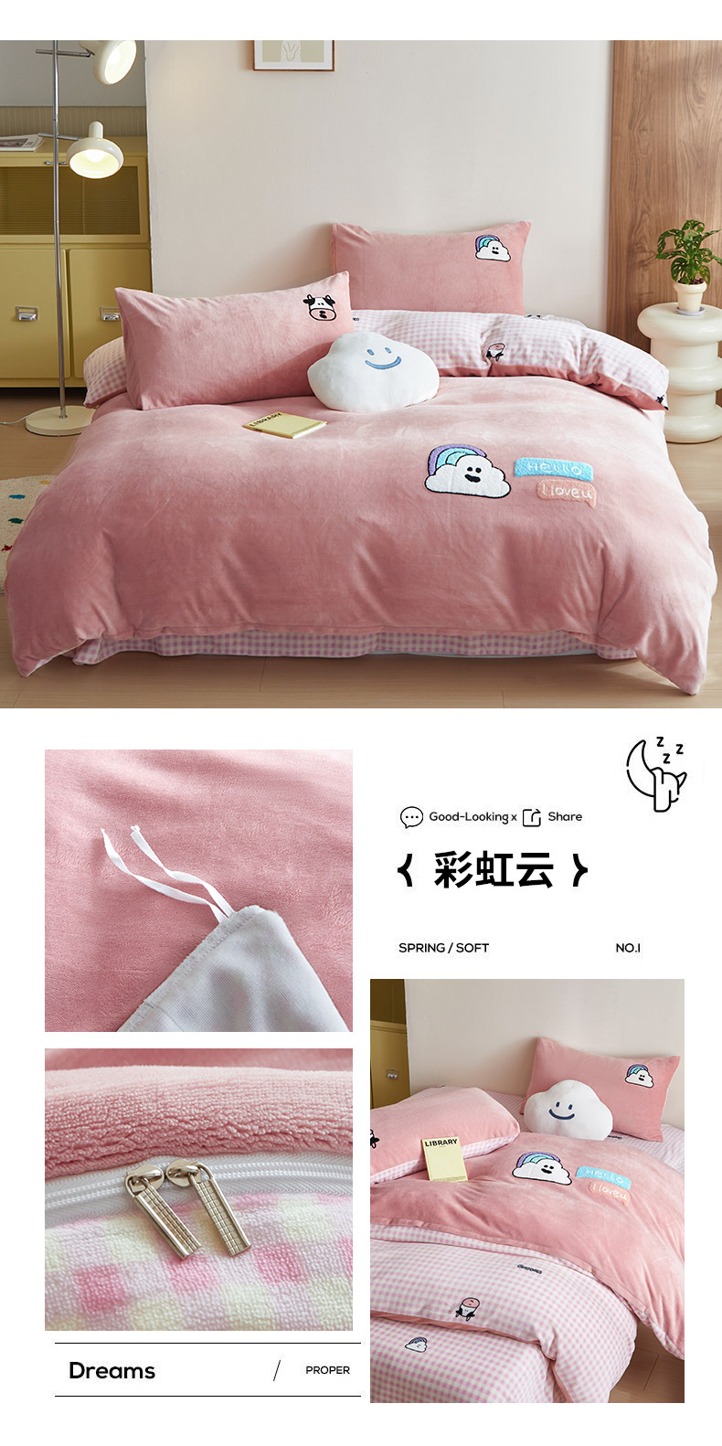商品名称:怡家居 2024新款简约印花加绣花牛奶绒毛巾绣四件套 彩虹云