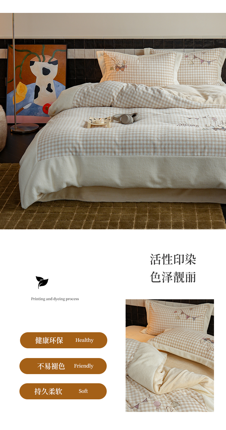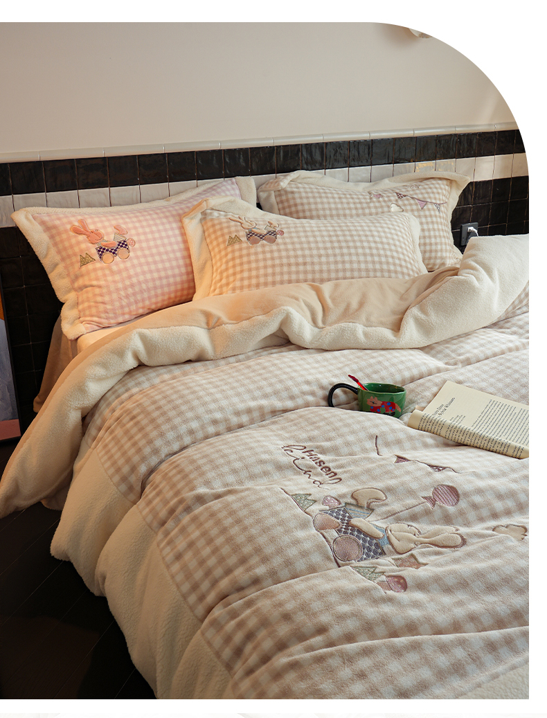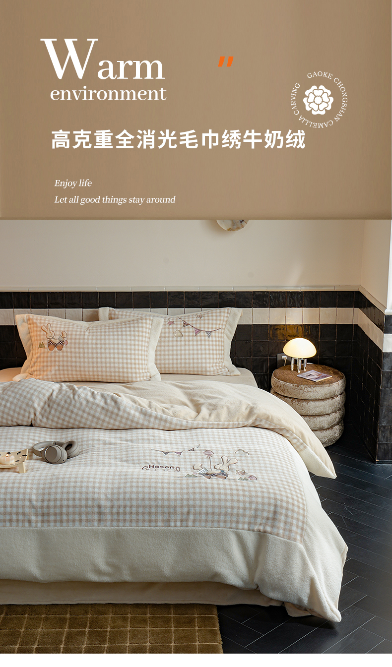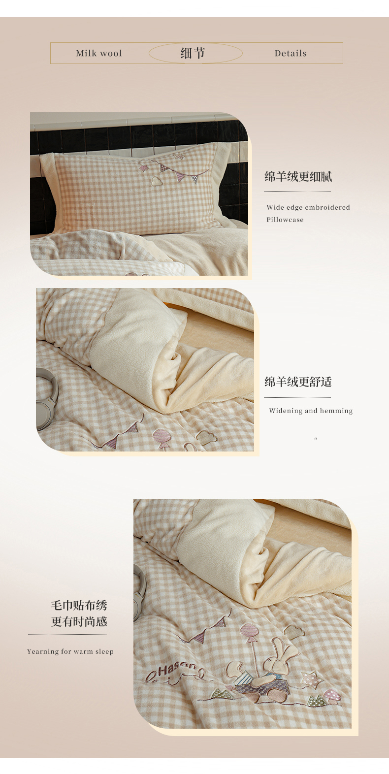 当前位置: 91家纺网 > 商品网购 > 床品套件 > 四件套 > 牛奶绒四件套 > 沐晴家纺 2024秋冬新品高克重牛奶绒拼色毛巾绣卡通绣花款绵羊绒四件套 假日兔兔-卡其