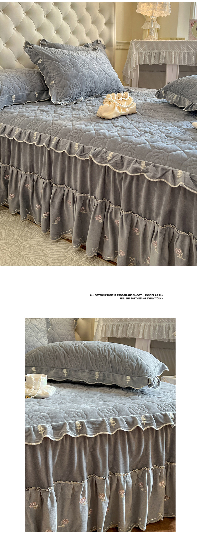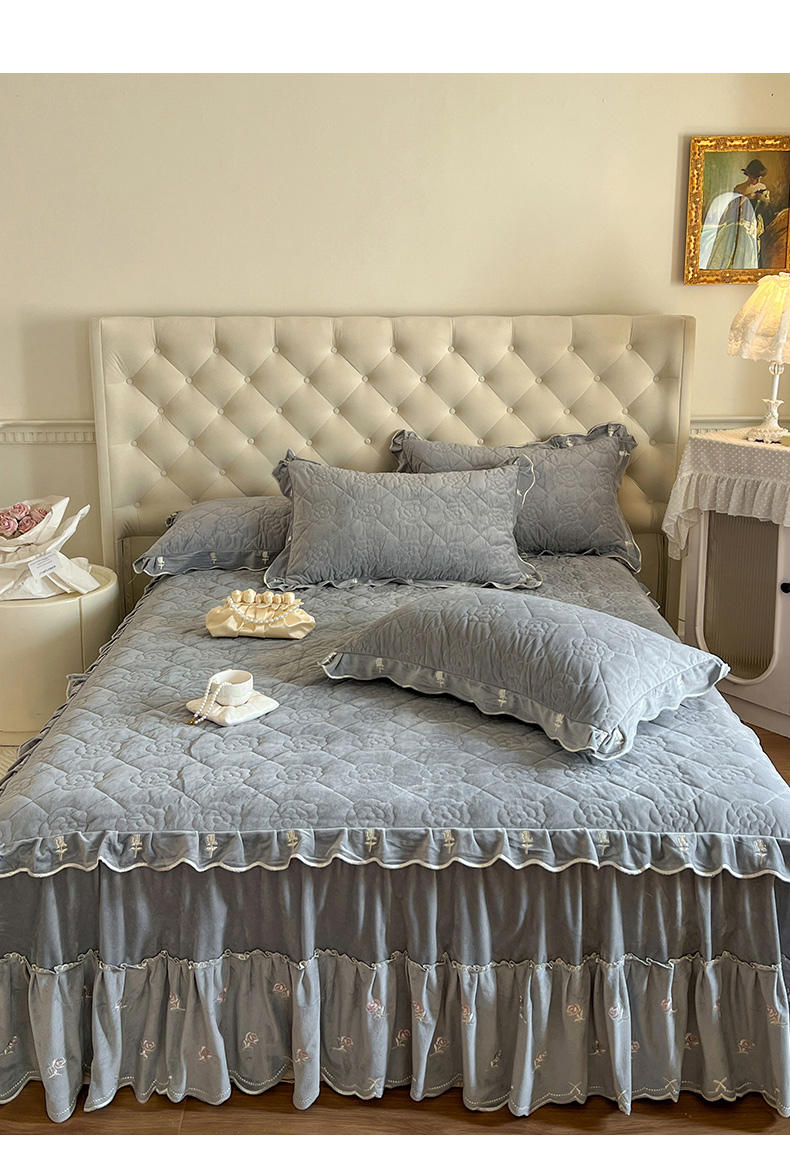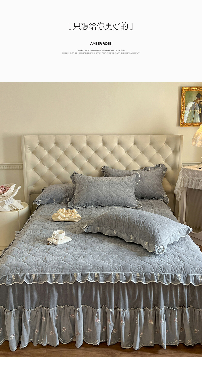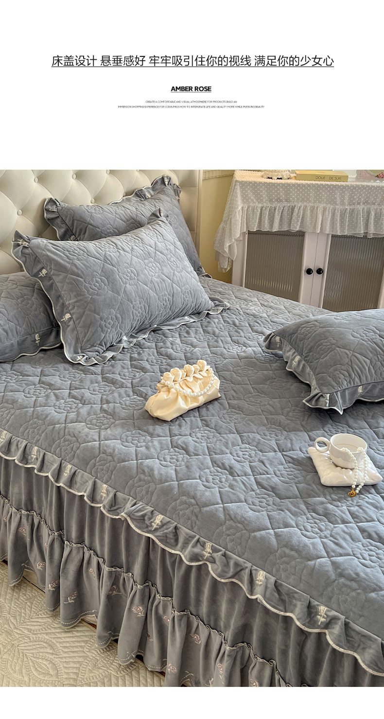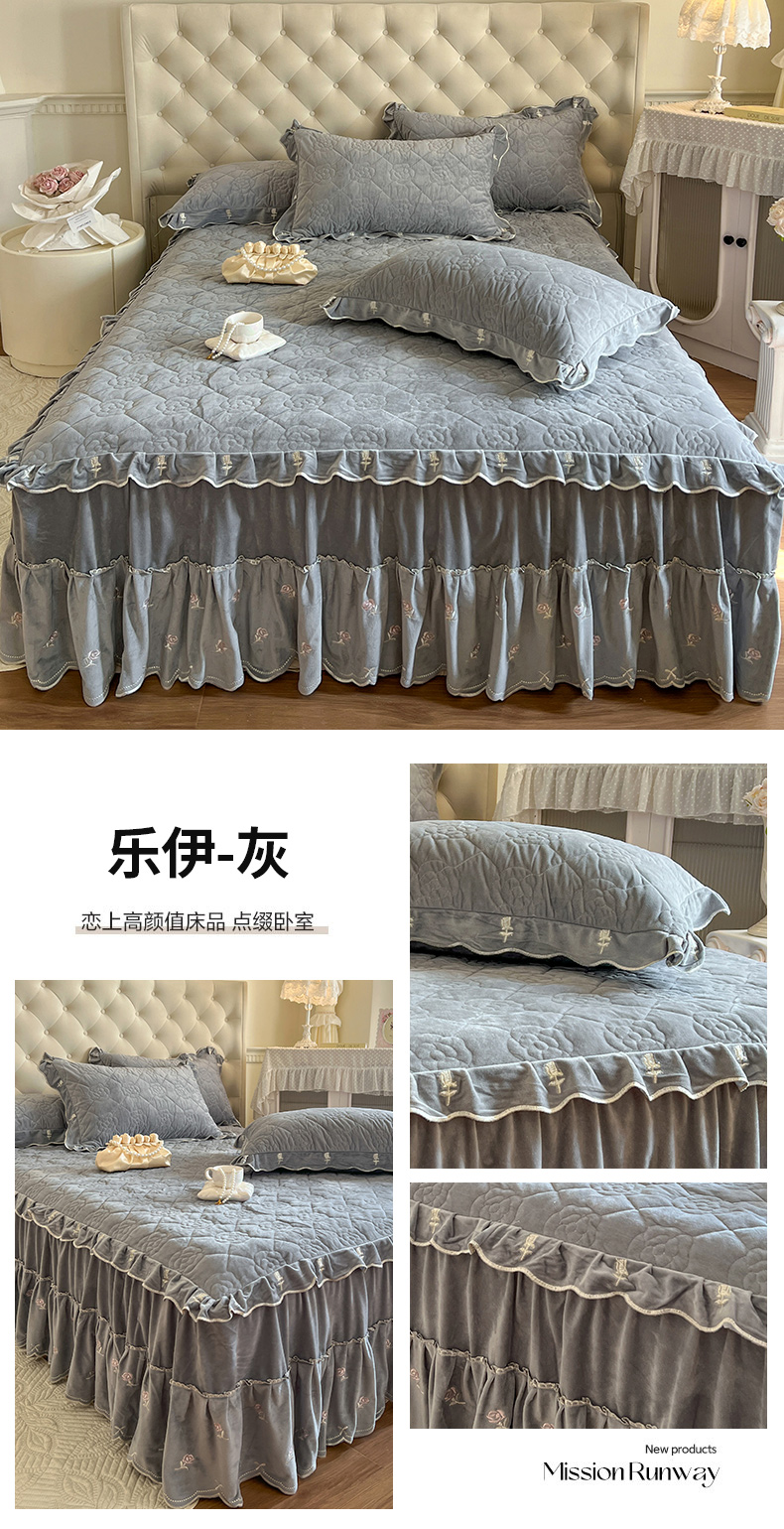 商品名称:网红馆(ck家纺) 2025新款高克重加厚保暖时尚花边宝宝绒乐伊系列床裙三件套 乐伊-灰