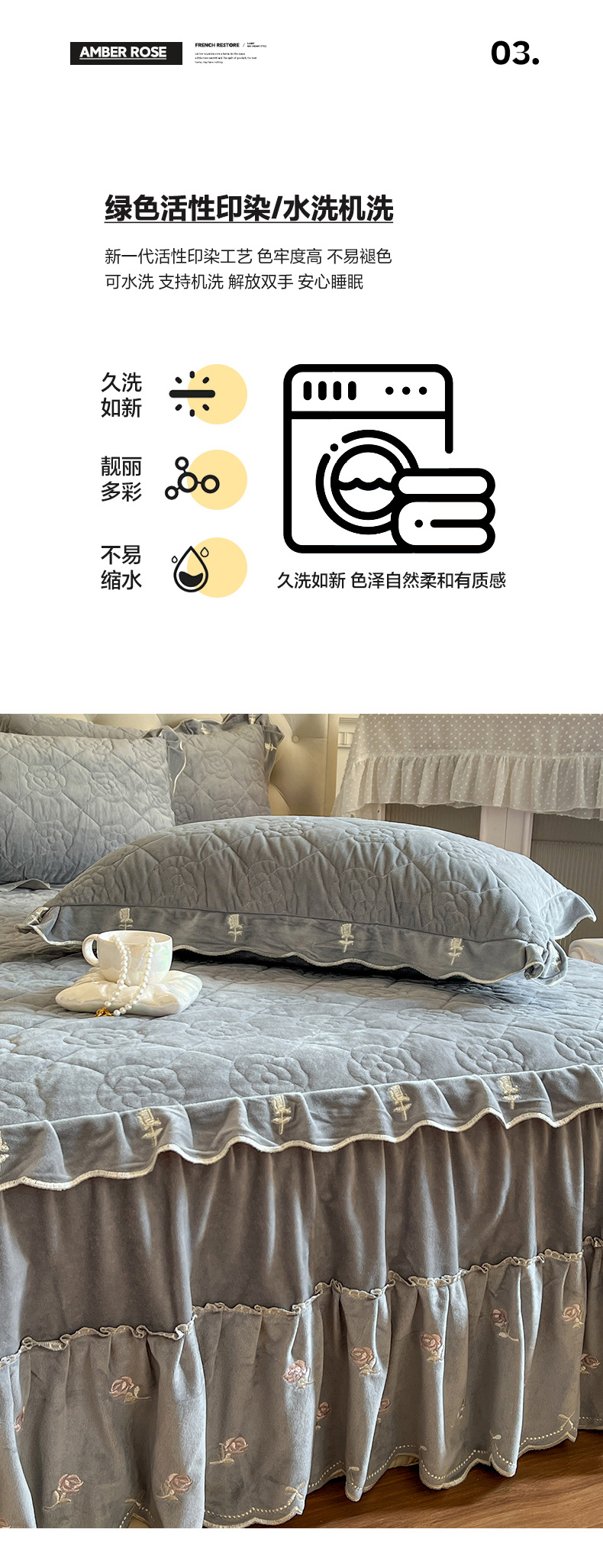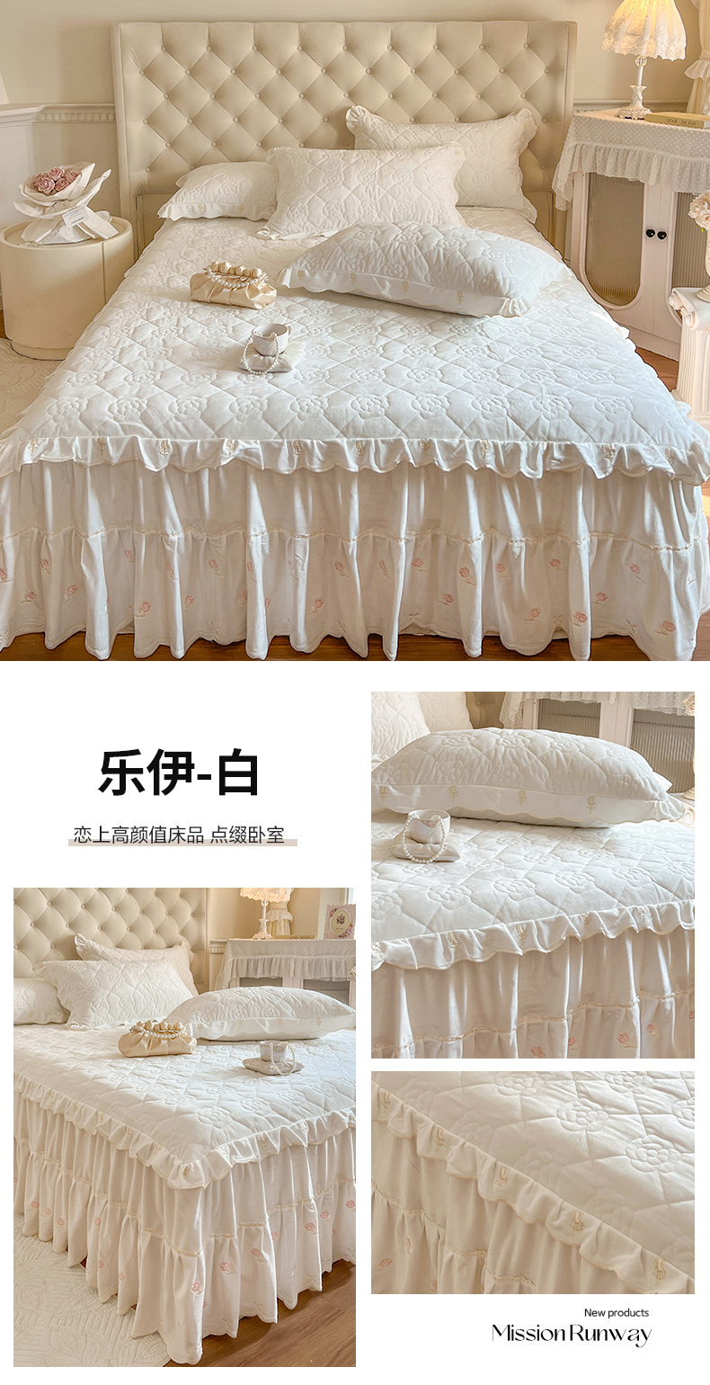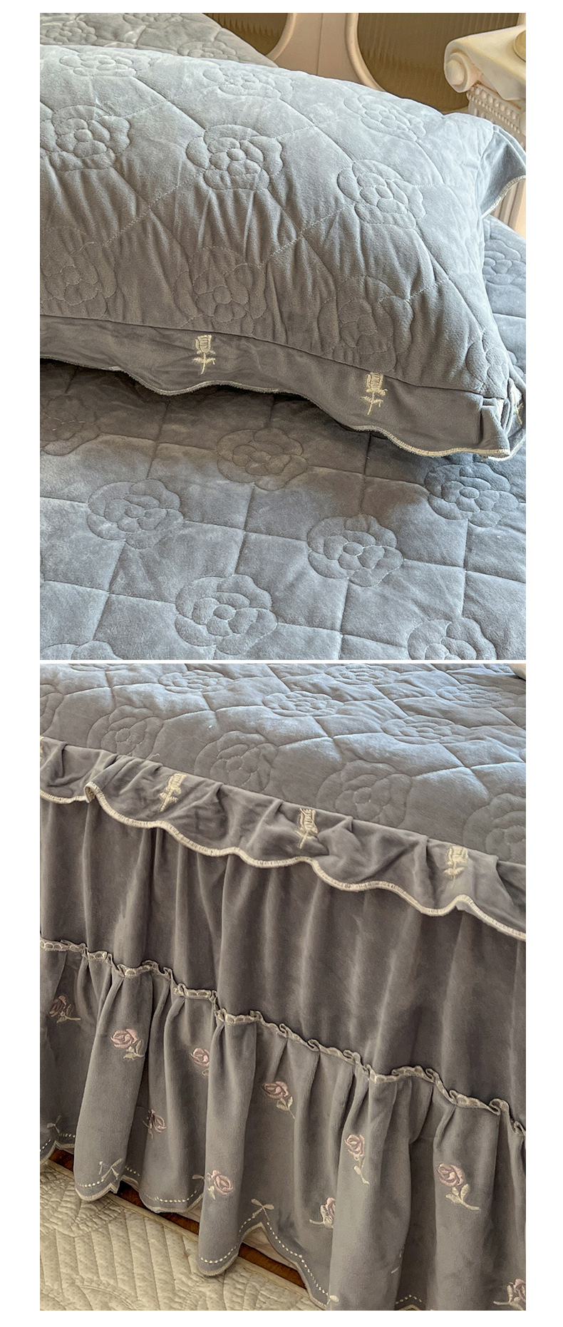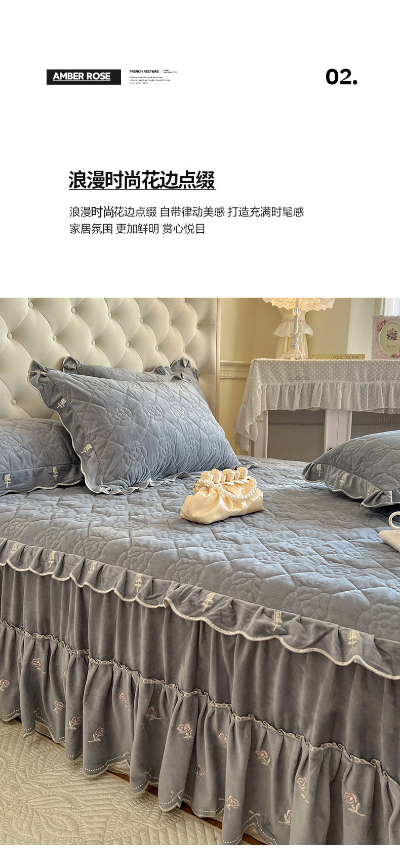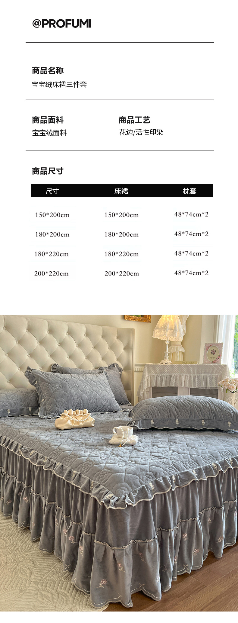 商品名称:网红馆(ck家纺) 2025新款高克重加厚保暖时尚花边宝宝绒乐伊系列床裙三件套 乐伊-灰