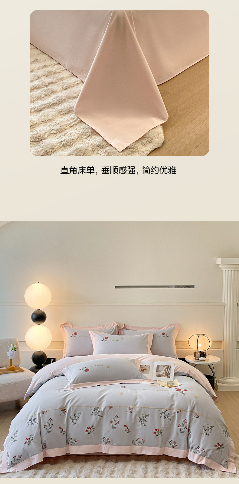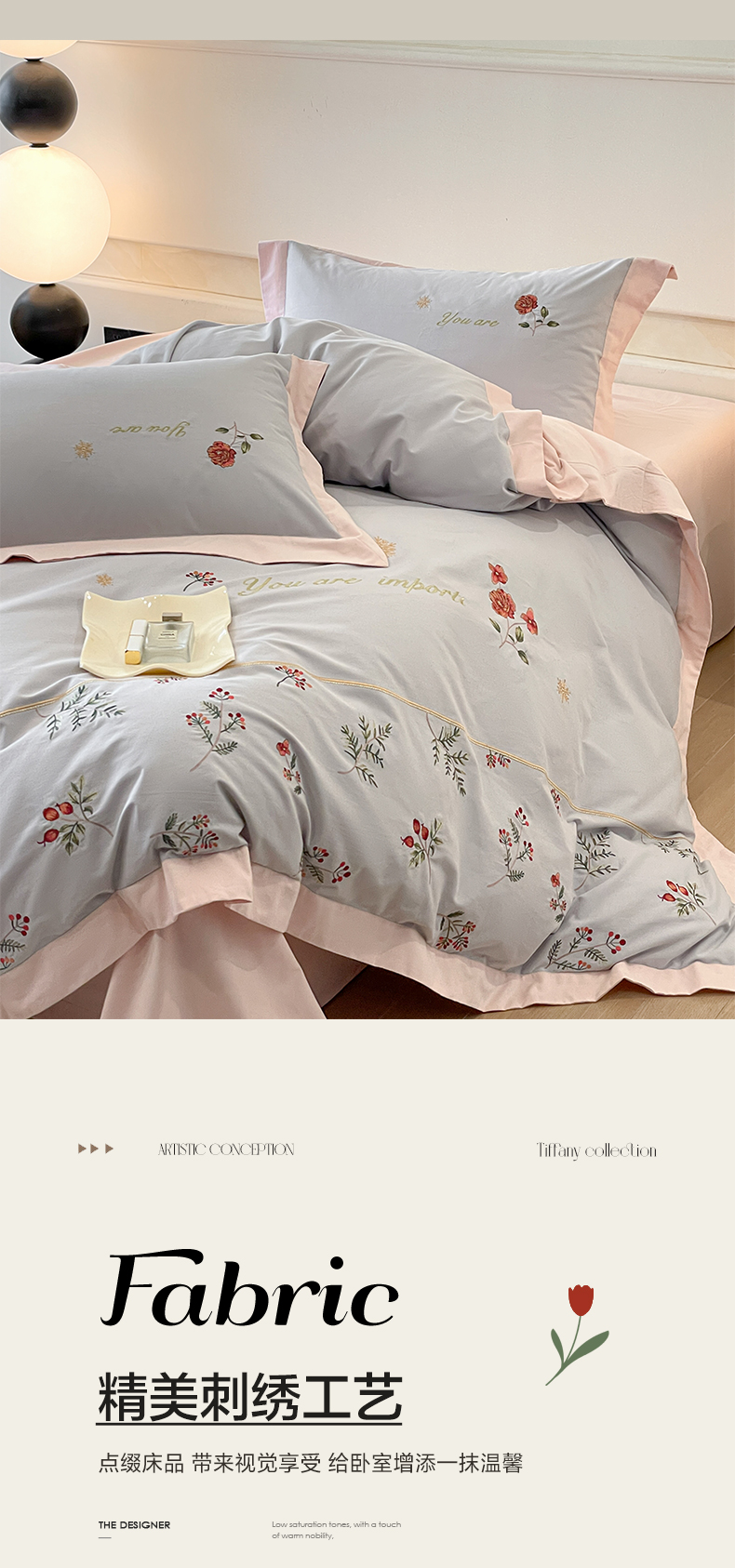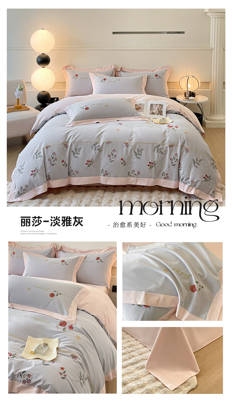 商品名称:遇见家居生活馆 2024新款A类全棉磨毛刺绣四件套-丽莎 丽莎-淡雅灰