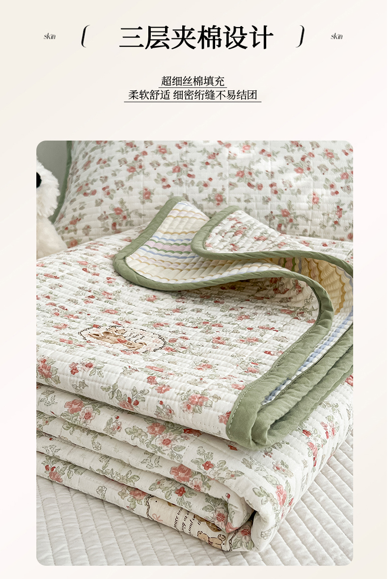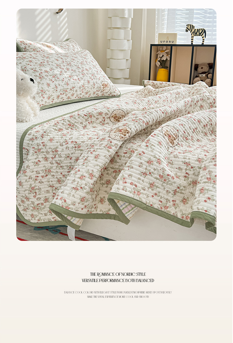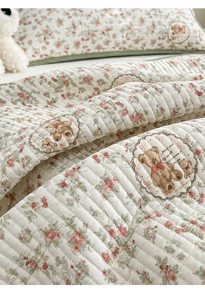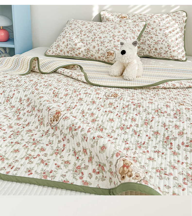 茉夕家纺 2025新款跑量款双面纯棉印花水洗床盖 清茶小熊米