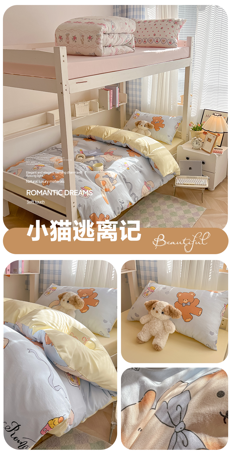 当前位置: 91家纺网 > 商品网购 > 床品套件 > 三件套 > 韩巢家纺 2025新款学生宿舍上下铺印花被套床单三件套 小猫逃离记