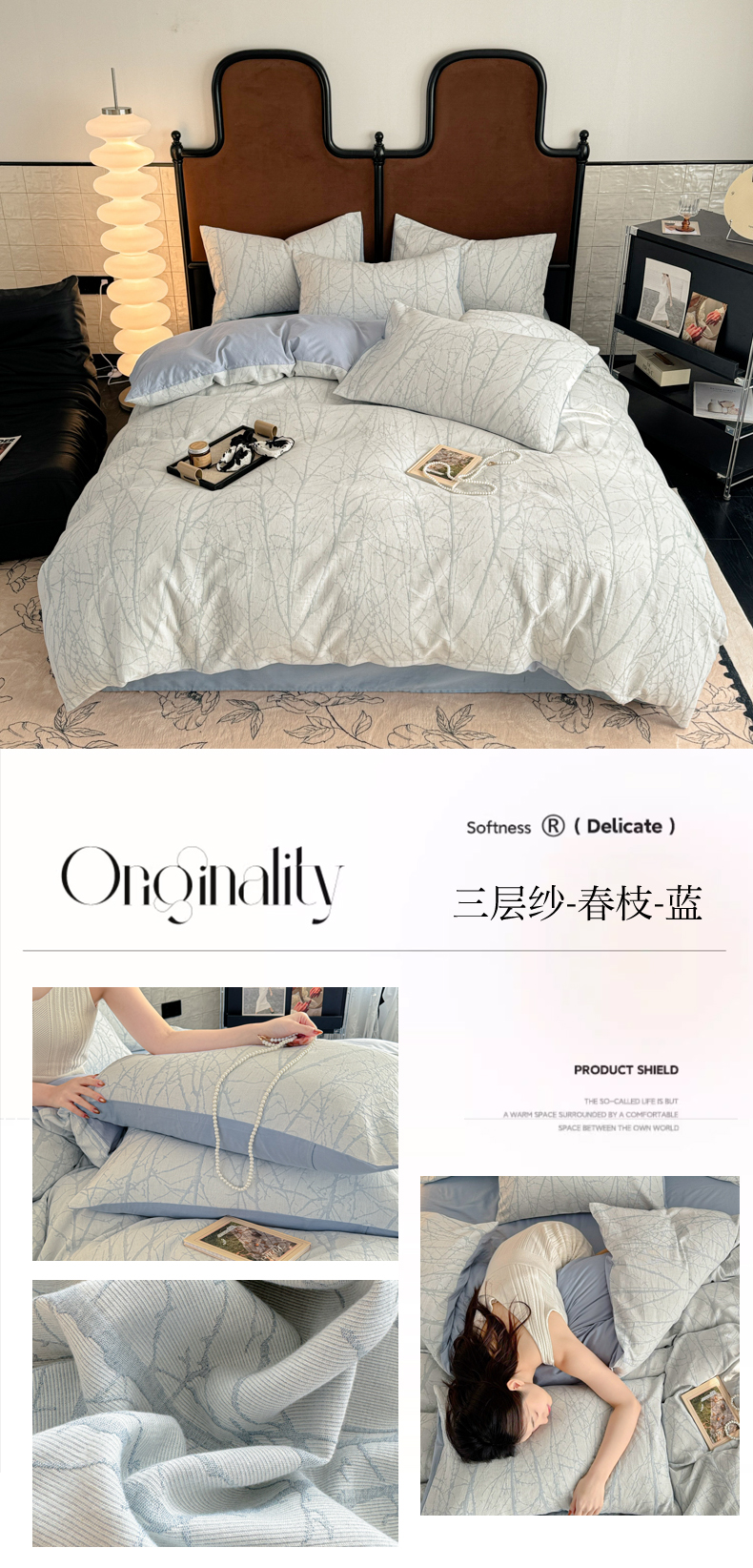 • 91家纺网 家纺一手货源 找家纺 眠博士2025新款AB版简约时尚A类全棉三层纱系列单被套 三层纱-翠竹-蓝