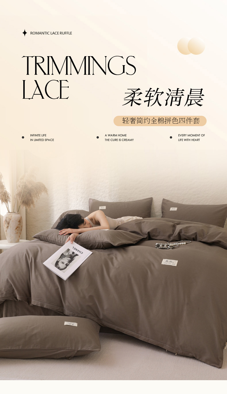 当前位置: 91家纺网 > 商品网购 > 床品套件 > 四件套 > 全棉普通四件套 > 眠博士 2025新款高支高密全棉双拼40支纯色四件套场景二 全棉拼色-春泥色