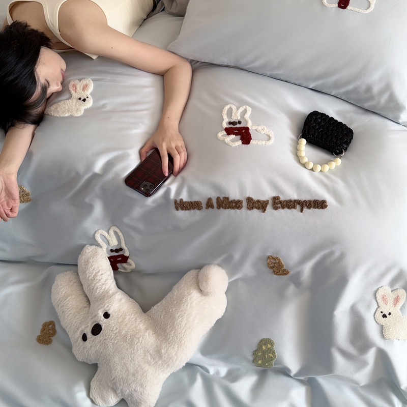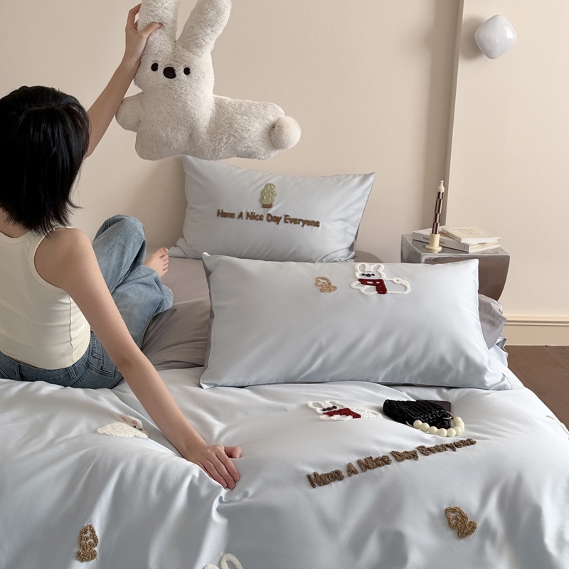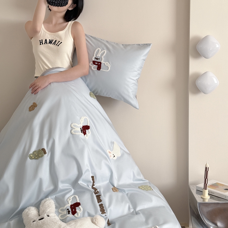 商品名称:鹿班家居 2025新款春夏款100S长绒棉毛巾绣四件套—小森林(标准会员-20元) 小森林-蓝色