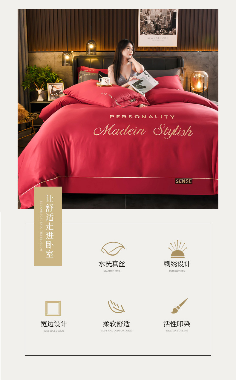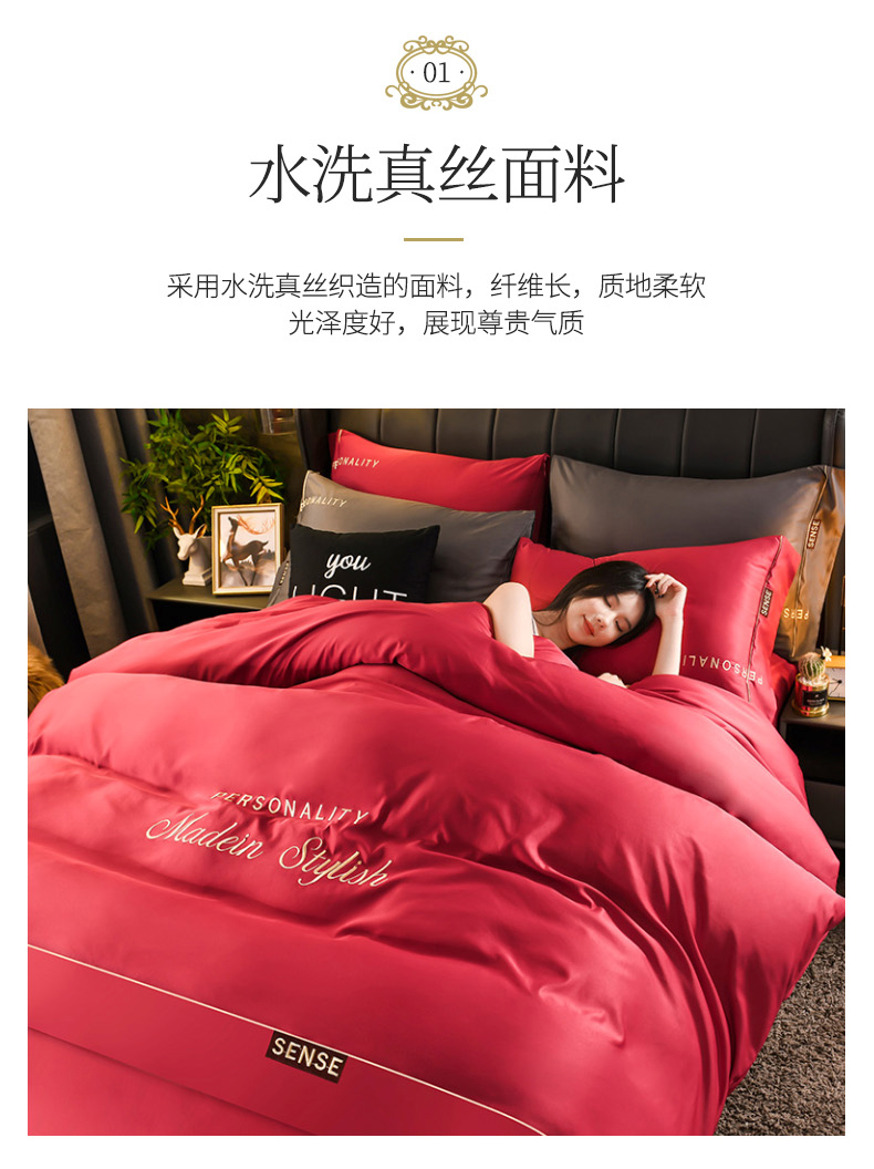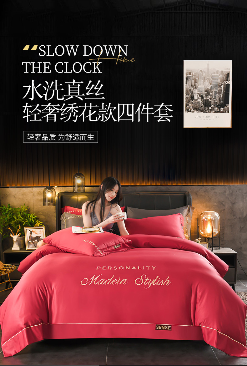 商品名称:睡美人 2025新款水洗真丝高端轻奢绣花款四件套-爱娜 爱娜-酒红色