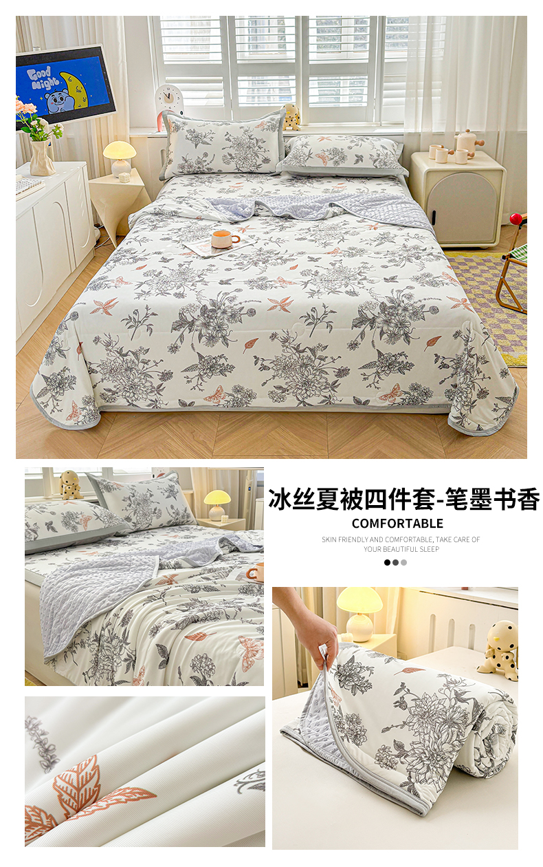 • 91家纺网 家纺一手货源 找家纺 雯豆2025春夏新款凉感丝夏被空调被子印花A类卡通小清新夏被 冰丝夏被四件套-笔墨书香