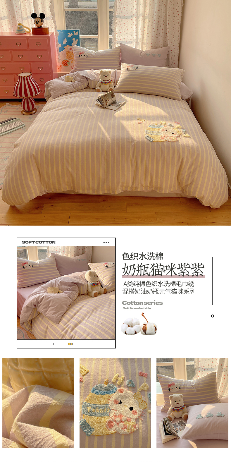 当前位置: 91家纺网 > 商品网购 > 床品套件 > 四件套 > 全棉普通四件套 > 桃子家居2025新款A类纯棉色织水洗棉毛巾绣猫咪混搭奶油奶瓶元气猫咪 色织水洗棉-奶瓶猫咪紫紫