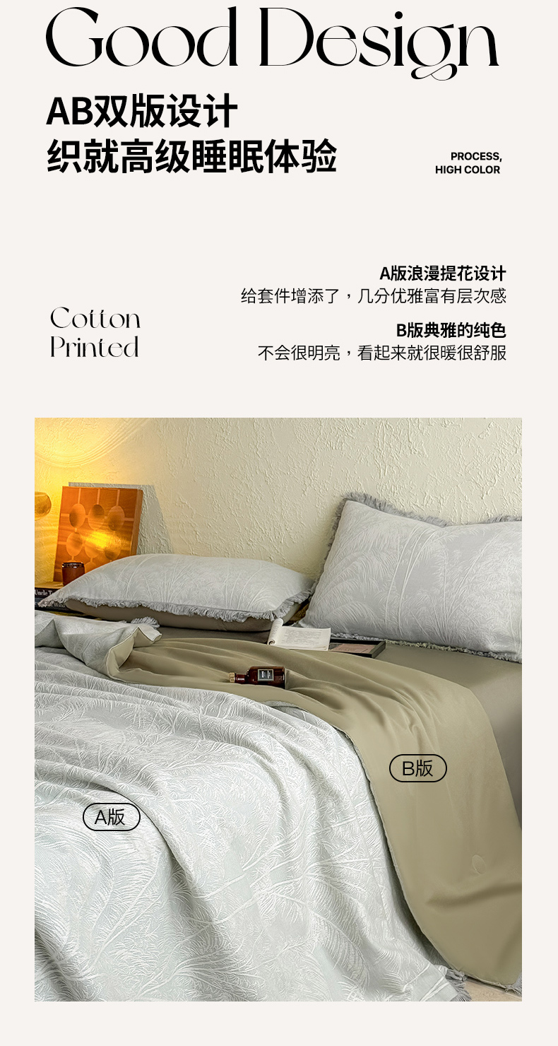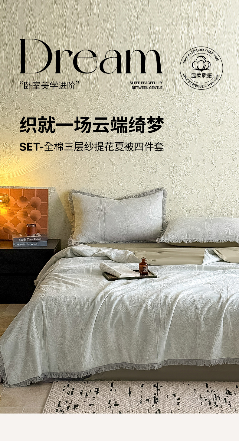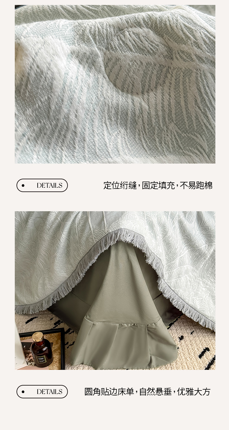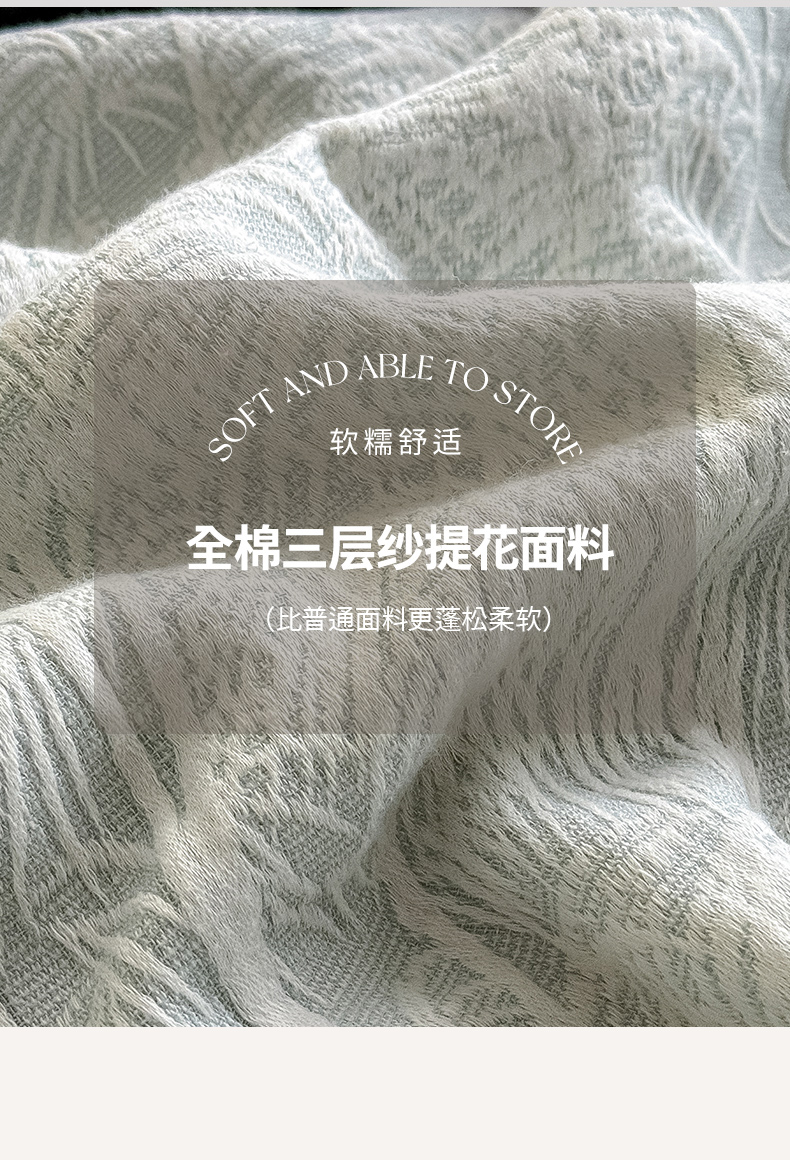 当前位置: 91家纺网 > 商品网购 > 床品套件 > 四件套 > 全棉活性四件套 > 2025新款全棉三层纱提花夏被四件套 竹影-茶绿