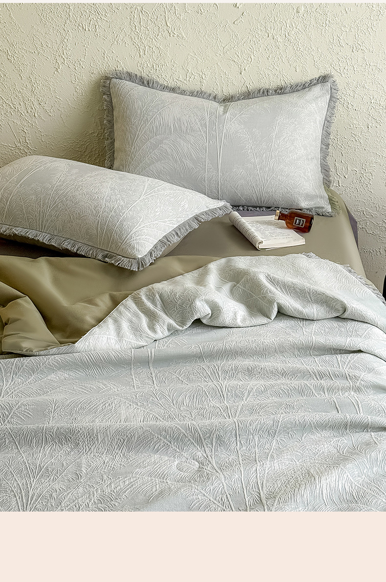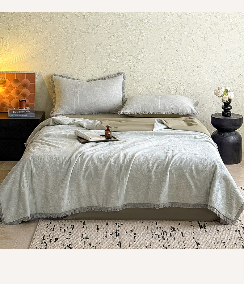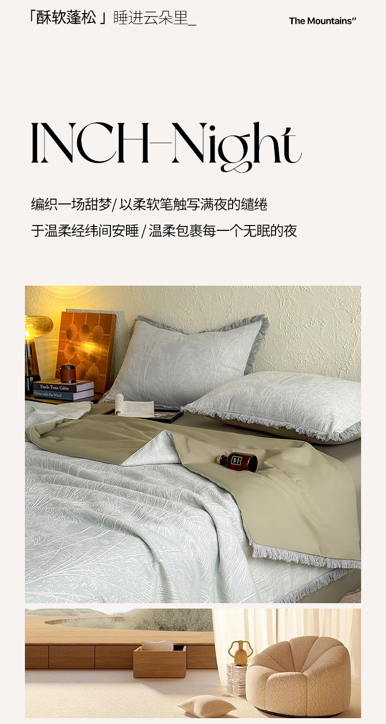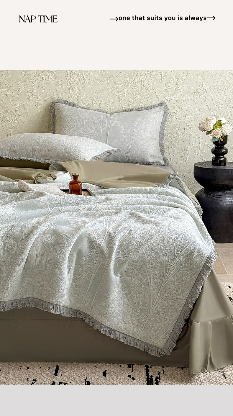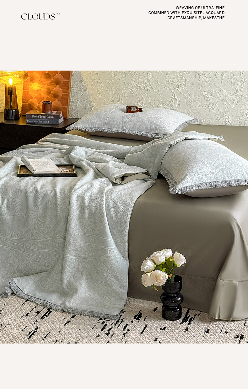 当前位置: 91家纺网 > 商品网购 > 床品套件 > 四件套 > 全棉活性四件套 > 2025新款全棉三层纱提花夏被四件套 竹影-茶绿