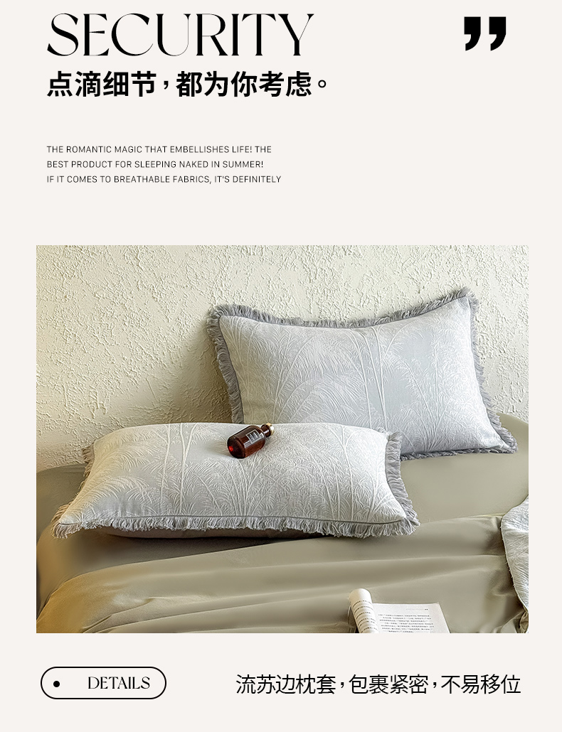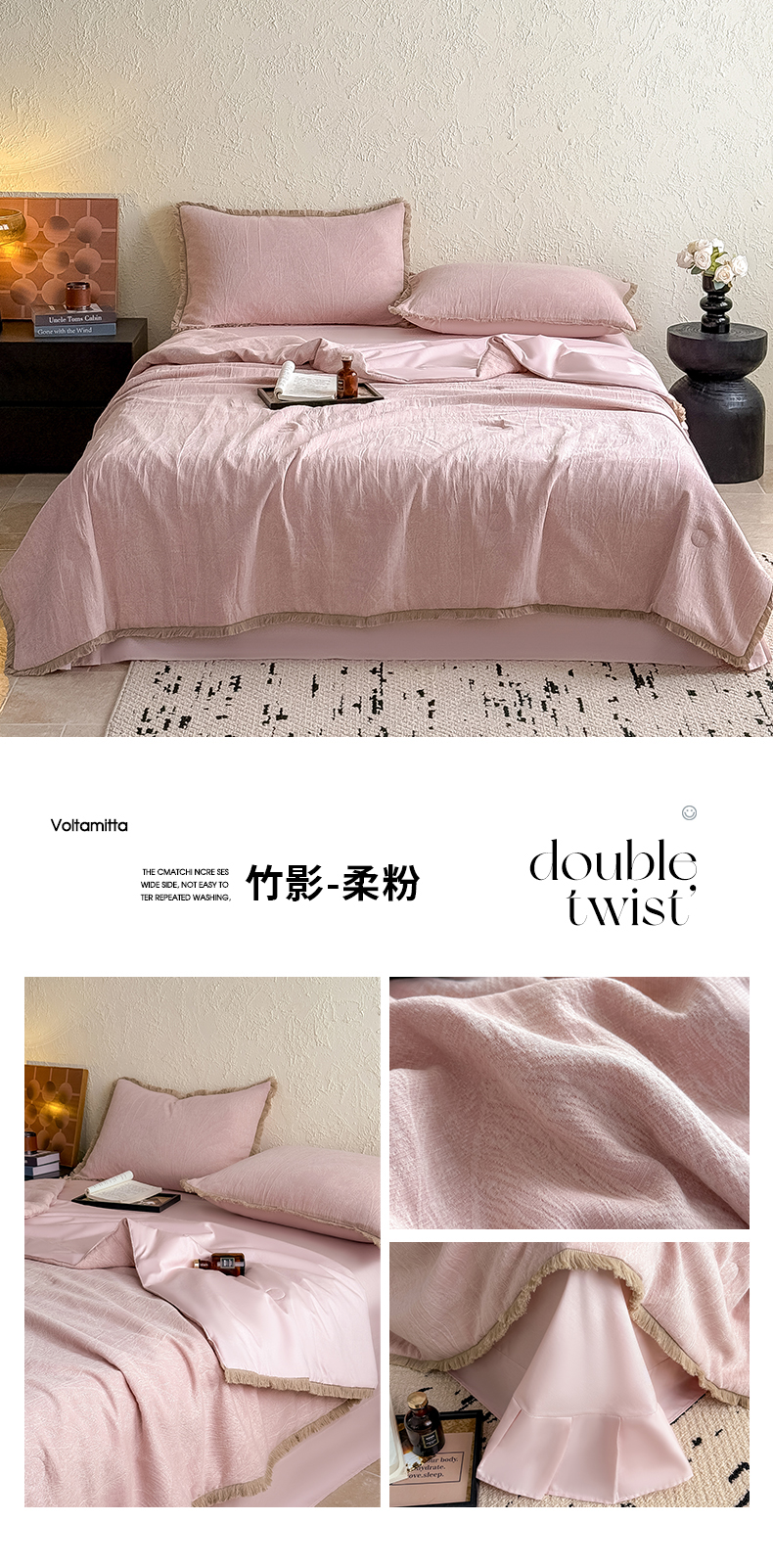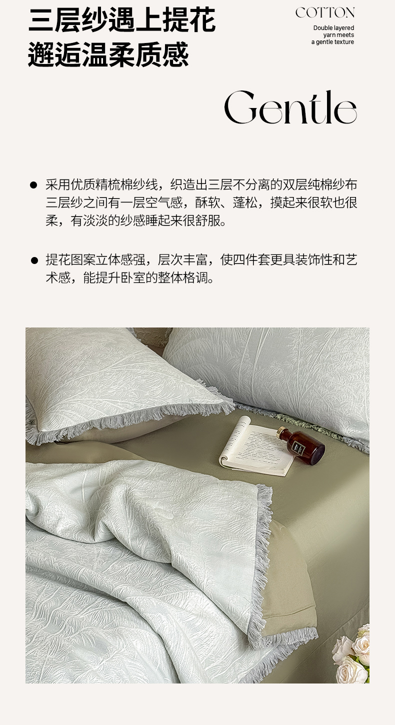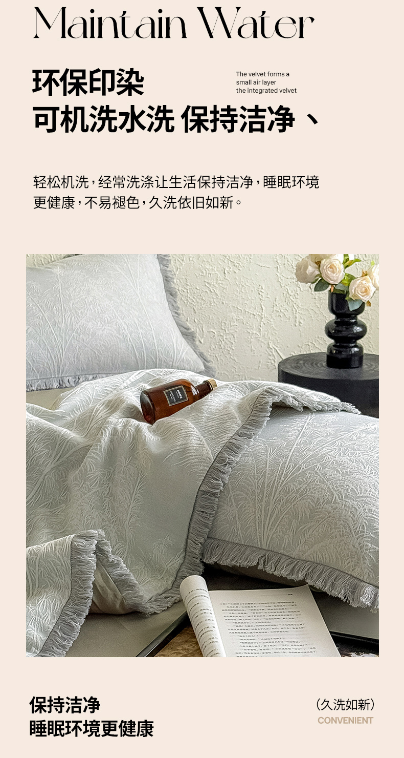 当前位置: 91家纺网 > 商品网购 > 床品套件 > 四件套 > 全棉活性四件套 > 2025新款全棉三层纱提花夏被四件套 竹影-茶绿