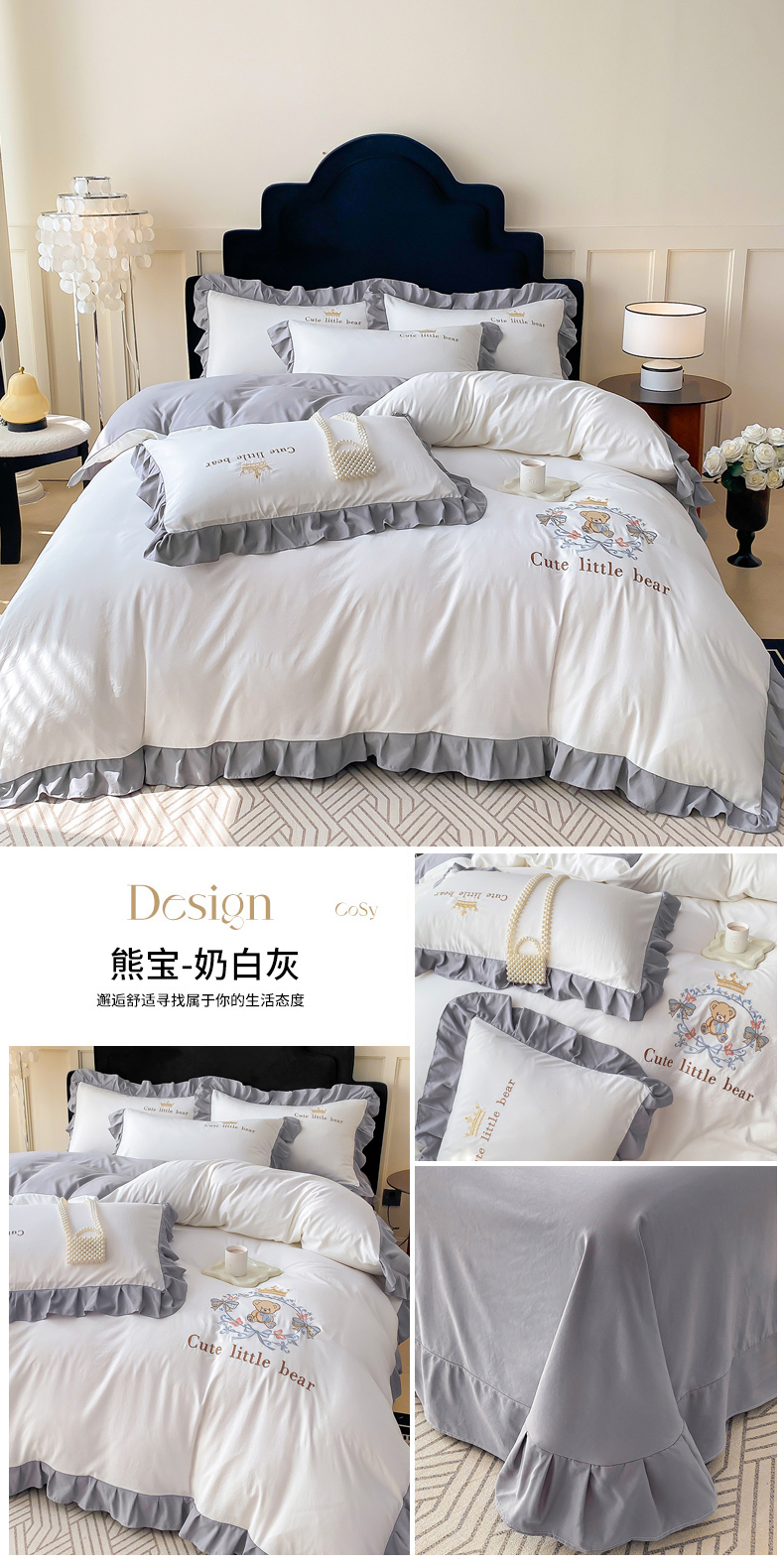 商品名称:帝菲妮 2025新款法式韩版高克重超柔水洗棉针织棉糯小棉刺绣四件套 熊宝-奶白灰