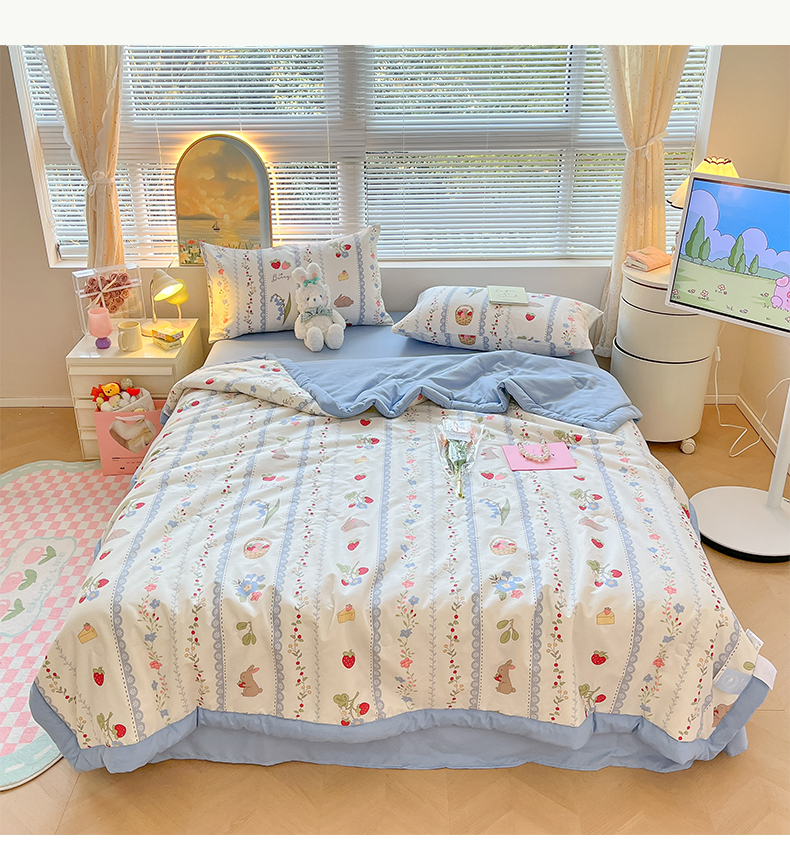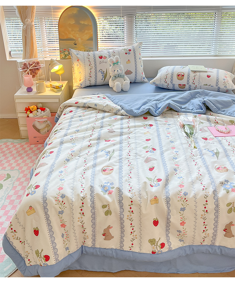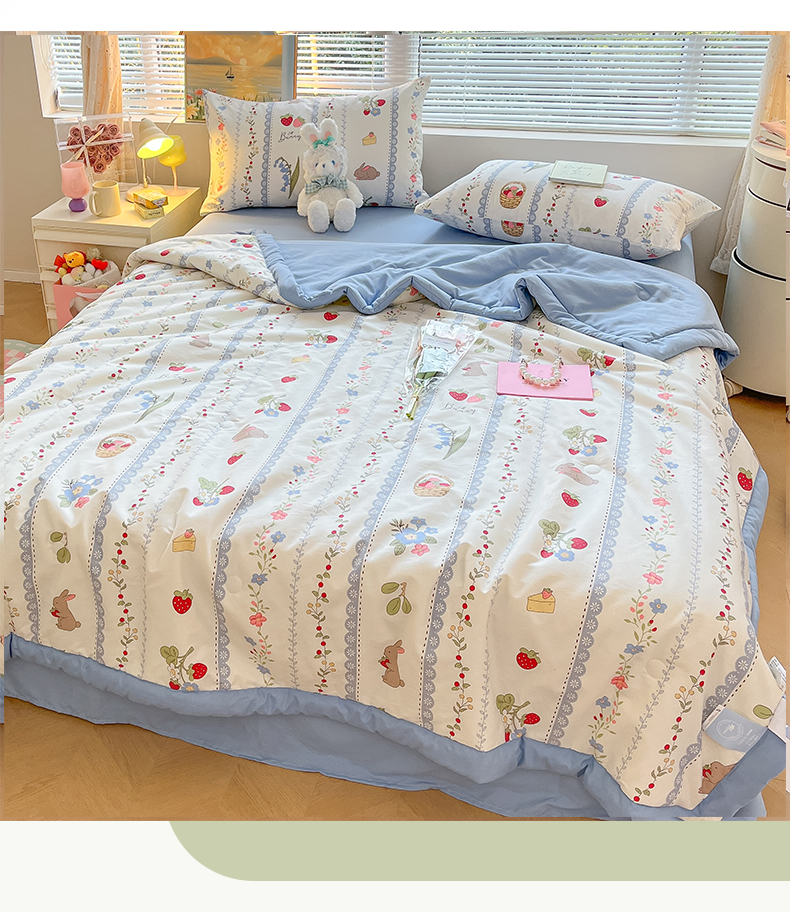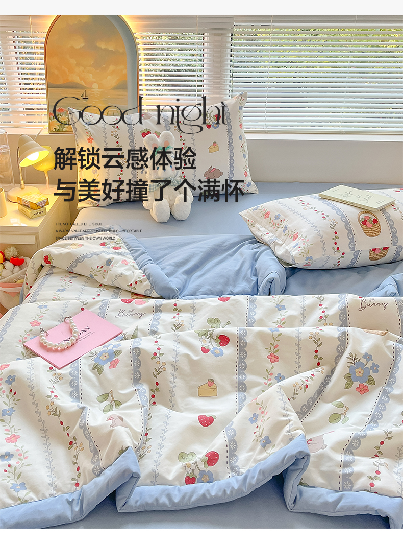 当前位置: 91家纺网 > 商品网购 > 床品套件 > 四件套 > 夏被四件套 > 一加一 2025新款A棉B水洗棉大豆夏被四件套 草莓兔