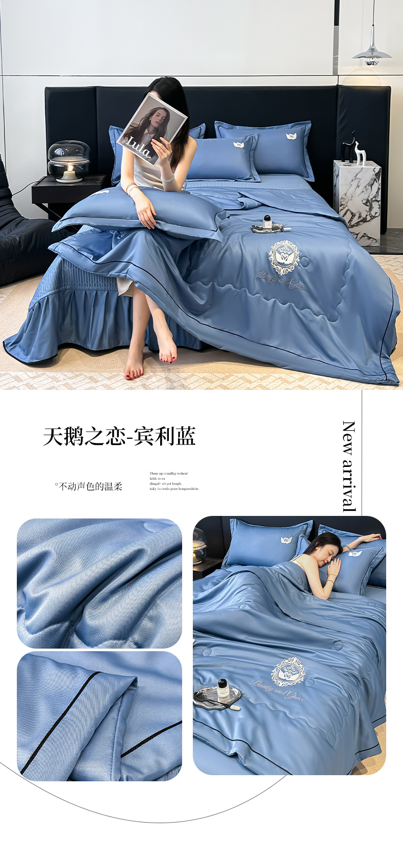 商品名称:富米莱(原臻工厂) 2025新款水洗真丝冰丝刺绣夏被床盖四件套夏凉被 天鹅之恋-宾利蓝