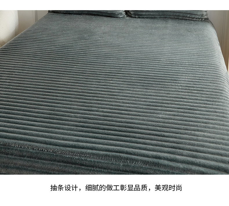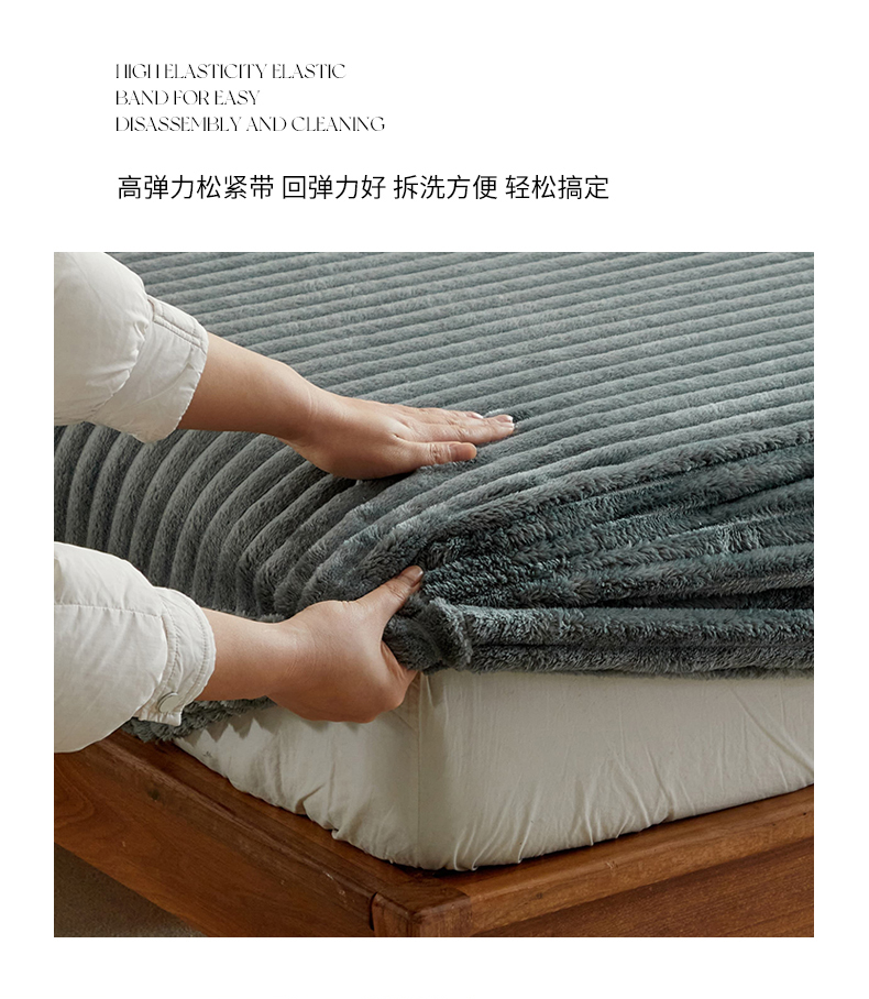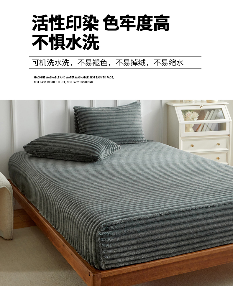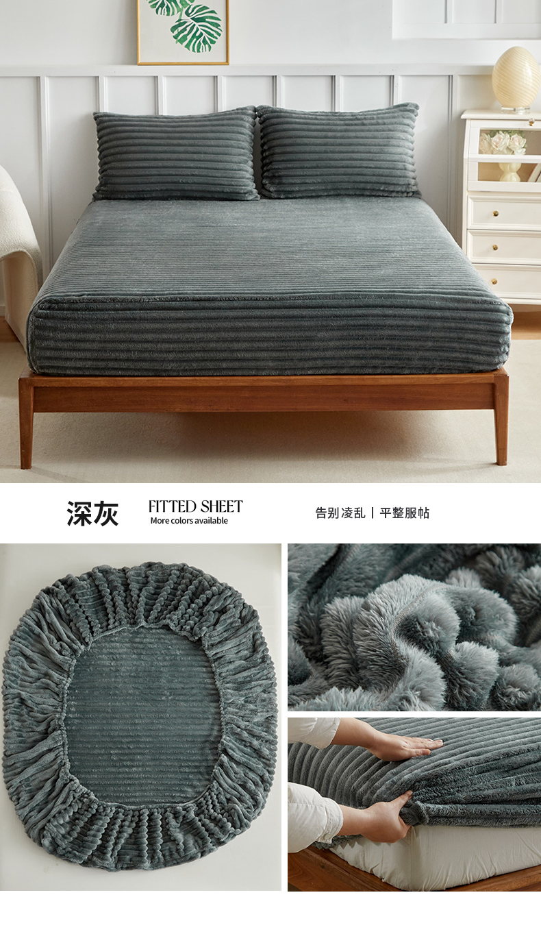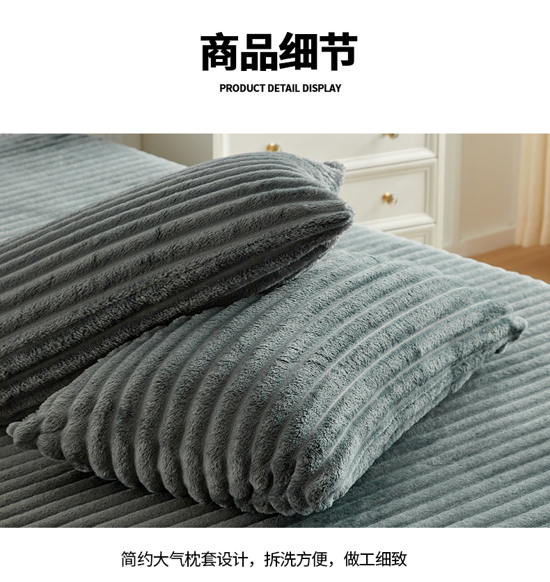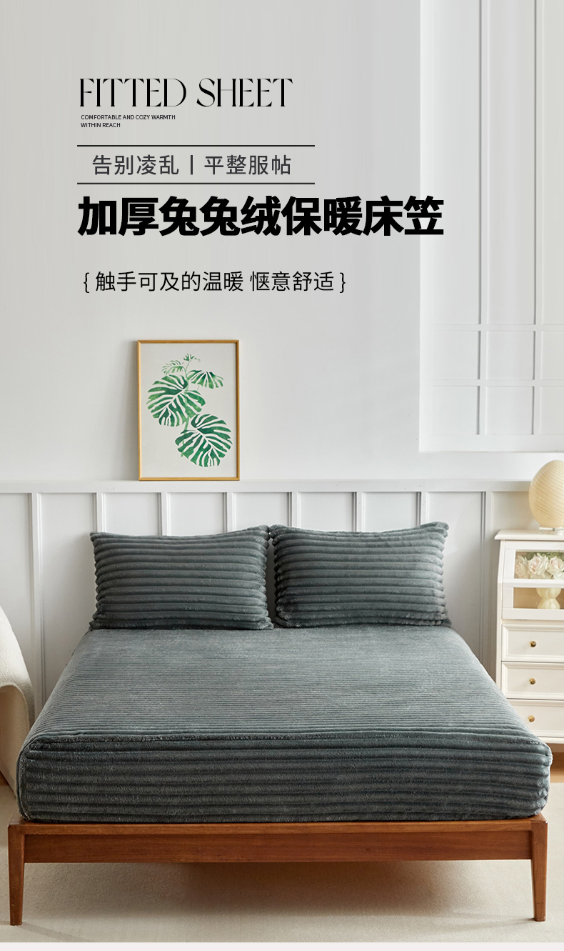 商品名称:枋梢家纺 2025新款爆款仿兔毛抽条床笠三件套跨境电商外贸欧美尺寸双面绒兔兔绒三件套 深灰
