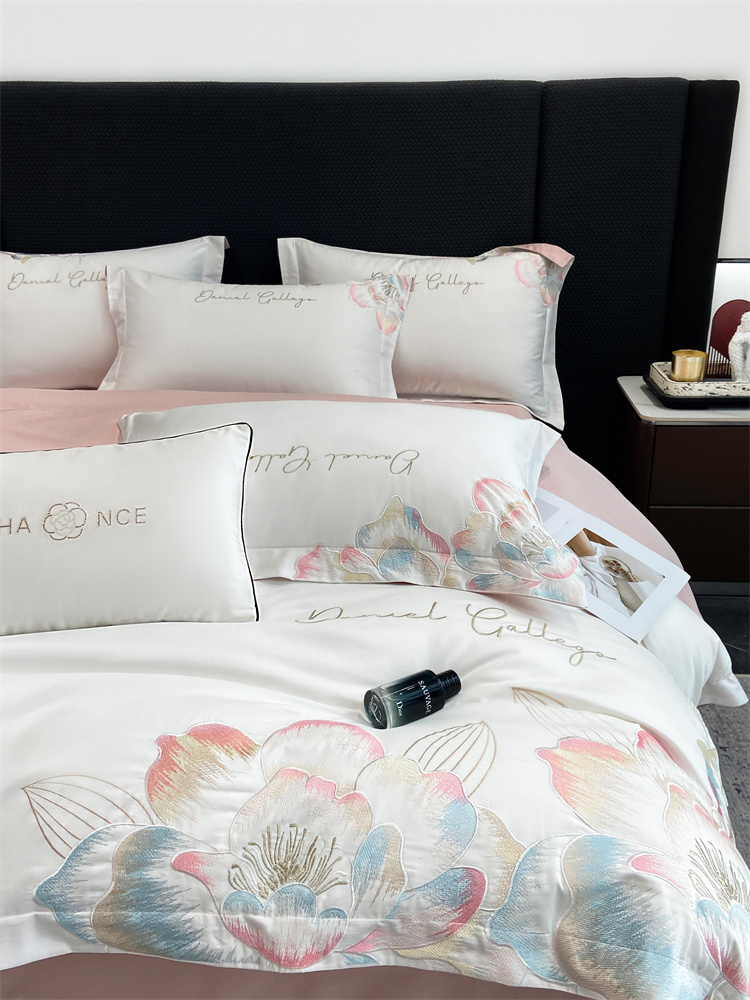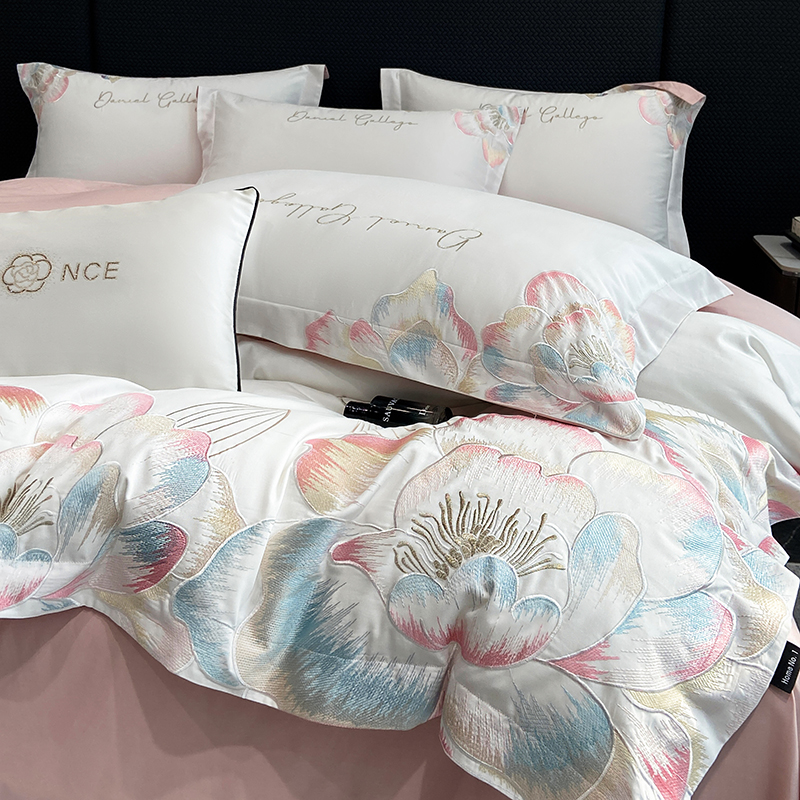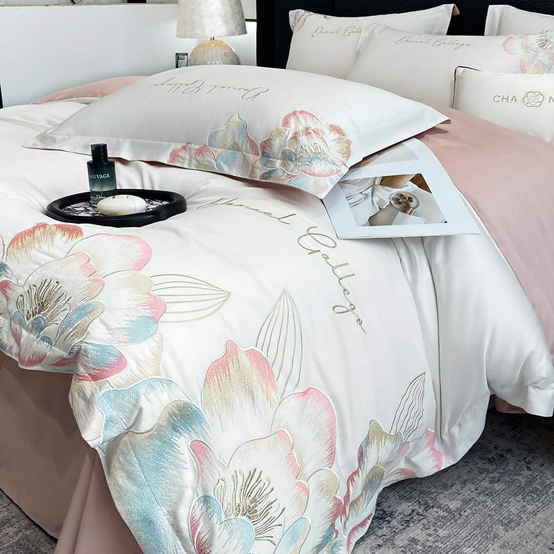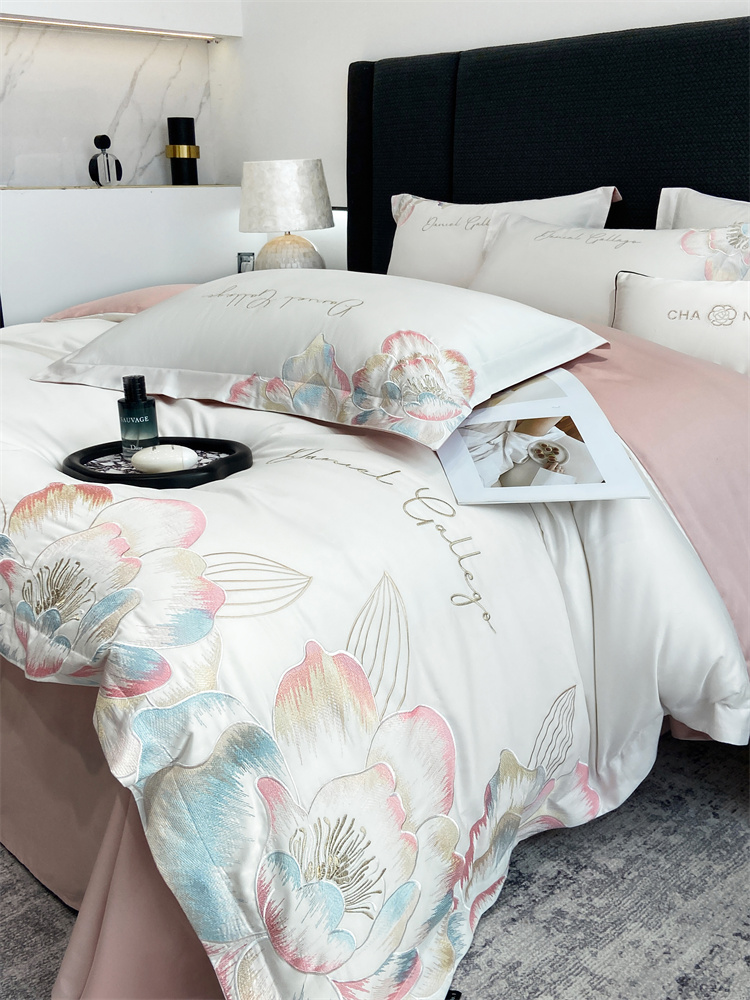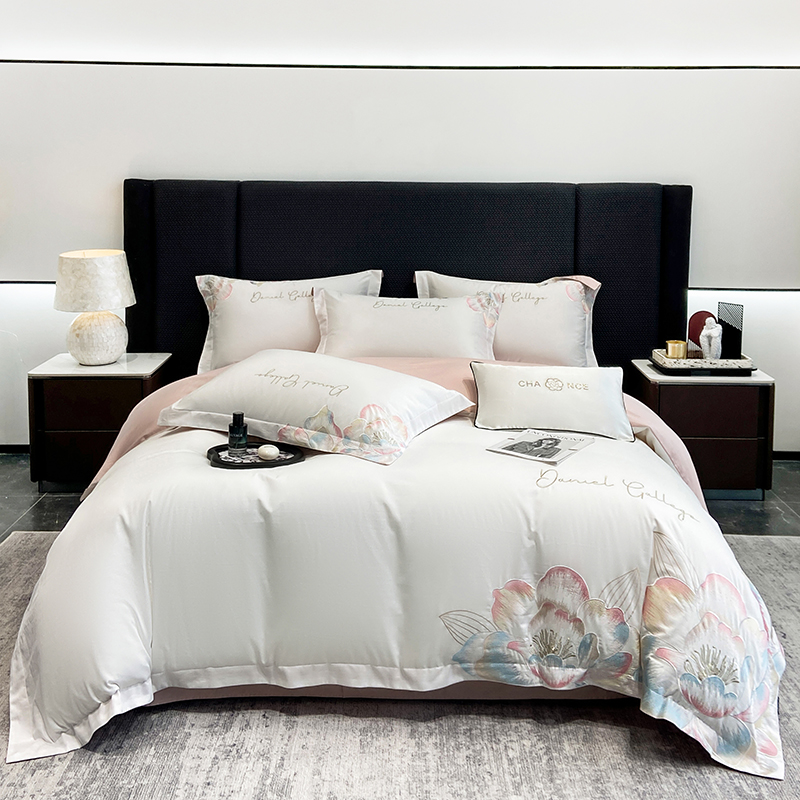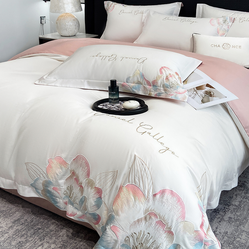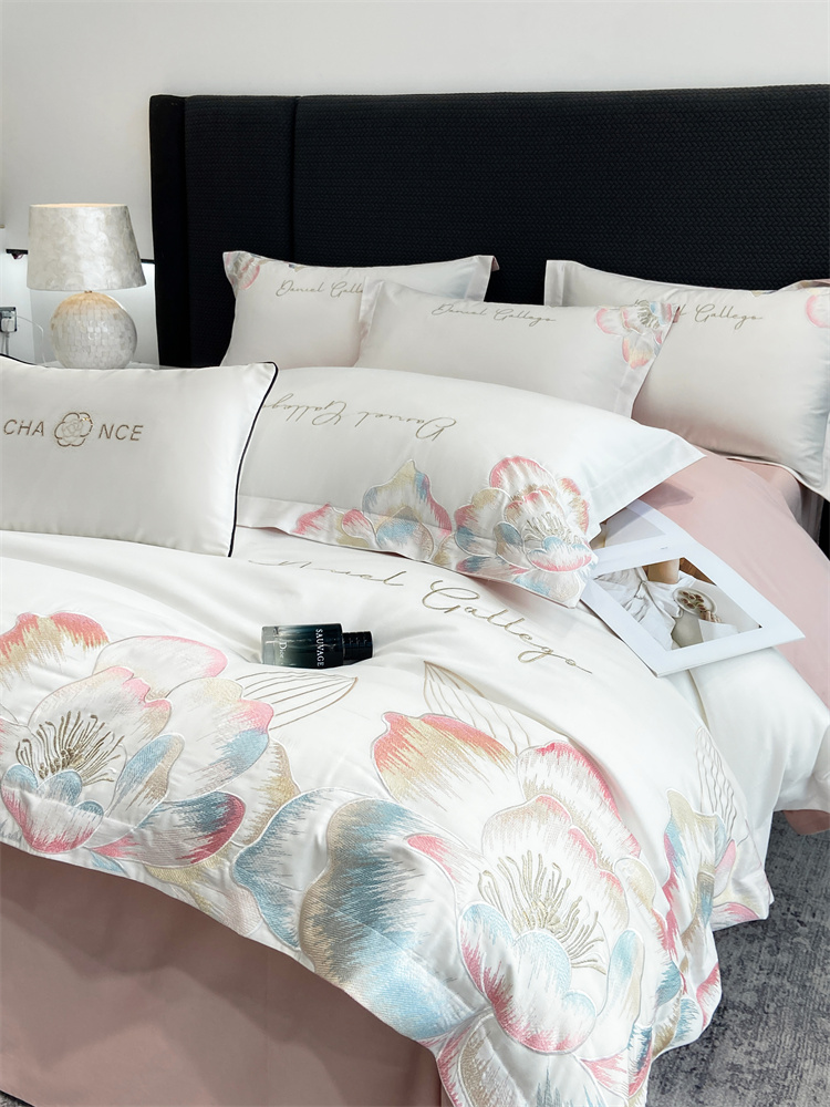 当前位置: 91家纺网 > 商品网购 > 床品套件 > 四件套 > 全棉普通四件套 > 家居1号家纺 2025新款花韵长绒棉四件套 花韵-白拼粉