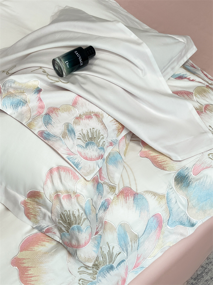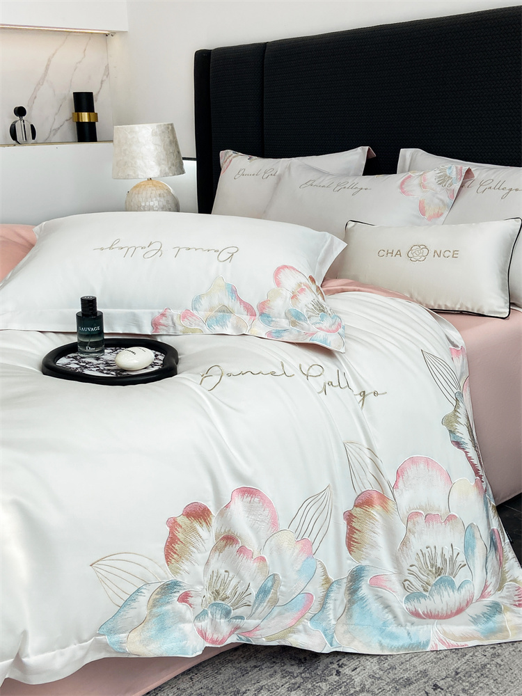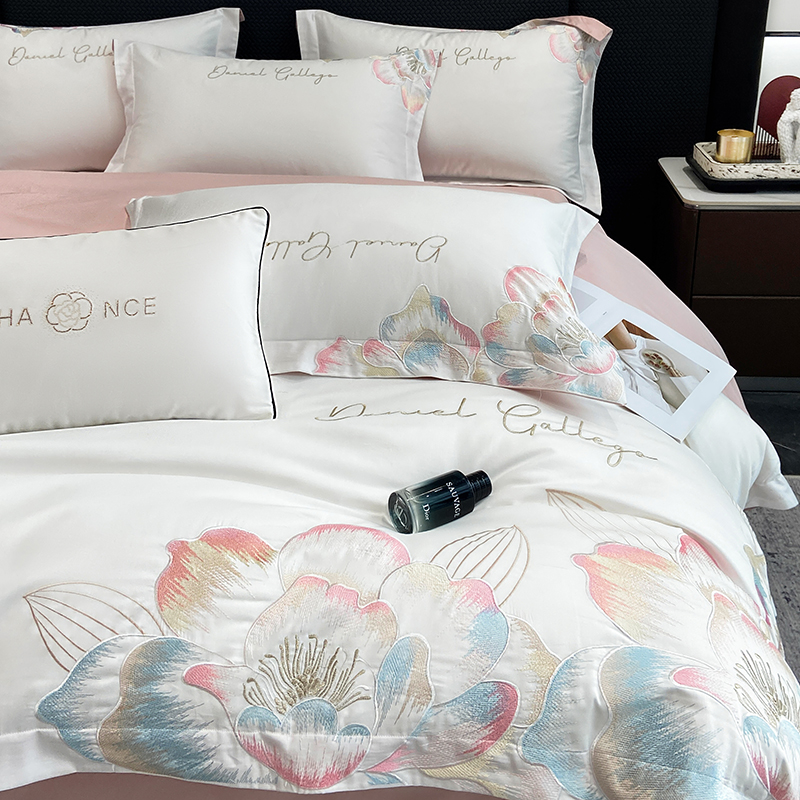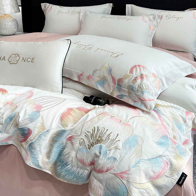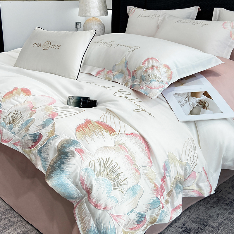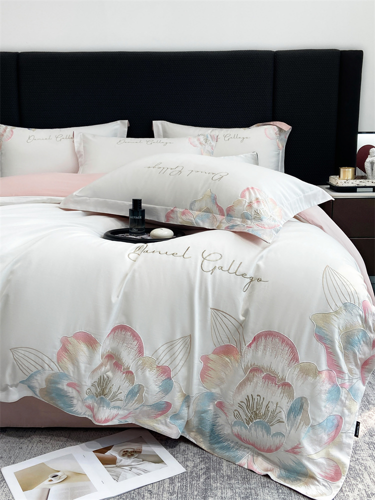 当前位置: 91家纺网 > 商品网购 > 床品套件 > 四件套 > 全棉普通四件套 > 家居1号家纺 2025新款花韵长绒棉四件套 花韵-白拼粉