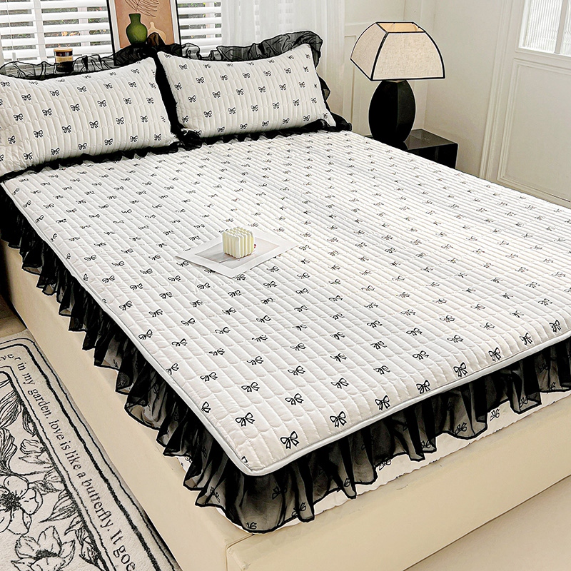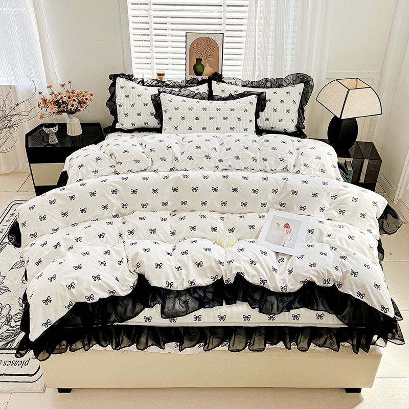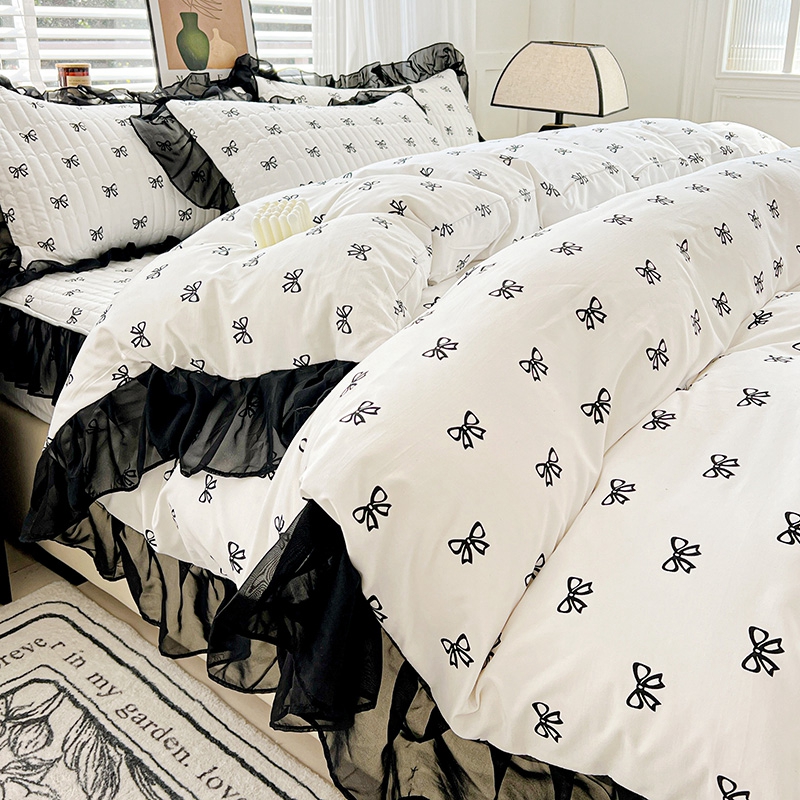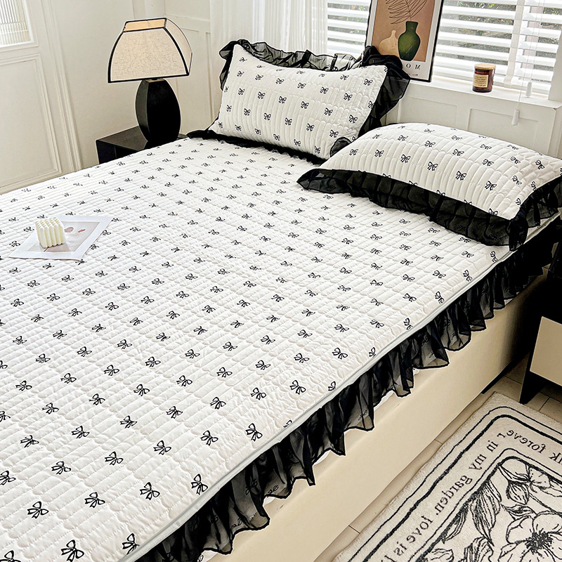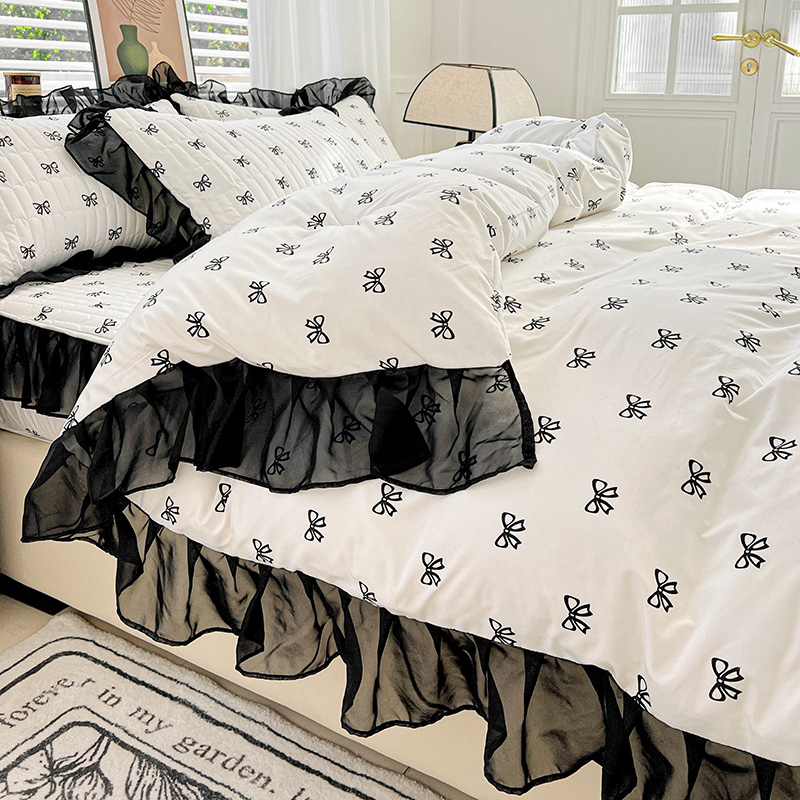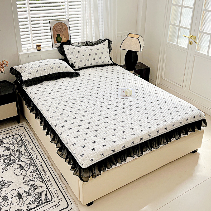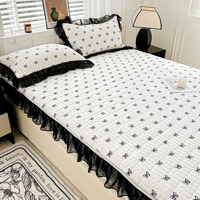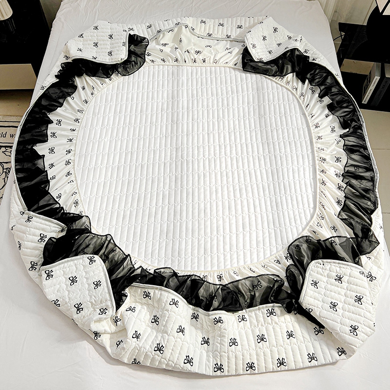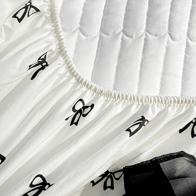 艾橙家纺2025新款法式赫本风水洗棉印花雪纺花边单床笠 黑色蝴蝶结
