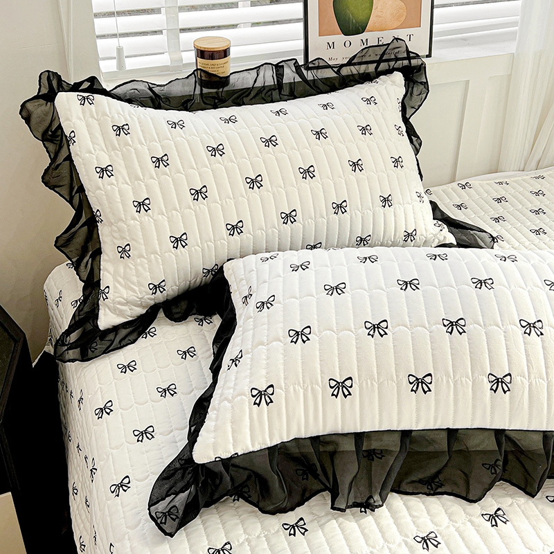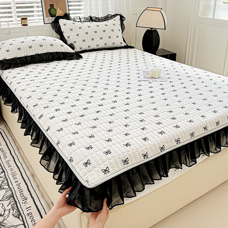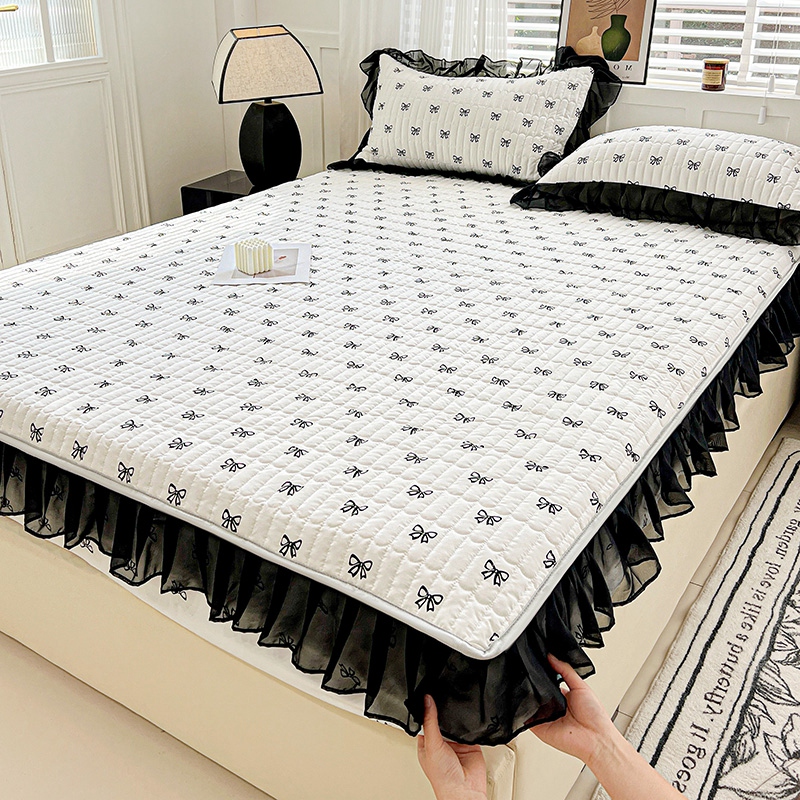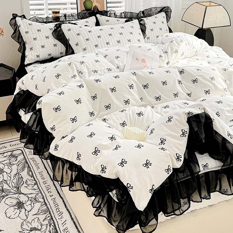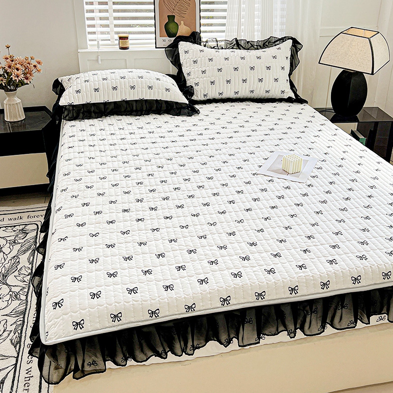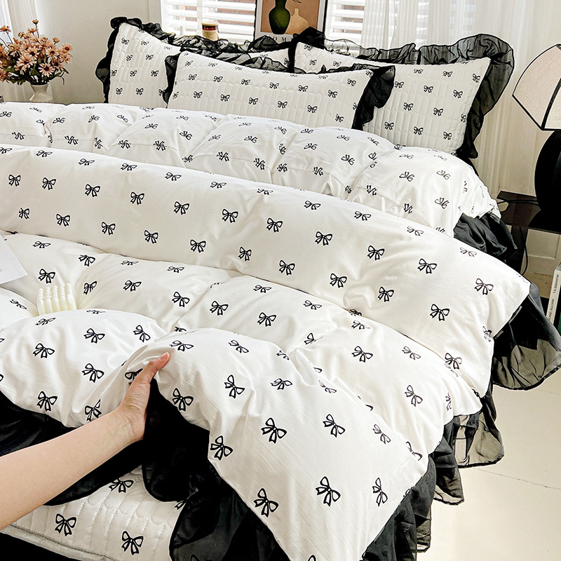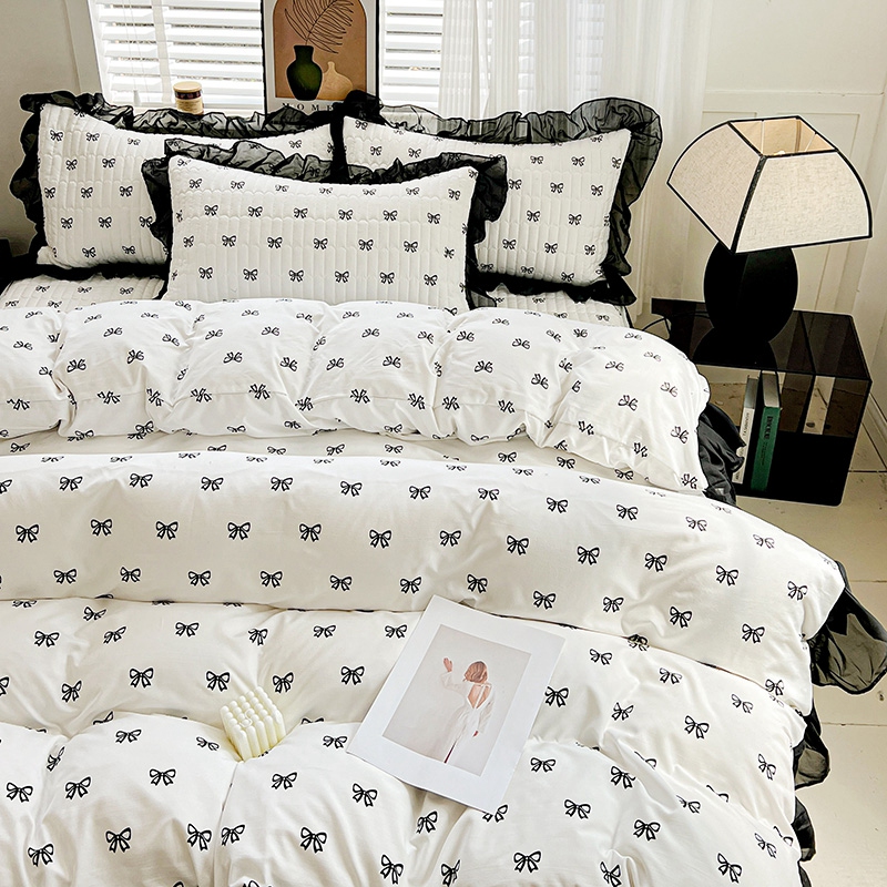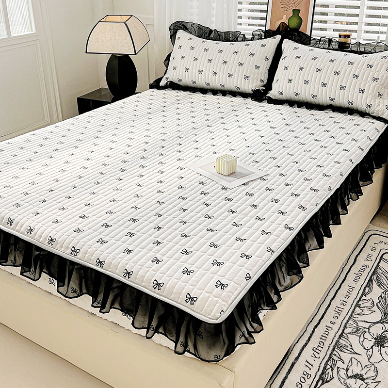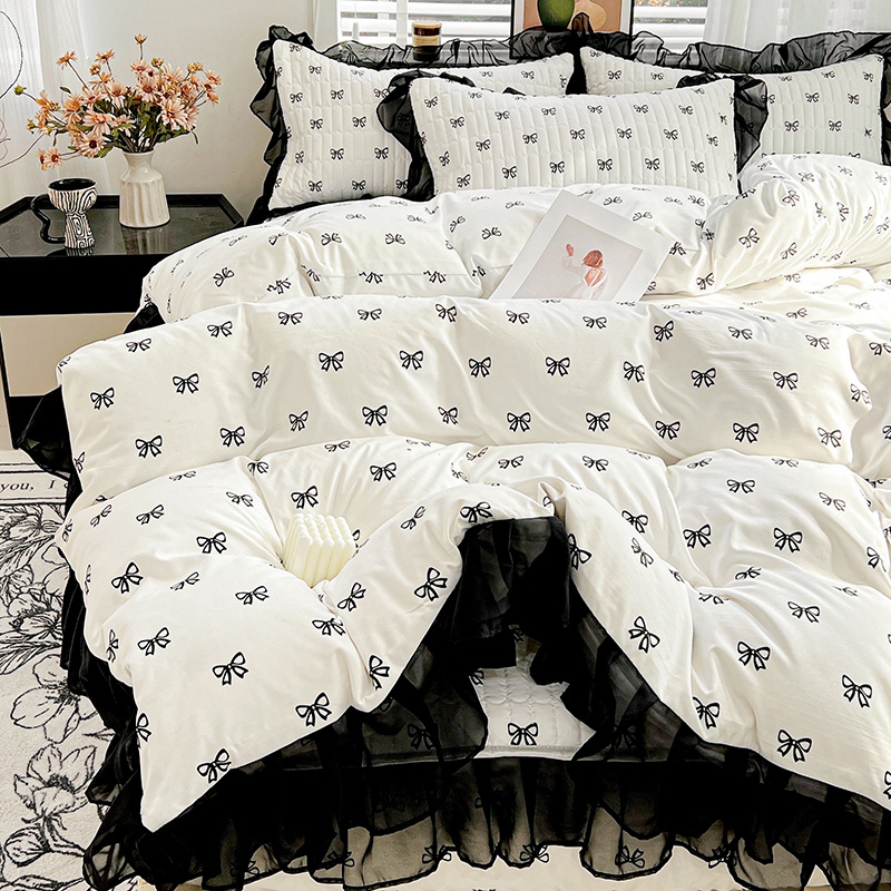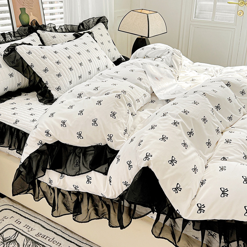 艾橙家纺2025新款法式赫本风水洗棉印花雪纺花边单床笠 黑色蝴蝶结
