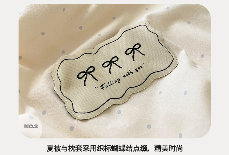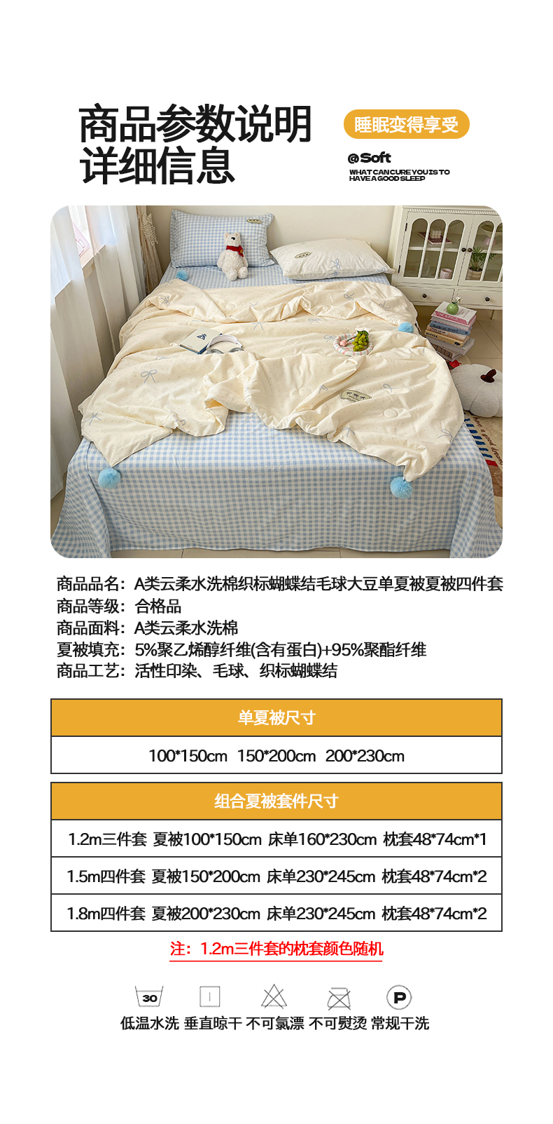 商品名称:桃心家居 2025新款A类ins云柔水洗棉大豆织标蝴蝶结毛球少女单夏被夏被四件套系列 清新梦蓝